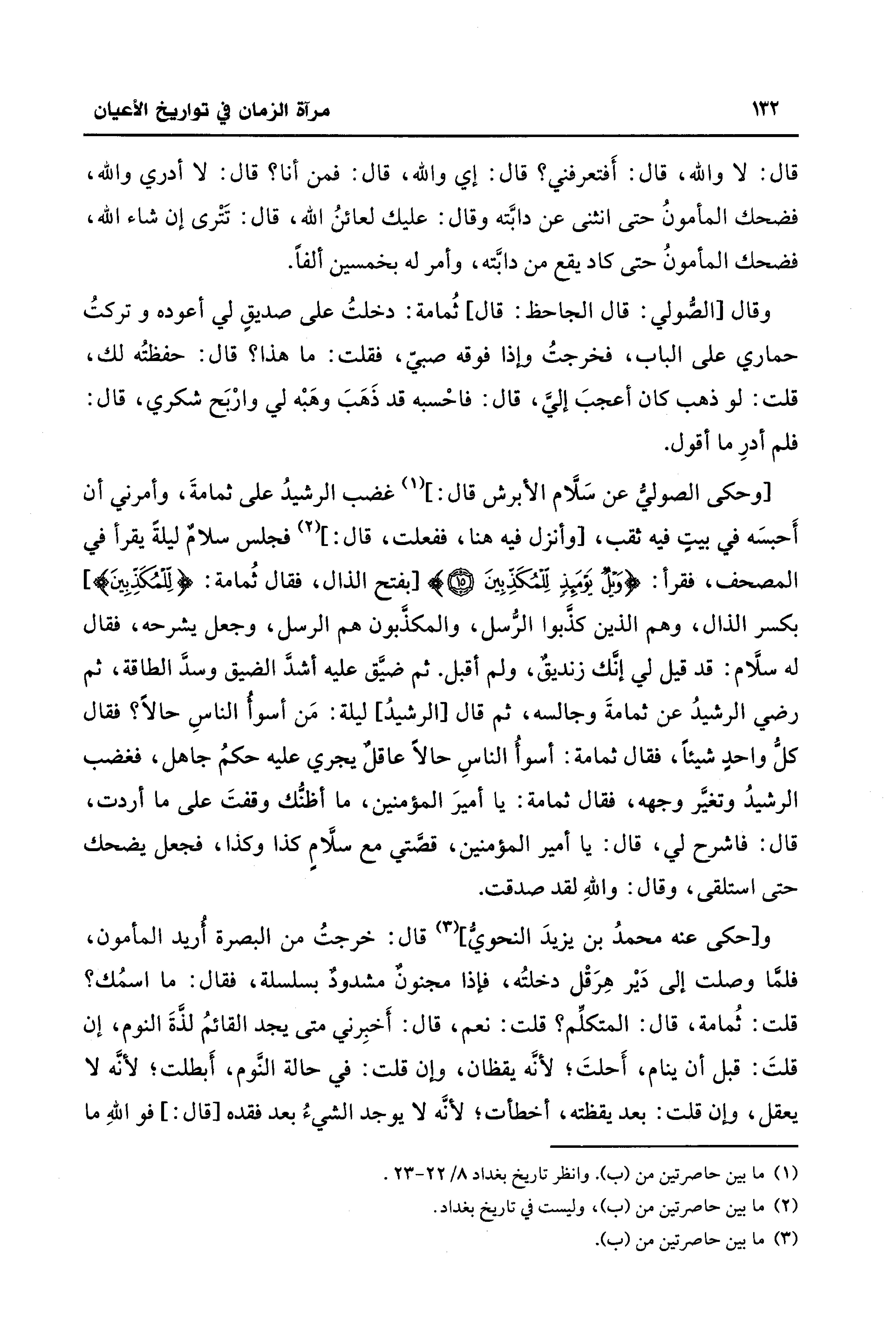 [وحكى الصوليُّ عن سَلَّام الأبرش قال: ] (¬1) غضب الرشيدُ على ثمامةَ، وأمرني أن أَحبسَه في بيتٍ فيه ثقب، [وأنزل فيه هنا، ففعلت، قال: ] (¬2) فجلس سلامٌ ليلةً يقرأ في المصحف، فقرأ: {وَيلٌ يَوْمَئِذٍ لِلْمُكَذِّبِينَ (15)} [بفتح الذال، فقال ثُمامة: {لِلْمُكَذِّبِينَ}] بكسر الذال، وهم الذين كذَّبوا الرُّسل، والمكذَّبون هم الرسل، وجعل يشرحه، فقال له سلَّام: قد قيل لي إنَّك زنديقٌ، ولم أقبل. ثم ضيَّق عليه أشدَّ الضيق وسدَّ الطاقة، ثم رضي الرشيدُ عن ثمامةَ وجالسه، ثم قال [الرشيدُ] ليلة: مَن أسوأُ الناسِ حالًا؟ فقال كلُّ واحدٍ شيئًا، فقال ثمامة: أسوأُ الناسِ حالًا عاقلٌ يجري عليه حكمُ جاهل، فغضب الرشيدُ وتغيَّر وجهه، فقال ثمامة: يا أميرَ المؤمنين، ما أظنُّك وقفتَ على ما أردت، قال: فاشرح لي، قال. يا أمير المؤمنين، قصَّتي مع سلَّامٍ كذا وكذا، فجعل يضحك حتى استلقى، وقال: واللهِ لقد صدقت.
