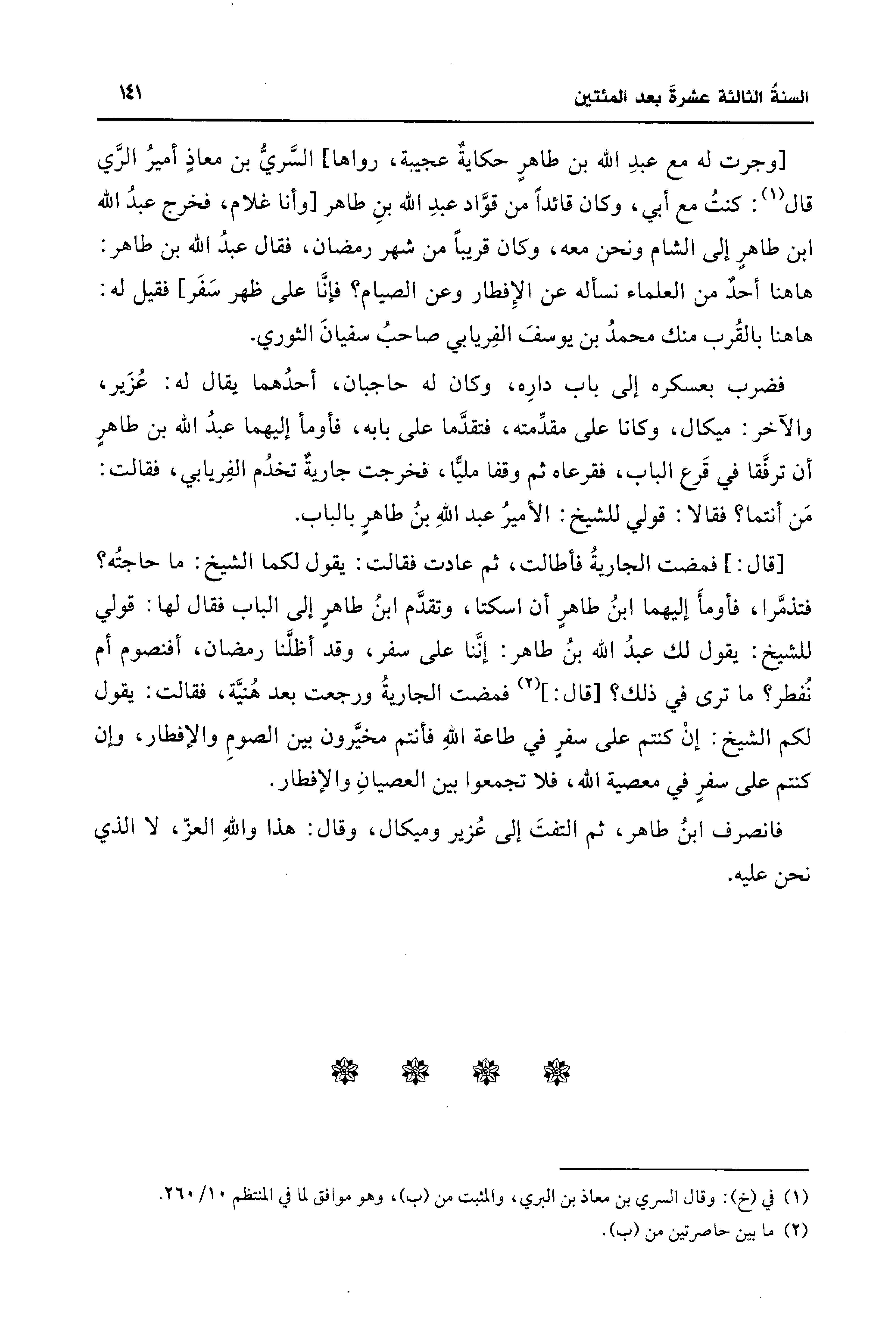 [قال: ] فمضت الجاريةُ فأطالت، ثمَّ عادت فقالت: يقول لكما الشيخ: ما حاجتُه؟ فتذمَّرا، فأومأَ إليهما ابنُ طاهرٍ أن اسكتا، وتقدَّم ابنُ طاهرٍ إلى الباب فقال لها: قولي للشيخ: يقول لك عبدُ الله بنُ طاهر: إنَّنا على سفر، وقد أظلَّنا رمضان، أفنصوم أم نُفطر؟ ما ترى في ذلك؟ [قال: ] (¬2) فمضت الجاريةُ ورجعت بعد هُنيَّة، فقالت: يقول لكم الشيخ: إنْ كنتم على سفرٍ في طاعة اللهِ فأنتم مخيَّرون بين الصومِ والإفطار، وإن كنتم على سفرٍ في معصية الله، فلا تجمعوا بين العصيانِ والإفطار.