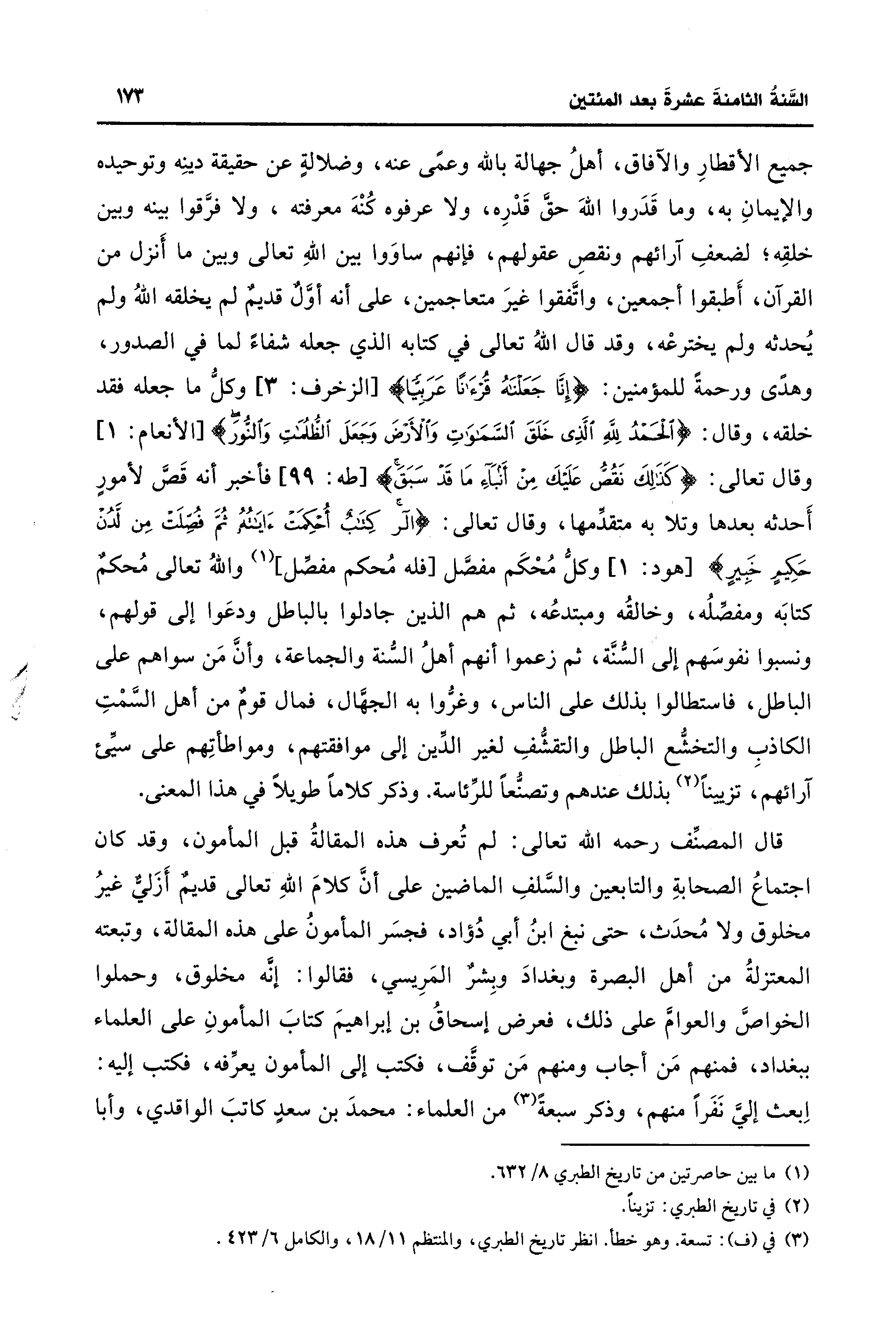 جميع الأقطارِ والآفاق، أهلُ جهالة بالله وعمًى عنه، وضلالةٍ عن حقيقة دينِه وتوحيده والإيمانِ به، وما قَدَروا اللهَ حقَّ قَدْرِه، ولا عرفوه كُنْهَ معرفته، ولا فرَّقوا بينه وبين خلقِه؛ لضعفِ آرائهم ونقصِ عقولهم، فإنهم ساوَوا بين اللهِ تعالى وبين ما أَنزل من القرآن، أَطبقوا أجمعين، واتَّفقوا غيرَ متعاجمين، على أنَّه أوَّلٌ قديمٌ لم يخلقه اللهُ ولم يُحدثه ولم يخترعْه، وقد قال اللهُ تعالى في كتابه الذي جعله شفاءً لما في الصدور، وهدىً ورحمةً للمؤمنين: {إِنَّا جَعَلْنَاهُ قُرْآنًا عَرَبِيًّا} [الزخرف: 3] وكلُّ ما جعله فقد خلقه، وقال: {الْحَمْدُ لِلَّهِ الَّذِي خَلَقَ السَّمَاوَاتِ وَالْأَرْضَ وَجَعَلَ الظُّلُمَاتِ وَالنُّورَ} [الأنعام: 1] وقال تعالى: {كَذَلِكَ نَقُصُّ عَلَيكَ مِنْ أَنْبَاءِ مَا قَدْ سَبَقَ} [طه: 99] فأخبر أنَّه قَصَّ لأمورٍ أَحدثه بعدها وتلا به متقدِّمها، وقال تعالى: {الر كِتَابٌ أُحْكِمَتْ آيَاتُهُ ثُمَّ فُصِّلَتْ مِنْ لَدُنْ حَكِيمٍ خَبِيرٍ} [هود: 1] وكلُّ مُحْكَم مفصَّل [فله مُحكم مفصِّل] (¬1) واللهُ تعالى مُحكمٌ كتابَه ومفصِّلُه، وخالقُه ومبتدعُه، ثمَّ هم الذين جادلوا بالباطل ودعَوا إلى قولهم، ونسبوا نفوسَهم إلى السُّنَّة، ثمَّ زعموا أنهم أهلُ السُّنة والجماعة، وأنَّ مَن سواهم على الباطل، فاستطالوا بذلك على الناس، وغرُّوا به الجهَّال، فمال قومٌ من أهل السَّمْتِ الكاذبِ والتخشُّع الباطل والتقشُّفِ لغير الدِّين إلى موافقتهم، ومواطأتِهم على سيِّئ آرائهم، تزيينًا (¬2) بذلك عندهم وتصنُّعًا للرِّئاسة. وذكر كلامًا طويلًا في هذا المعنى.