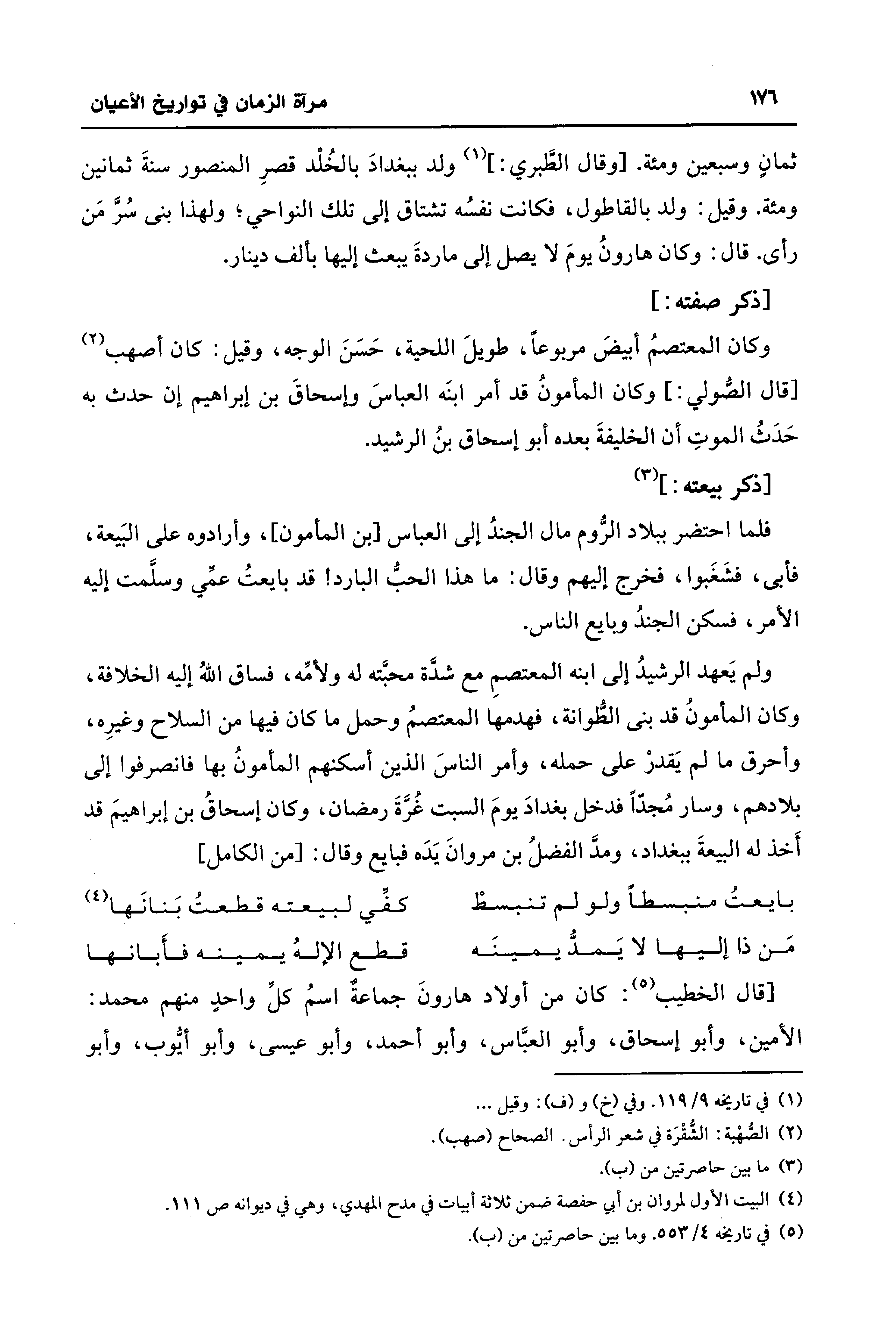 ولم يَعهد الرشيدُ إلى ابنه المعتصمِ مع شدَّة محبَّته له ولأمِّه، فساق اللهُ إليه الخلافة، وكان المأمونُ قد بني الطُّوانة، فهدمها المعتصمُ وحمل ما كان فيها من السلاح وغيرِه، وأحرق ما لم يَقدرْ على حمله، وأمر الناسَ الذين أسكنهم المأمونُ بها فانصرفوا إلى بلادهم، وسار مُجدًّا فدخل بغدادَ يومَ السبت غُرَّةَ رمضان، وكان إسحاقُ بن إبراهيمَ قد أَخذ له البيعةَ ببغداد، ومدَّ الفضلُ بن مروانَ يَدَه فبايع وقال: [من الكامل]