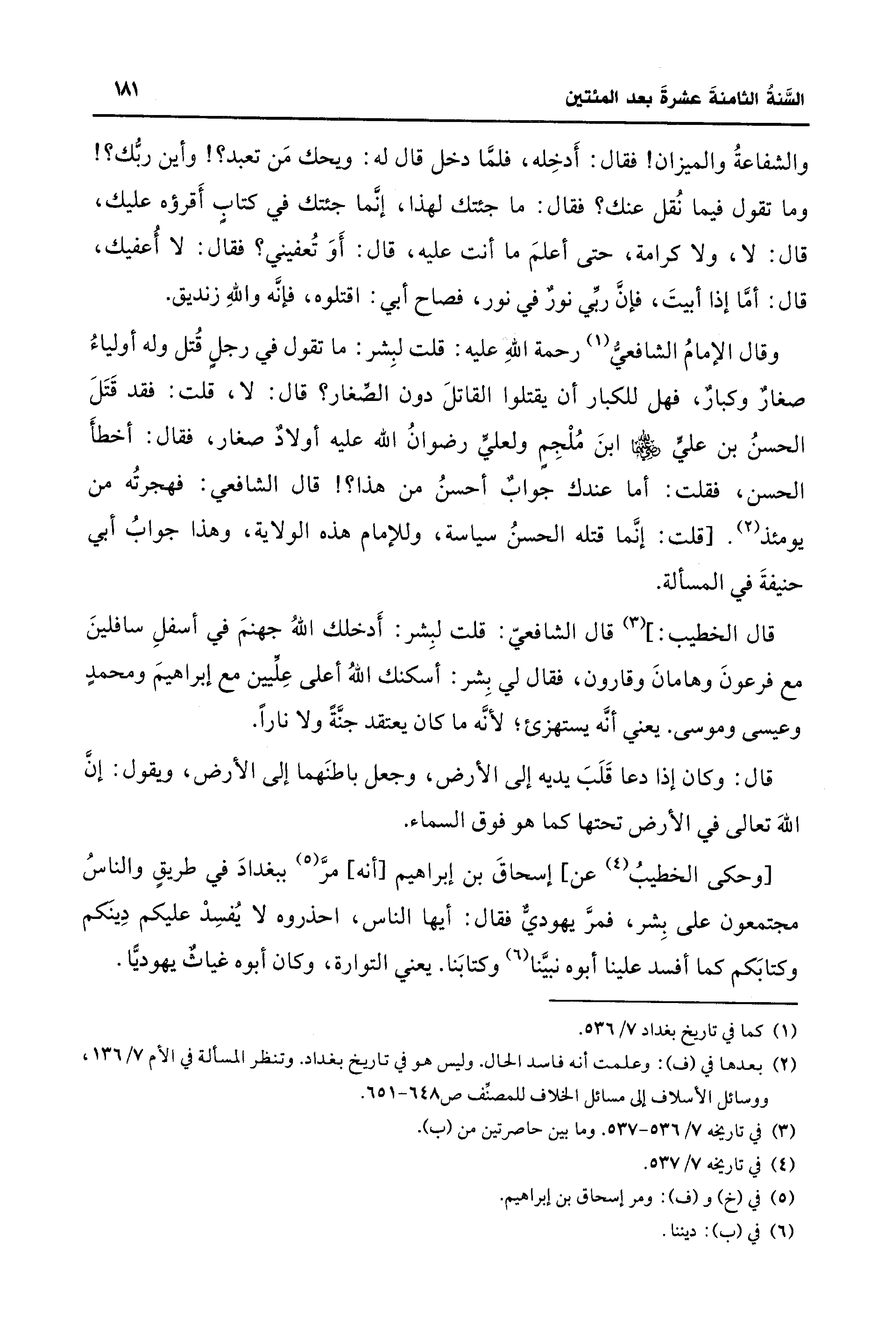 قال الخطيب: ] (¬3) قال الشافعيّ: قلت لبِشر: أَدخلك اللهُ جهنمَ في أسفلِ سافلينَ مع فرعونَ وهامانَ وقارون، فقال لي بِشر: أسكنك اللهُ أعلى عِلِّيين مع إبراهيمَ ومحمدٍ وعيسى وموسى. يعني أنَّه يستهزئ؛ لأنَّه ما كان يعتقد جنَّةً ولا نارًا.