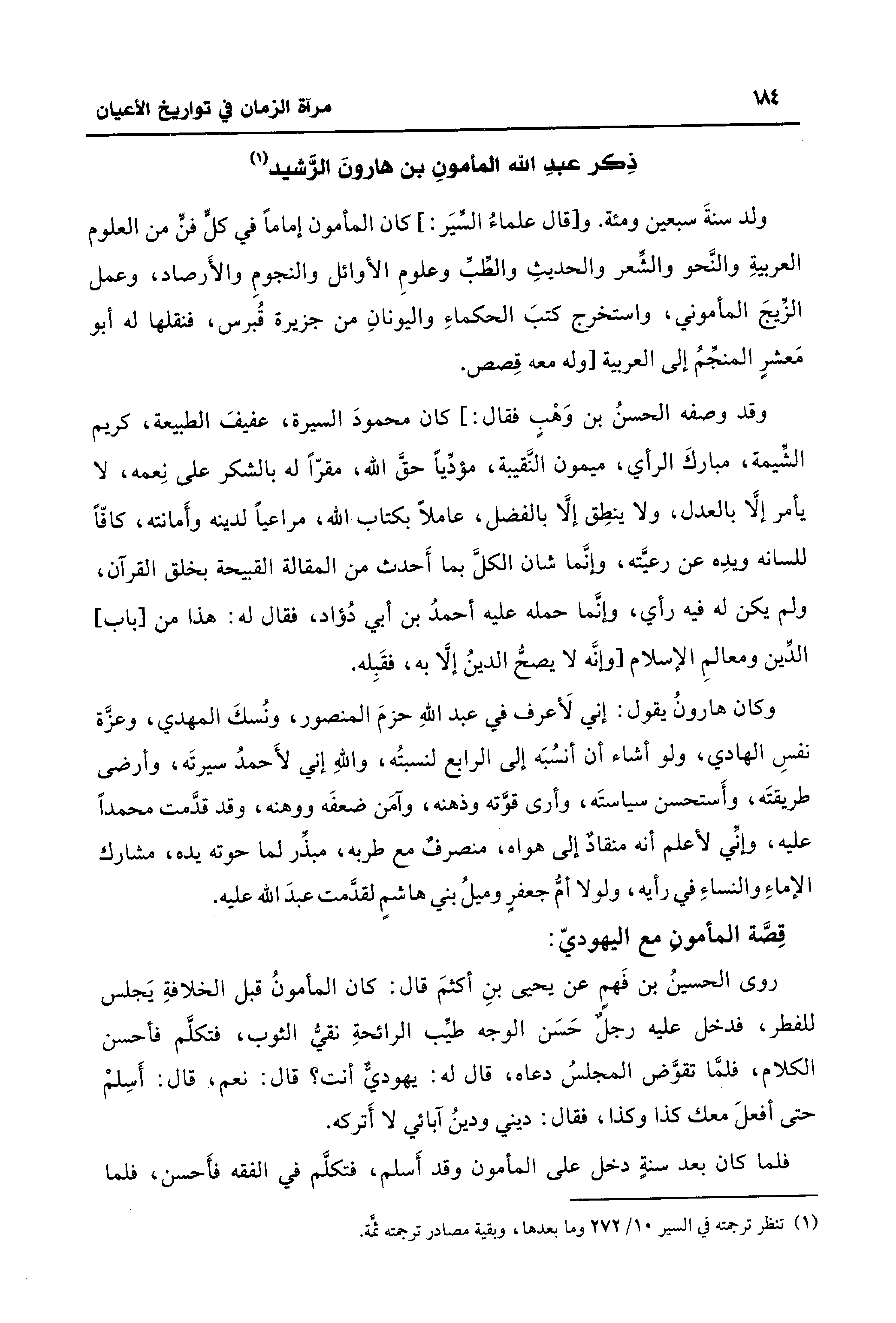 ولد سنةَ سبعين ومئة. و [قال علماءُ السِّيَر: ] كان المأمون إمامًا في كلِّ فنٍّ من العلوم العربيةِ والنَّحو والشِّعر والحديثِ والطِّبِّ وعلومِ الأوائل والنجومِ والأَرصاد، وعمل الزِّيجَ المأموني، واستخرج كتبَ الحكماءِ واليونانِ من جزيرة قُبرس، فنقلها له أبو مَعشرٍ المنجِّمُ إلى العربية [وله معه قِصص.