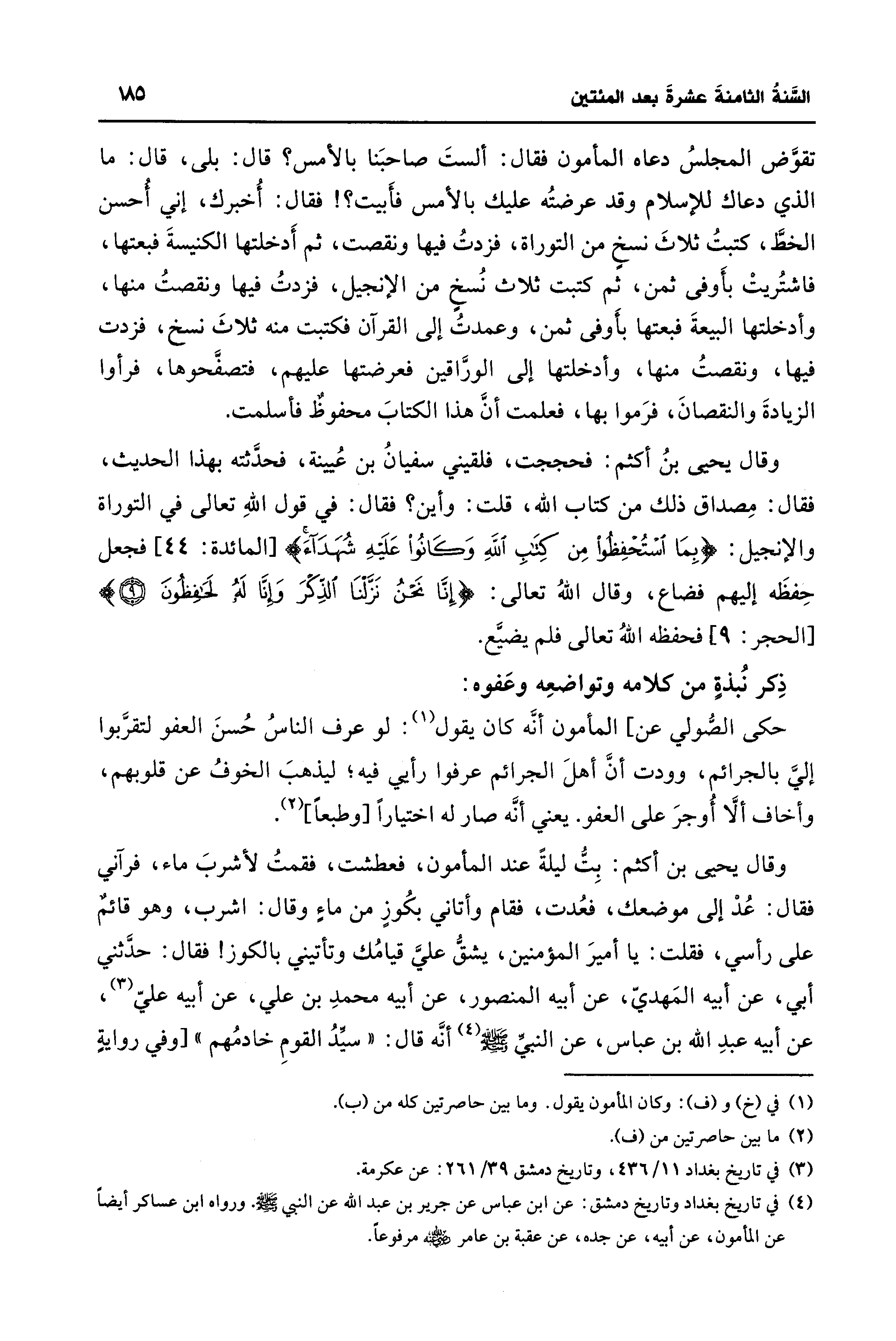 وقال يحيى بنُ أكثم: فحججت، فلقيني سفيانُ بن عُيينة، فحدَّثته بهذا الحديث، فقال: مِصداق ذلك من كتاب الله، قلت: وأين؟ فقال: في قول اللهِ تعالى في التوراة والإنجيل: {بِمَا اسْتُحْفِظُوا مِنْ كِتَابِ اللَّهِ وَكَانُوا عَلَيهِ شُهَدَاءَ} [المائدة: 44] فجعل حِفظَه إليهم فضاع، وقال اللهُ تعالى: {إِنَّا نَحْنُ نَزَّلْنَا الذِّكْرَ وَإِنَّا لَهُ لَحَافِظُونَ} [الحجر: 9] فحفظه اللهُ تعالى فلم يضيَّع.