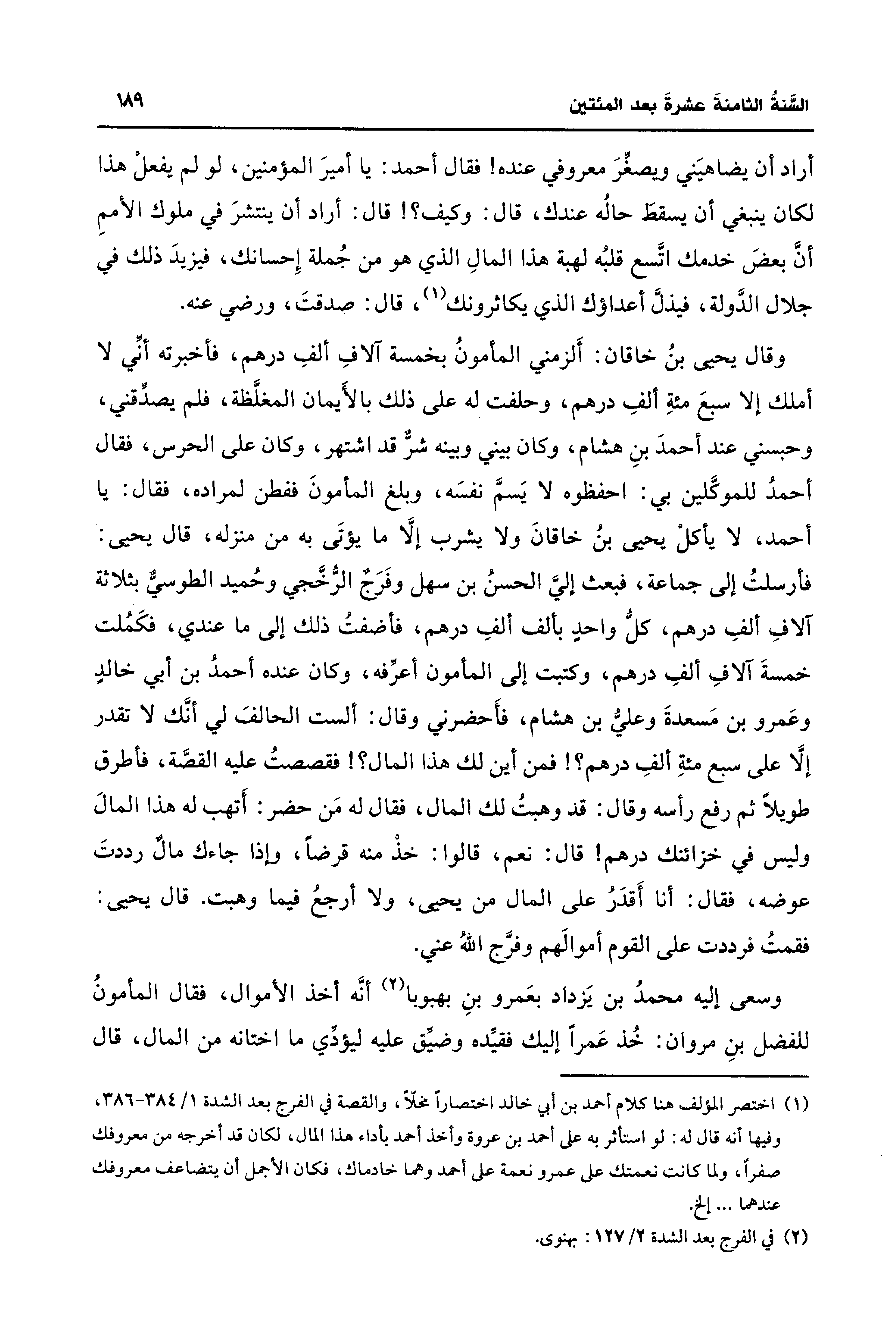 (¬1) اختصر المؤلف هنا كلام أحمد بن أبي خالد اختصارًا مخلًّا، والقصة في الفرج بعد الشدة 1/ 384 - 386، وفيها أنَّه قال له: لو استأثر به على أحمد بن عروة وأخذ أحمد بأداء هذا المال، لكان قد أخرجه من معروفك صفرًا، ولما كانت نعمتك على عمرو نعمة على أحمد وهما خادماك، فكان الأجمل أن يتضاعف معروفك عندهما. . ." إلخ.