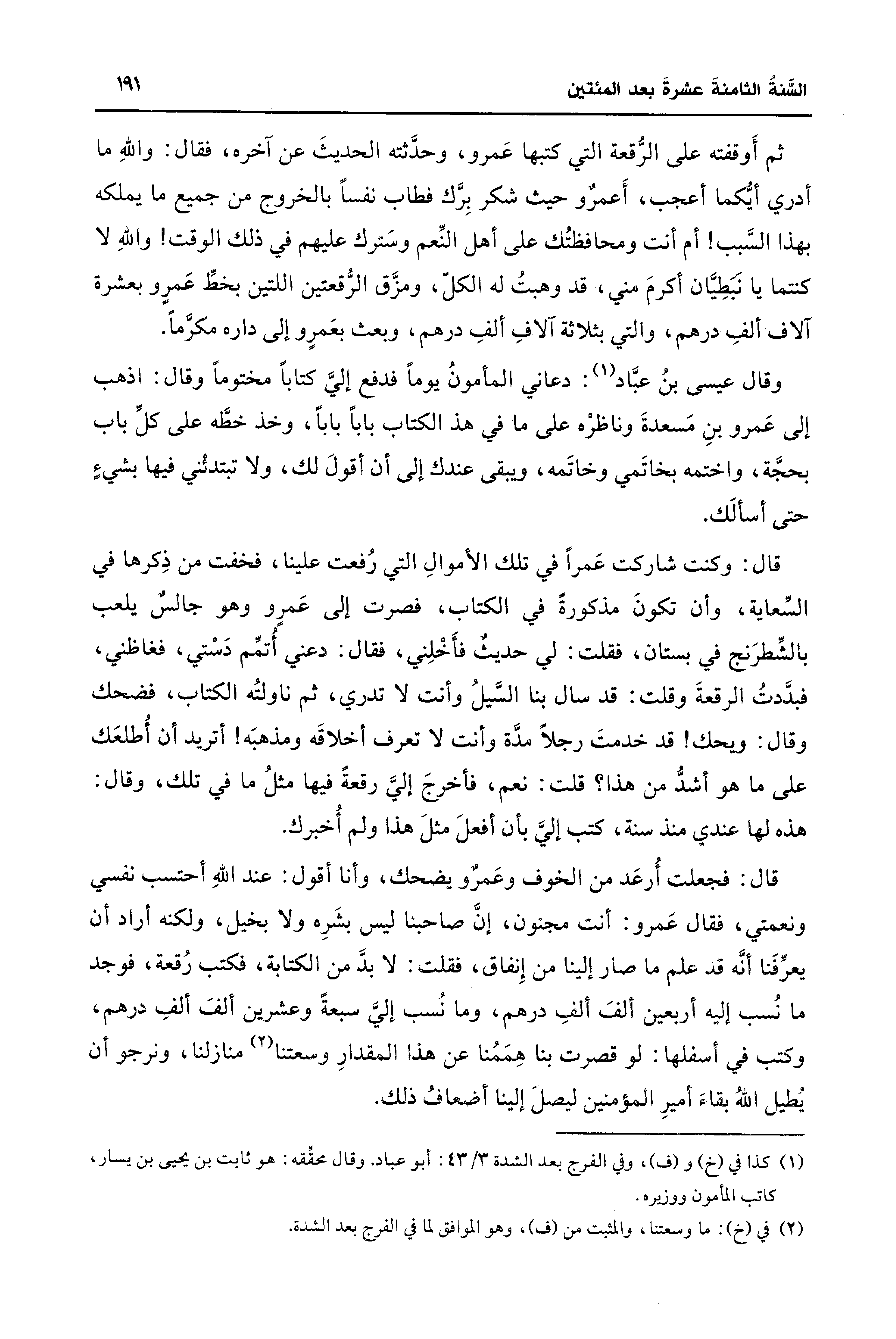 ثم أَوقفته على الرُّقعة التي كتبها عَمرو، وحدَّثته الحديثَ عن آخره، فقال: واللهِ ما أدري أيُّكما أعجب، أَعمرٌو حيث شكر بِرَّك فطاب نفسًا بالخروج من جميع ما يملكه بهذا السَّبب! أم أنت ومحافظتُك على أهل النِّعم وسَترك عليهم في ذلك الوقت! واللهِ لا كنتما يا نَبَطِيَّان أكرمَ مني، قد وهبتُ له الكلّ، ومزَّق الرُّقعتين اللتين بخطِّ عَمرٍو بعشرة آلاف ألفِ درهم، والتي بثلاثة آلافِ ألفِ درهم، وبعث بعَمرٍو إلى داره مكرَّمًا.