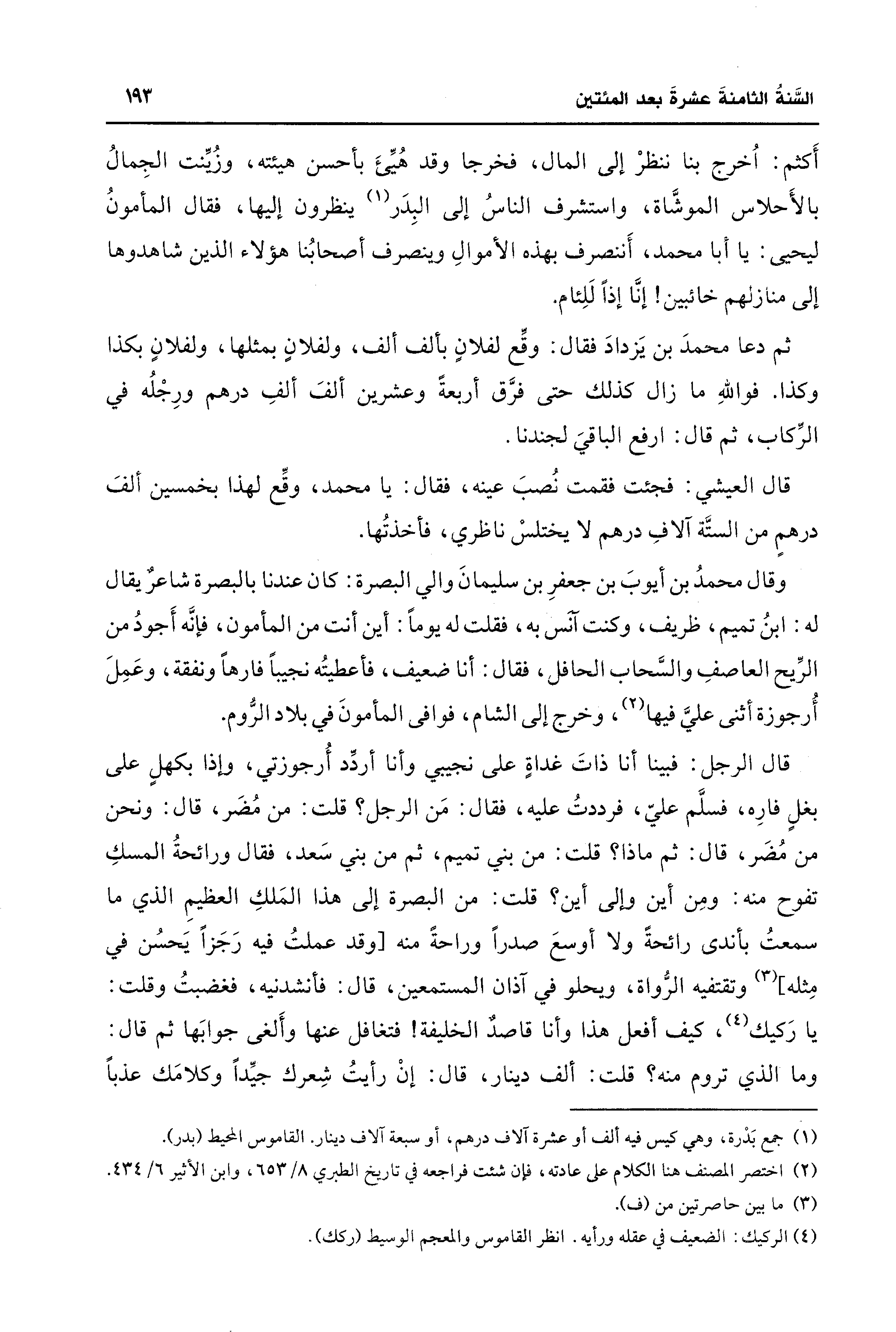 أَكثم: اُخرج بنا ننظرْ إلى المال، فخرجا وقد هُيِّئَ بأحسن هيئته، وزُّيِّنت الجِمالُ بالأَحلاس الموشَّاة، واستشرف الناسُ إلى البِدَر (¬1) ينظرون إليها، فقال المأمونُ ليحيى: يا أبا محمد، أَننصرف بهذه الأموالِ وينصرف أصحابُنا هؤلاء الذين شاهدوها إلى منازلهم خائبين! إنَّا إذًا لَلِئام.