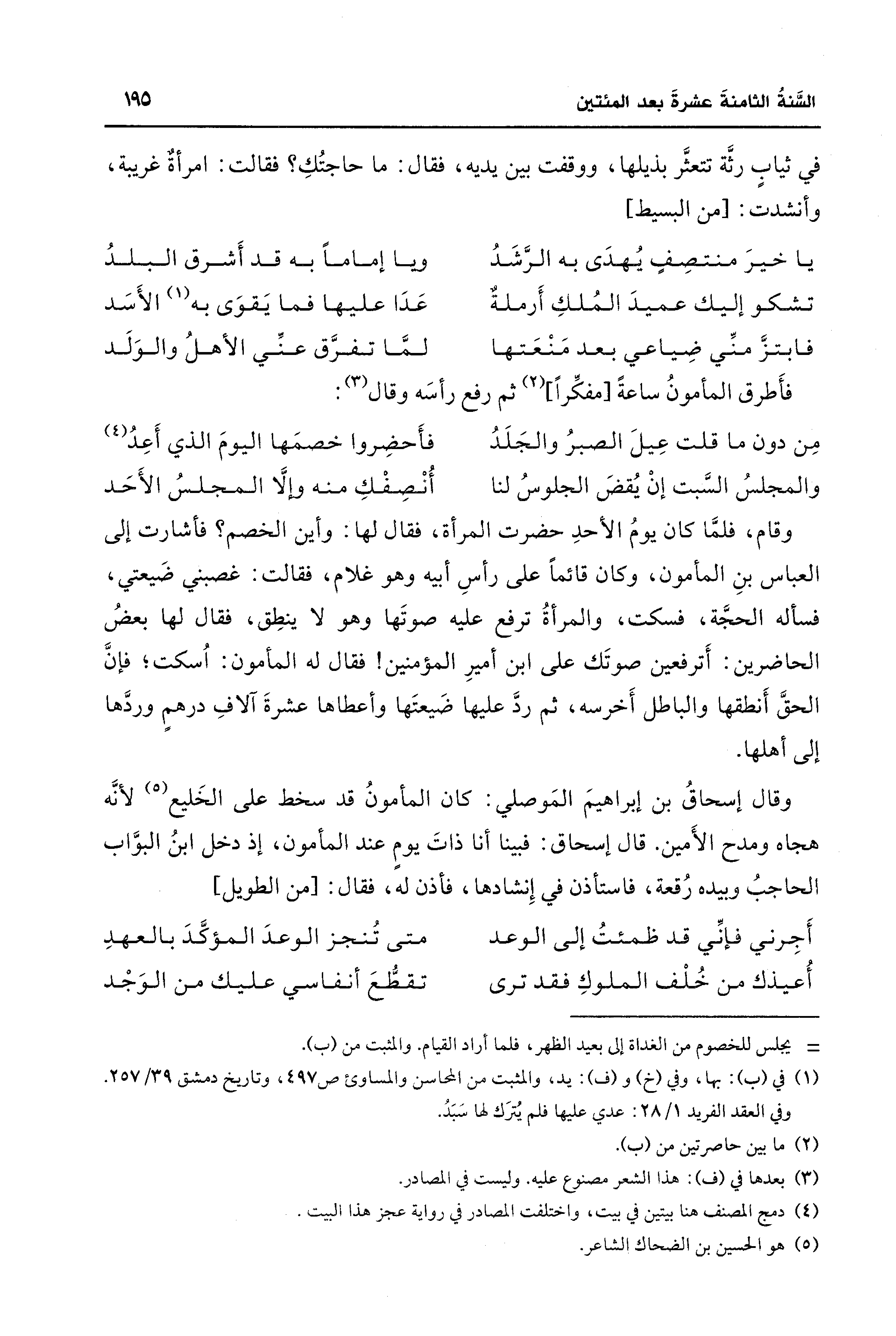 وقام، فلمَّا كان يومُ الأحدِ حضرت المرأة، فقال لها: وأين الخصم؟ فأشارت إلى العباس بنِ المأمون، وكان قائمًا على رأسِ أبيه وهو غلام، فقالت: غصبني ضَيعتي، فسأله الحجَّة، فسكت، والمرأةُ ترفع عليه صوتَها وهو لا ينطِق، فقال لها بعضُ الحاضرين: أَترفعين صوتَك على ابن أميرِ المؤمنين! فقال له المأمون: اُسكت؛ فإنَّ الحقَّ أَنطقها والباطل أَخرسه، ثم ردَّ عليها ضَيعتَها وأعطاها عشرةَ آلافِ درهمٍ وردَّها إلى أهلها.
