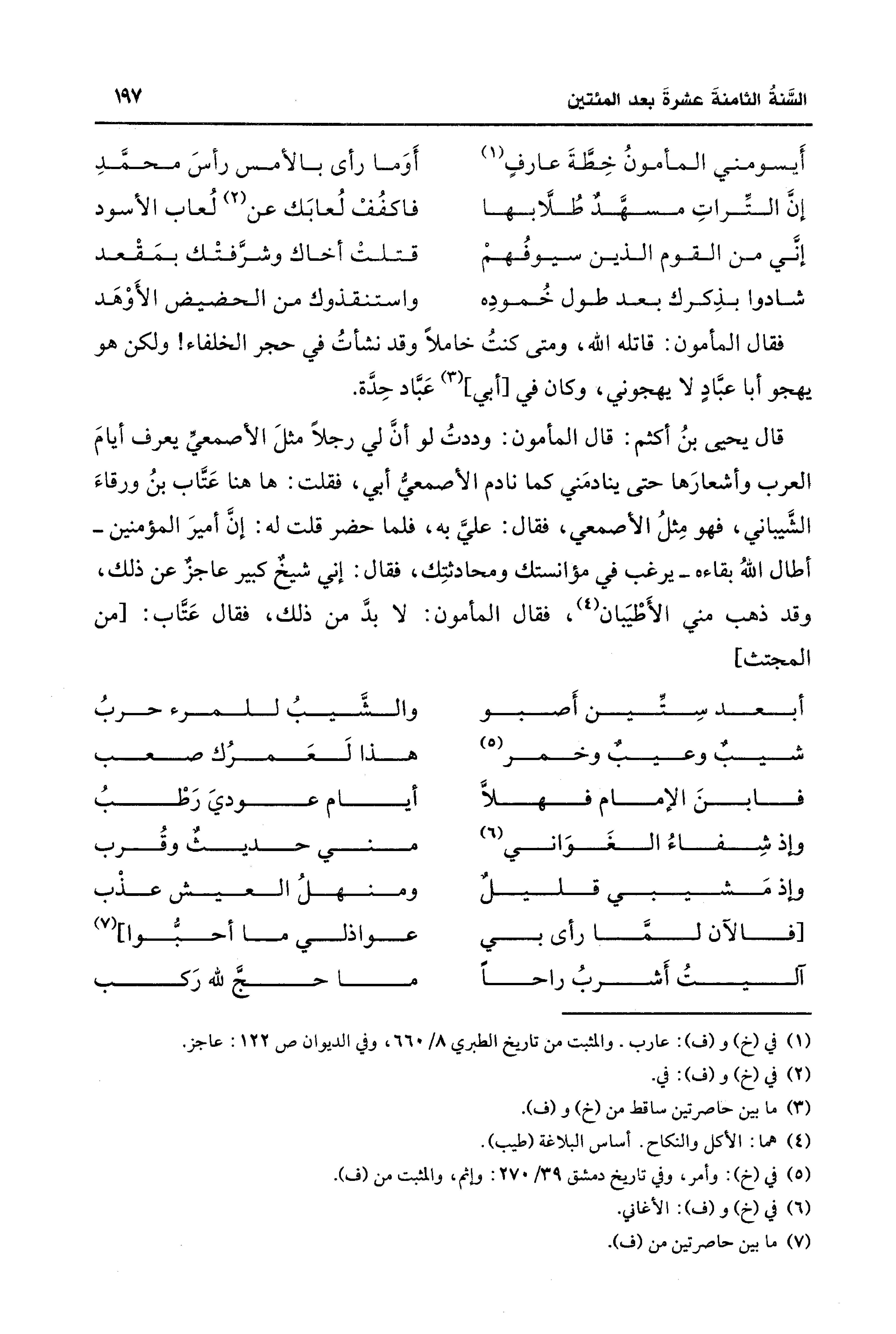 قال يحيى بنُ أكثم: قال المأمون: وددتُ لو أنَّ لي رجلًا مثلَ الأصمعيِّ يعرف أيامَ العرب وأشعارَها حتَّى ينادمَني كما نادم الأصمعيُّ أبي، فقلت: ها هنا عَتَّاب بنُ ورقاءَ الشَّيباني، فهو مِثلُ الأصمعي، فقال: عليَّ به، فلما حضر قلت له: إنَّ أميرَ المؤمنين -أطال اللهُ بقاءه- يرغب في مؤانستك ومحادثتِك، فقال: إني شيخٌ كبير عاجزٌ عن ذلك، وقد ذهب مني الأَطْيَبان (¬4)، فقال المأمون: لا بدَّ من ذلك، فقال عَتَّاب: [من المجتث]