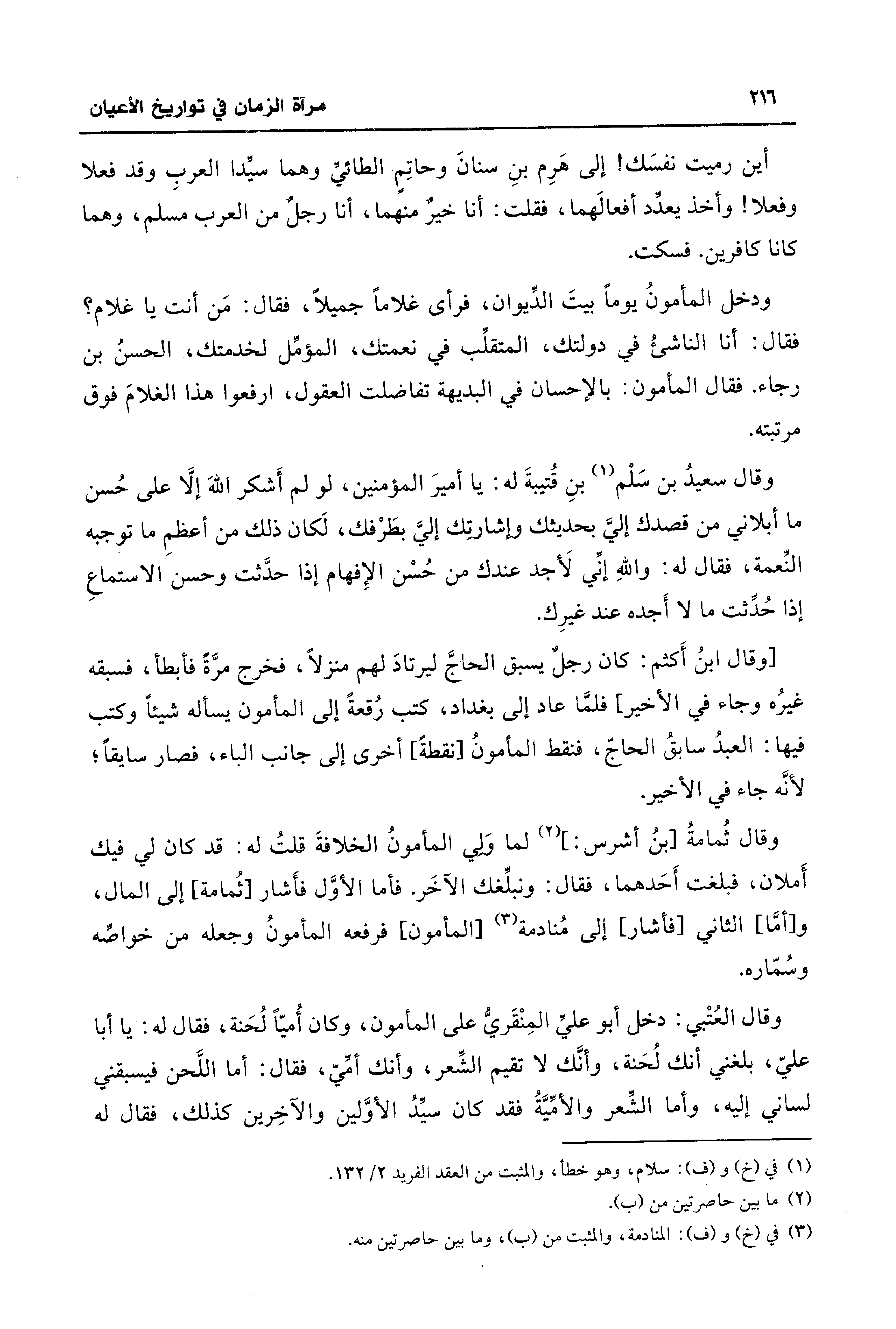 أين رميت نفسَك! إلى هَرِم بن سنانَ وحاتِمٍ الطائيِّ وهما سيِّدا العربِ وقد فعلا وفعلا! وأخذ يعدِّد أفعالهما، فقلت: أنا خيرٌ منهما، أنا رجل من العرب مسلم، وهما كانا كافرين. فسكت.