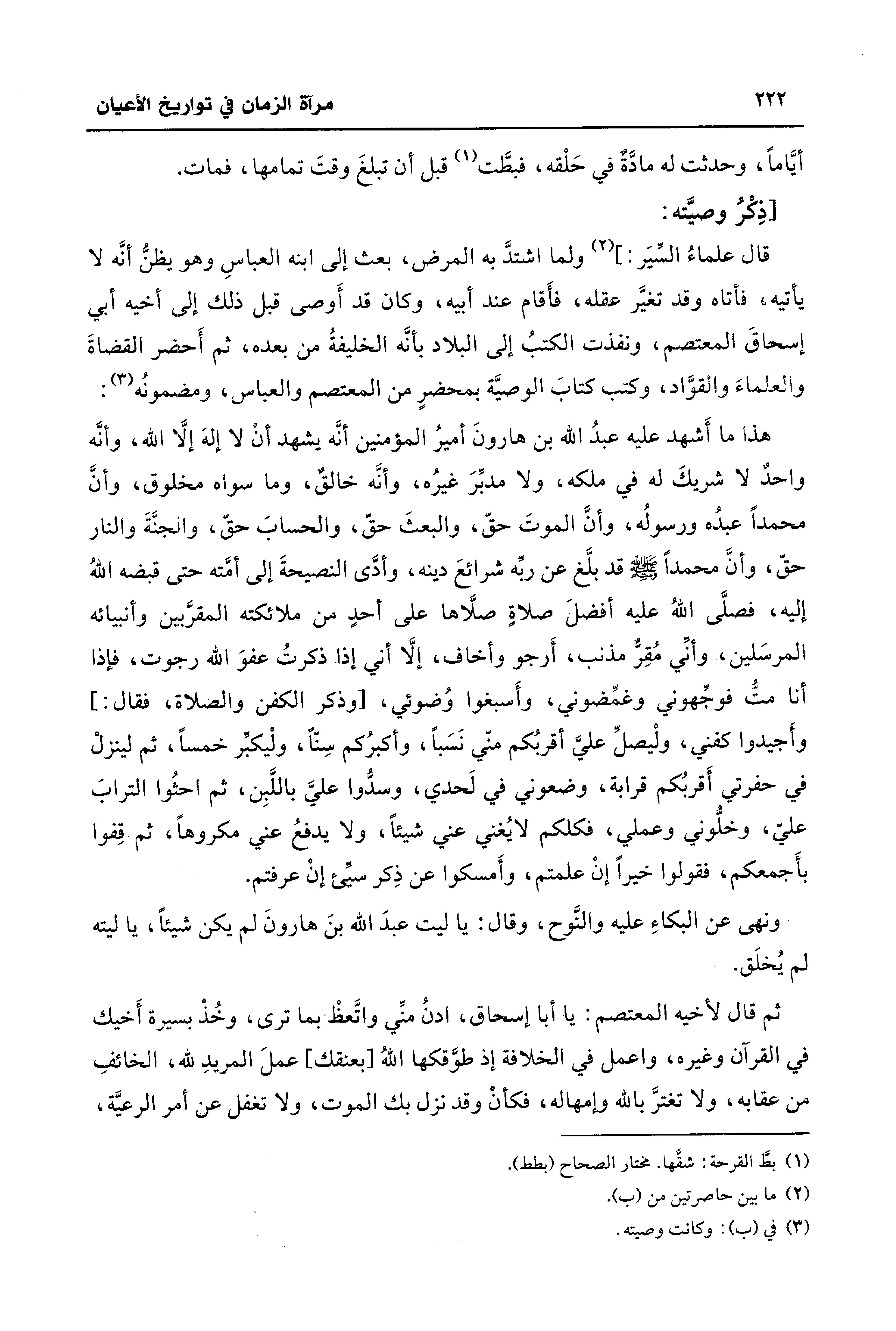 هذا ما أَشهد عليه عبدُ الله بن هارونَ أميرُ المؤمنين أنَّه يشهد أنْ لا إلهَ إلَّا الله، وأنَّه واحدٌ لا شريكَ له في ملكه، ولا مدبِّرَ غيرُه، وأنَّه خالقٌ، وما سواه مخلوق، وأنَّ محمدًا عبدُه ورسولُه، وأن الموتَ حقّ، والبعثَ حقّ، والحسابَ حقّ، والجنَّةَ والنار حقّ، وأنَّ محمدًا - صلى الله عليه وسلم - قد بلَّغ عن ربِّه شرائعَ دينه، وأدَّى النصيحةَ إلى أمَّته حتى قبضه اللهُ إليه، فصلَّى اللهُ عليه أفضلَ صلاةٍ صلَّاها على أحدٍ من ملائكته المقرَّبين وأنبيائه المرسَلين، وأنِّي مُقِرٌّ مذنب، أَرجو وأخاف، إلَّا أني إذا ذكرتُ عفوَ الله رجوت، فإذا أنا متُّ فوجِّهوني وغمِّضوني، وأَسبغوا وُضوئي، [وذكر الكفن والصلاة، فقال: ] وأَجيدوا كفني، ولْيصلِّ عليَّ أقربُكم منّي نَسَبًا، وأكبرُكم سِنًّا، ولْيكبِّر خمسًا، ثم لينزلْ في حفرتي أَقربُكم قرابة، وضعوني في لَحدي، وسدُّوا عليَّ باللَّبِن، ثم احثُوا الترابَ عليّ، وخلُّوني وعملي، فكلكم لا يُغني عني شيئًا، ولا يدفعُ عني مكروهًا، ثم قِفوا بأَجمعكم، فقولوا خيرًا إنْ علمتم، وأَمسكوا عن ذِكر سيِّئَ إنْ عرفتم.