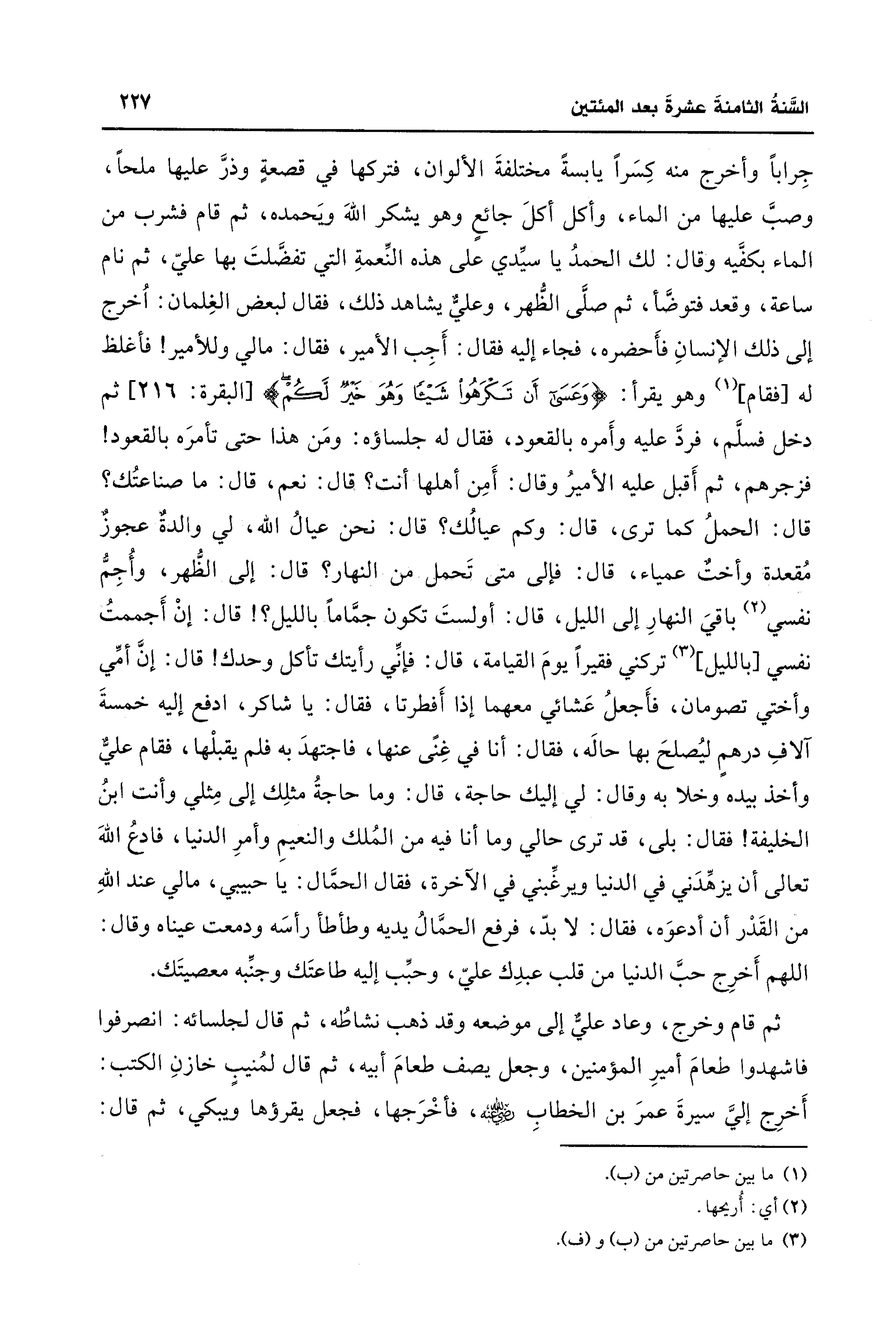 جِرابًا وأخرج منه كِسَرًا يابسةً مختلفةَ الألوان، فتركها في قصعةٍ وذرَّ عليها ملحًا، وصبَّ عليها من الماء، وأكل أكلَ جائعٍ وهو يشكر اللهَ ويَحمده، ثم قام فشرب من الماء بكفَّيه وقال: لك الحمدُ يا سيِّدي على هذه النِّعمةِ التي تفضَّلتَ بها عليّ، ثم نام سماعة، وقعد فتوضَّأْ، ثم صلَّى الظُّهر، وعليٌّ يشاهد ذلك، فقال لبعض الغِلمان: اُخرج إلى ذلك الإنسانِ فأَحضره، فجاء إليه فقال: أَجِب الأمير، فقال: ما لي وللأمير! فأغلظ له [فقام] (¬1) وهو يقرأ: {وَعَسَى أَنْ تَكْرَهُوا شَيئًا وَهُوَ خَيرٌ لَكُمْ} [البقرة: 216] ثم دخل فسلَّم، فردَّ عليه وأَمره بالقعود، فقال له جلساؤه: ومَن هذا حتَّى تأمرَه بالقعود! فزجرهم، ثم أَقبل عليه الأميرُ وقال: أَمِن أهلها أنت؟ قال: نعم، قال: ما صناعتُك؟ قال: الحملُ كما ترى، قال: وكم عيالُك؟ قال: نحن عيالُ الله، لي والدةٌ عجوزٌ مُقعدة وأختٌ عمياء، قال: فإلى متى تَحمك من النهار؟ قال: إلى الظُّهر، وأُجِمُّ نفسي (¬2) باقيَ النهارِ إلى الليل، قال: أولستَ تكون جمَّامًا بالليل؟ ! قال: إنْ أَجممتُ نفسي [بالليل] (¬3) تركني فقيرًا يومَ القيامة، قال: فإنِّي رأيتك تأكل وحدك! قال: إنَّ أمِّي وأختي تصومان، فأَجعلُ عَشائي معهما إذا أَفطرتا، فقال: يا شاكر، ادفع إليه خمسةَ آلافِ درهمٍ ليُصلحَ بها حاله، فقال: أنا في غِنًى عنها، فاجتهدَ به فلم يقبلْها، فقام عليٌّ وأخذ بيده وخلا به وقال: لي إليك حاجة، قال: وما حاجةُ مثلِك إلى مِثلي وأنت ابنُ الخليفة! فقال: بلى، قد ترى حالي وما أنا فيه من المُلك والنعيمِ وأمرِ الدنيا، فادعُ اللهَ تعالى أن يزهِّدَني في الدنيا ويرغِّبني في الآخرة، فقال الحمَّال: يا حبيبي، ما لي عند اللهِ من القَدْر أن أدعوَه، فقال: لا بدّ، فرفع الحمَّالُ يديه وطأطأ رأسَه ودمعت عيناه وقال: اللهم أَخرِج حبَّ الدنيا من قلب عبدِك عليّ، وحبِّب إليه طاعتَك وجنِّبه معصيتَك.