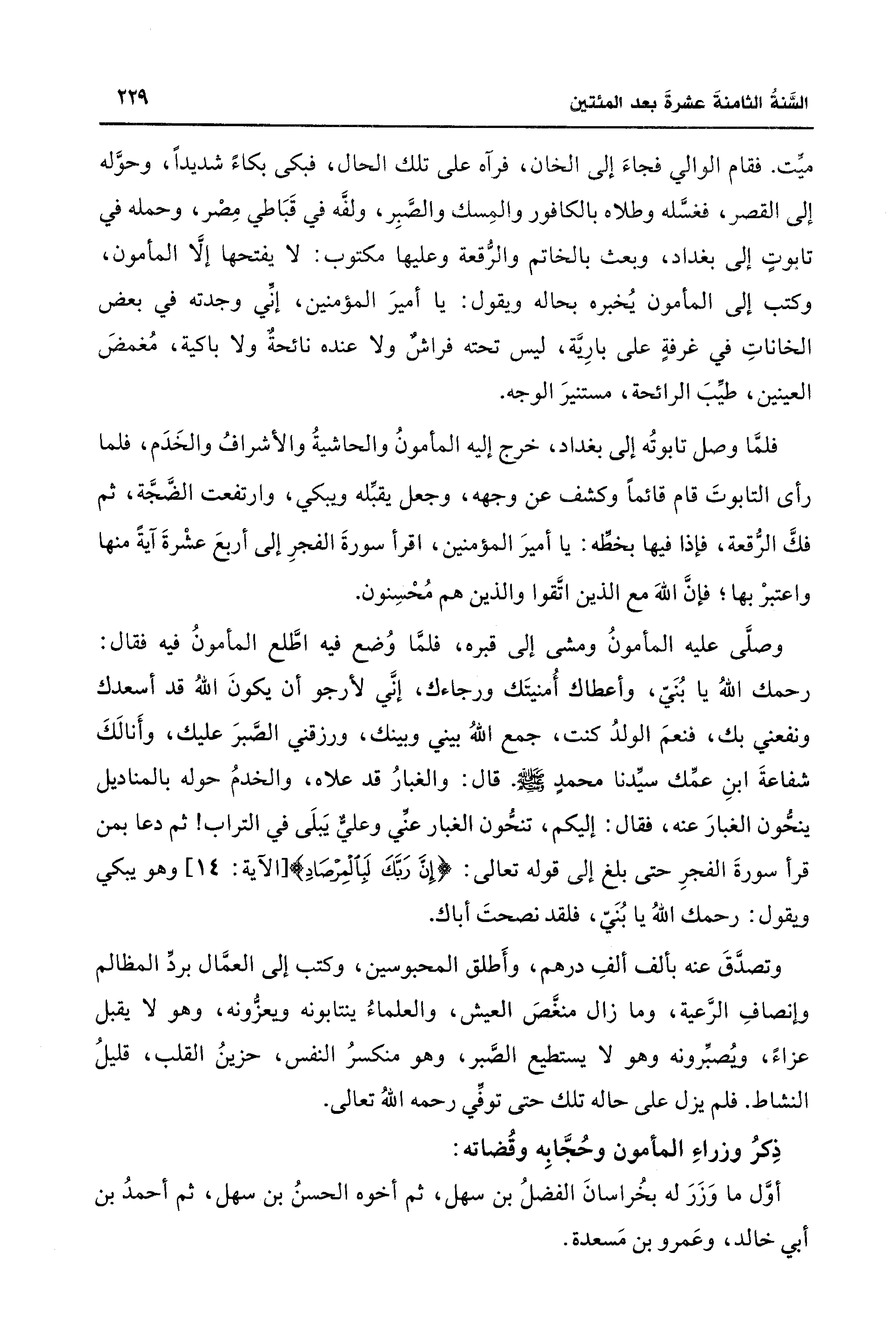 فلمَّا وصل تابوتُه إلى بغداد، خرج إليه المأمونُ والحاشيةُ والأشرافُ والخَدَم، فلما رأى التابوتَ قام قائمًا وكشف عن وجهه، وجعل يقبِّله ويبكي، وارتفعت الضَّجَّة، ثم فكَّ الرُّقعة، فإذا فيها بخطِّه: يا أميرَ المؤمنين، اقرأ سورةَ الفجرِ إلى أربعَ عشْرةَ آيةً منها واعتبرْ بها؛ فإنَّ اللهَ مع الذين اتَّقوا والذين هم مُحْسِنون.