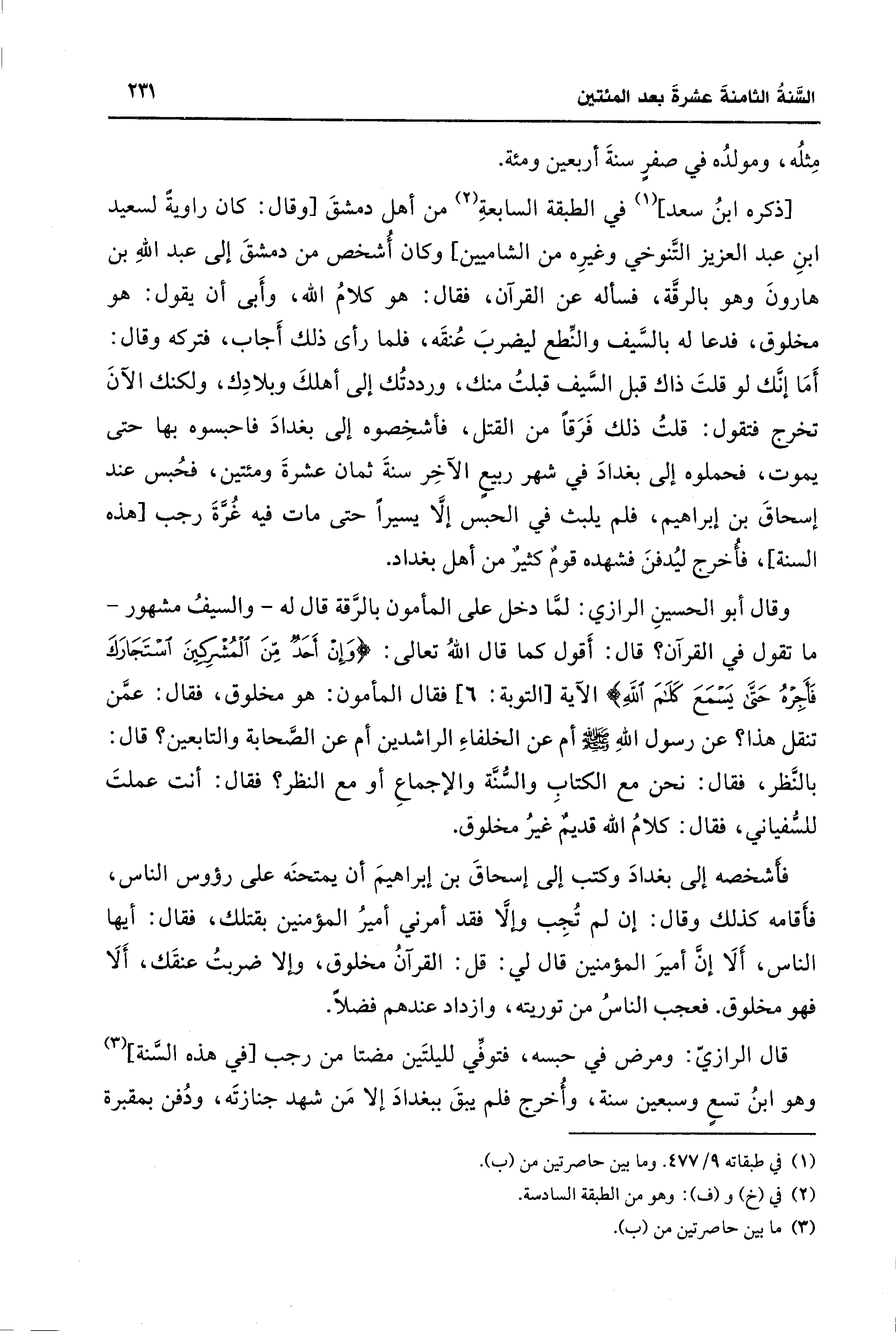 وقال أبو الحسينِ الرازي: لمَّا دخل على المأمون بالرَّقة قال له -والسيفُ مشهور- ما تقول في القرآن؟ قال: أَقول كما قال اللهُ تعالى: {وَإِنْ أَحَدٌ مِنَ الْمُشْرِكِينَ اسْتَجَارَكَ فَأَجِرْهُ حَتَّى يَسْمَعَ كَلَامَ اللَّهِ} [التوبة: 6]، فقال المأمون: هو مخلوق، فقال: عمَّن تنقل هذا؟ عن رسول اللهِ - صلى الله عليه وسلم - أم عن الخلفاءِ الراشدين أم عن الصَّحابة والتابعين؟ قال: بالنَّظر، فقال: نحن مع الكتابِ والسُّنَّة والإجماعِ أو مع النظر؟ فقال: أنت عملتَ للسُّفياني، فقال: كلامُ الله قديمٌ غيرُ مخلوق.