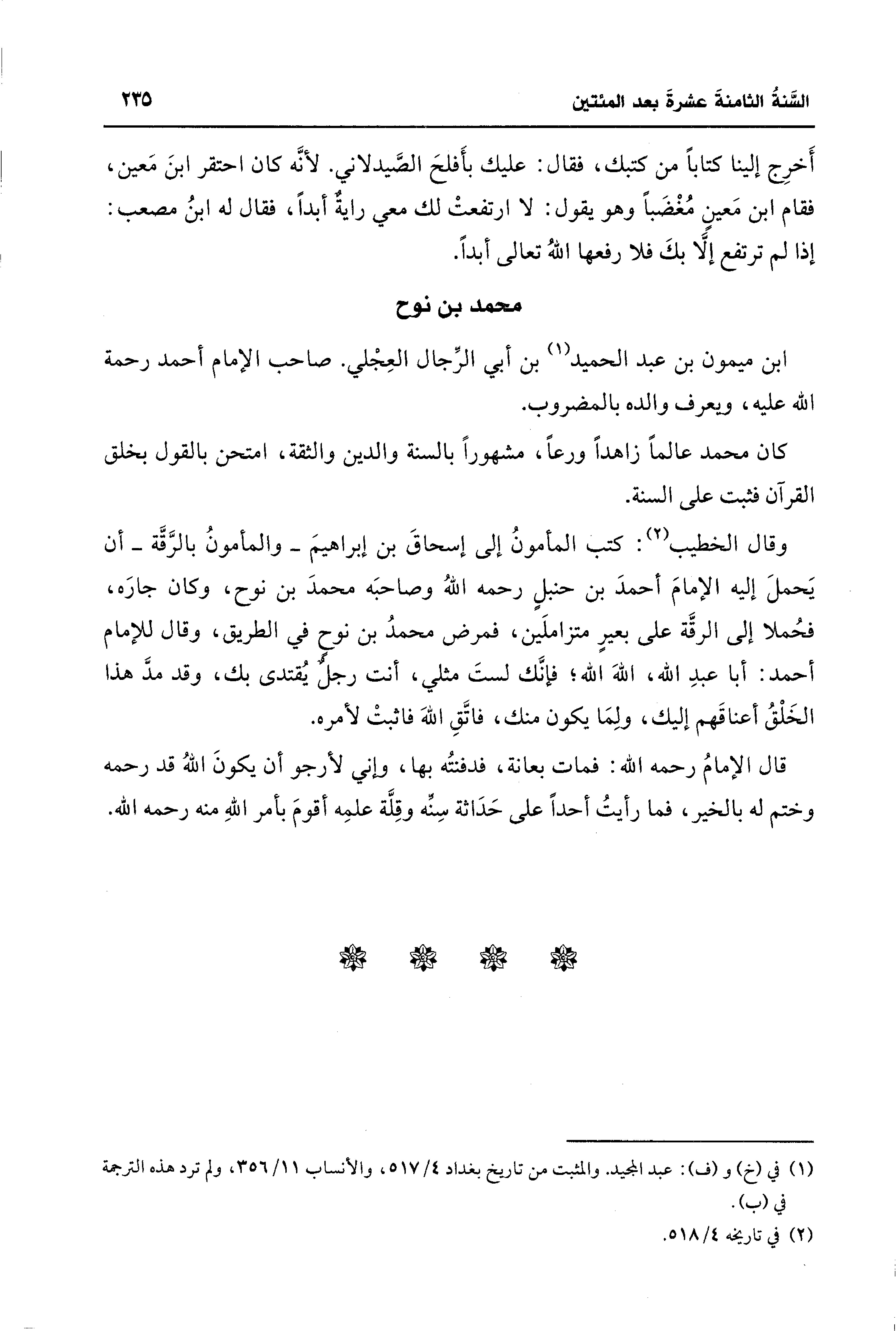 وقال الخطيب (¬2): كتب المأمونُ إلى إسحاقَ بن إبراهيمَ -والمأمونُ بالرَّقَّة- أن يَحملَ إليه الإمامَ أحمدَ بن حنبلٍ رحمه اللهُ وصاحبَه محمدَ بن نوح، وكان جارَه، فحُملا إلى الرقَّة على بعيرٍ متزاملَين، فمرض محمدُ بن نوح في الطريق، وقال للإمام أحمد: أبا عبدِ الله، اللهَ الله؛ فإنَّك لستَ مثلي، أنت رجلٌ يُقتدى بك، وقد مدَّ هذا الخَلْقُ أعناقَهم إليك، ولِمَا يكون منك، فاتَّقِ اللهَ فاثبتْ لأمره.