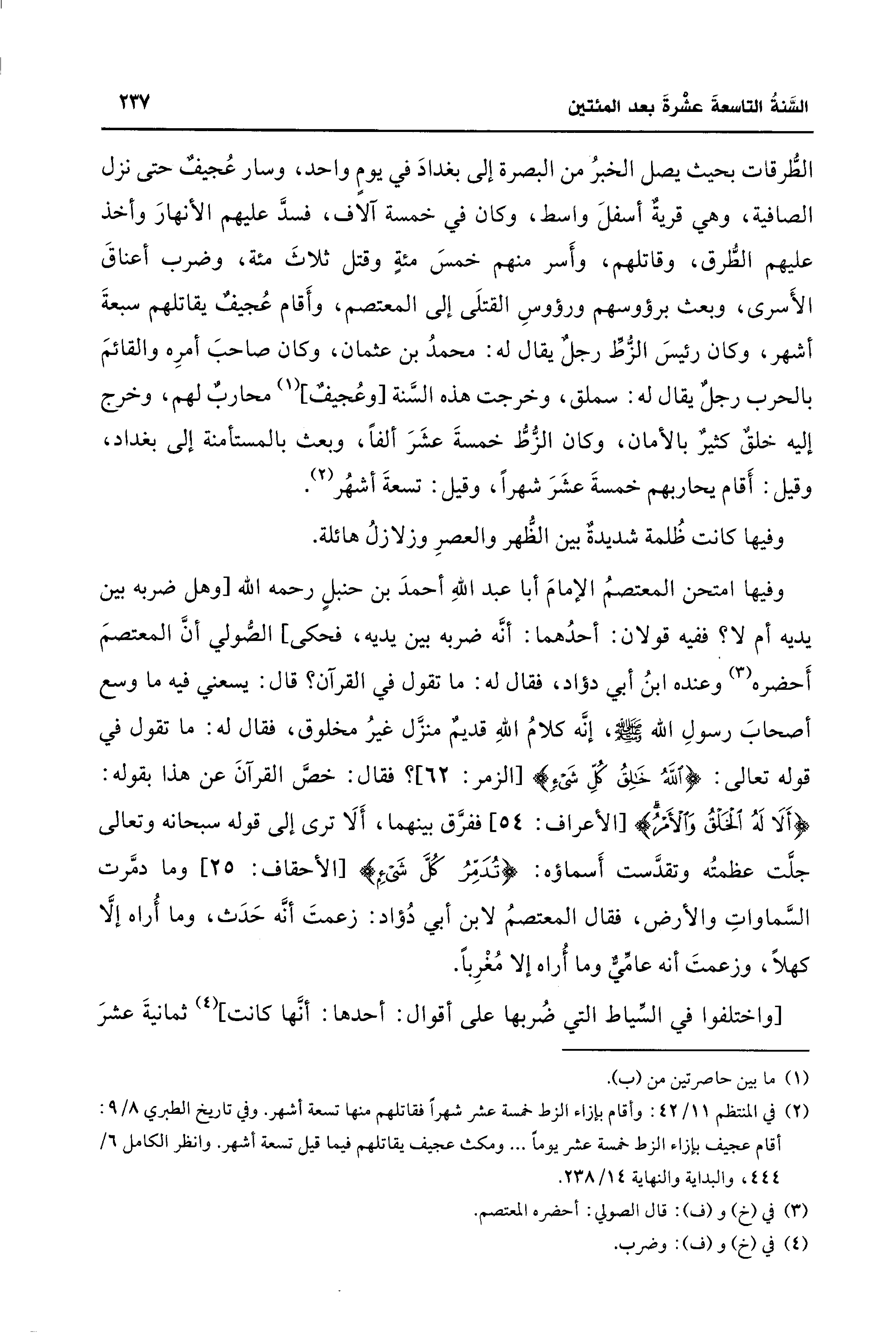 (¬2) في المنتظم 11/ 42: وأقام بإزاء الزط خمسة عشر شهرًا فقاتلهم منها تسعة أشهر. وفي تاريخ الطبري 8/ 9: أقام عجيف بإزاء الزط خمسة عشر يومًا ... ومكث عجيف يقاتلهم فيما قيل تسعة أشهر. وانظر الكامل 6/ 444، والبداية والنهاية 14/ 238.
