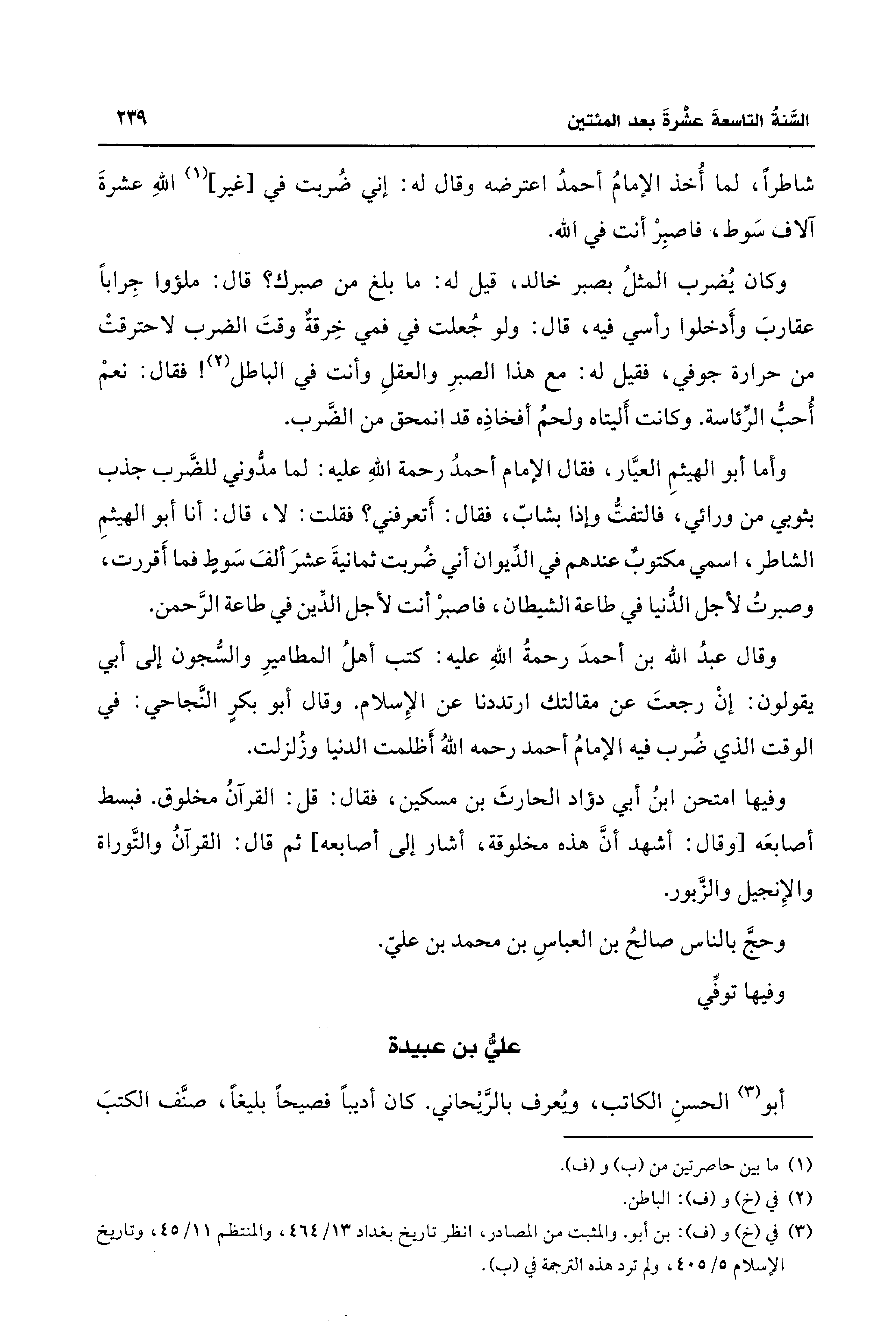 وفيها امتحن ابنُ أبي دؤاد الحارثَ بن مسكين، فقال: قل: القرآنُ مخلوق. فبسط أصابعَه [وقال: أشهد أنَّ هذه مخلوقة، أشار إلى أصابعه] ثم قال: القرآنُ والتَّوراة والإِنجيل والزَّبور.