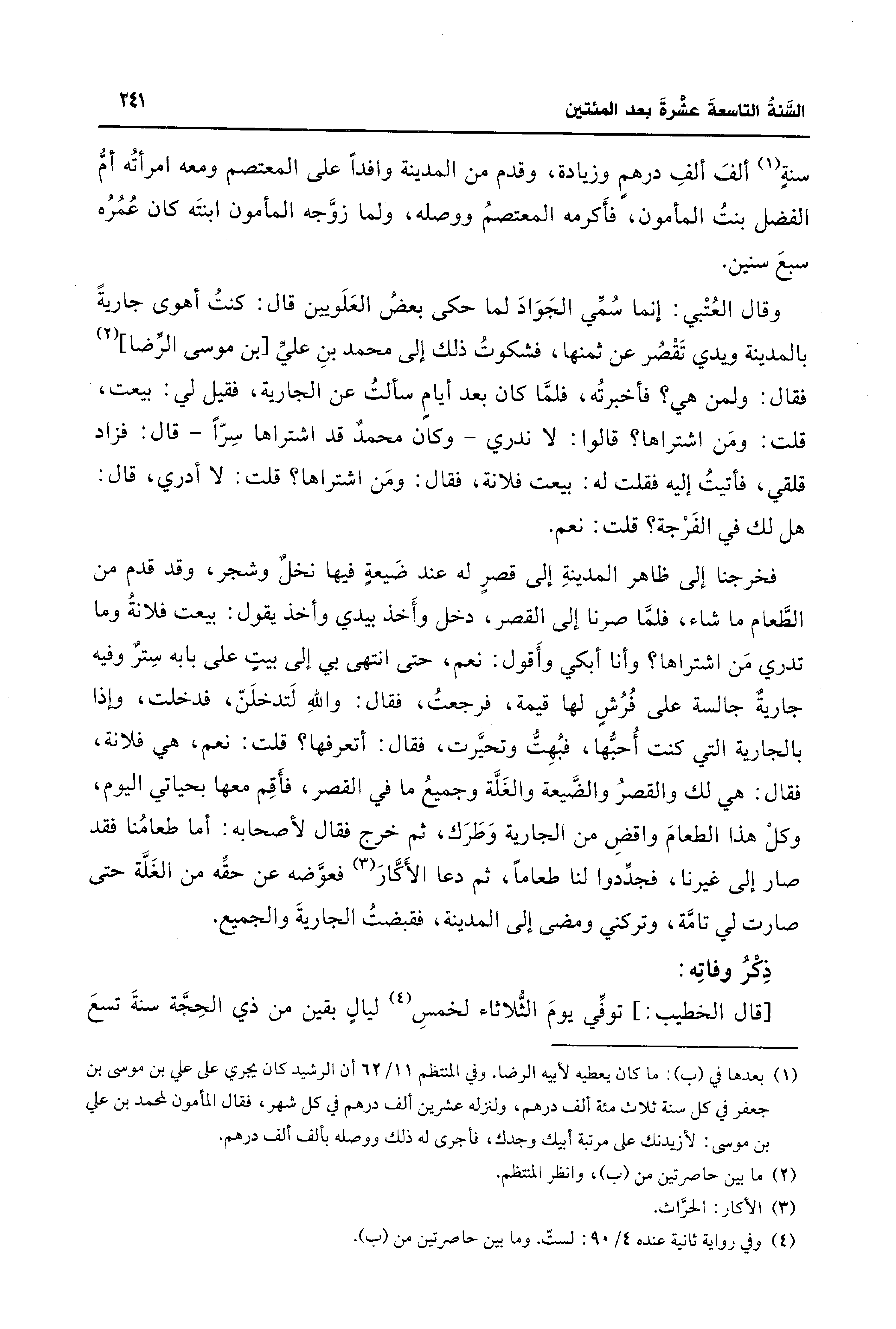 فخرجنا إلى ظاهر المدينةِ إلى قصرٍ له عند ضَيعةٍ فيها نخْلٌ وشجر، وقد قدم من الطَّعام ما شاء، فلمَّا صرنا إلى القصر، دخل وأَخذ بيدي وأخذ يقول: بيعت فلانةُ وما تدري مَن اشتراها؟ وأنا أبكي وأَقول: نعم، حتى انتهى بي إلى بيتٍ على بابه سِترٌ وفيه جاريةٌ جالسة على فُرُشٍ لها قيمة، فرجعتُ، فقال: واللهِ لَتدخلَنّ، فدخلت، وإذا بالجارية التي كنت أُحبُّها، فبُهِتُّ وتحيَّرت، فقال: أتعرفها؟ قلت: نعم، هي فلانة، فقال: هي لك والقصرُ والضَّيعة والغَلَّة وجميعُ ما في القصر، فأَقِم معها بحياتي اليوم، وكلْ هذا الطعامَ واقضِ من الجارية وَطَرَك، ثم خرج فقال لأصحابه: أما طعامُنا فقد صار إلى غيرنا، فجدِّدوا لنا طعامًا، ثم دعا الأَكَّارَ (¬3) فعوَّضه عن حقِّه من الغَلَّة حتى صارت لي تامَّة، وتركني ومضى إلى المدينة، فقبضتُ الجاريةَ والجميع.