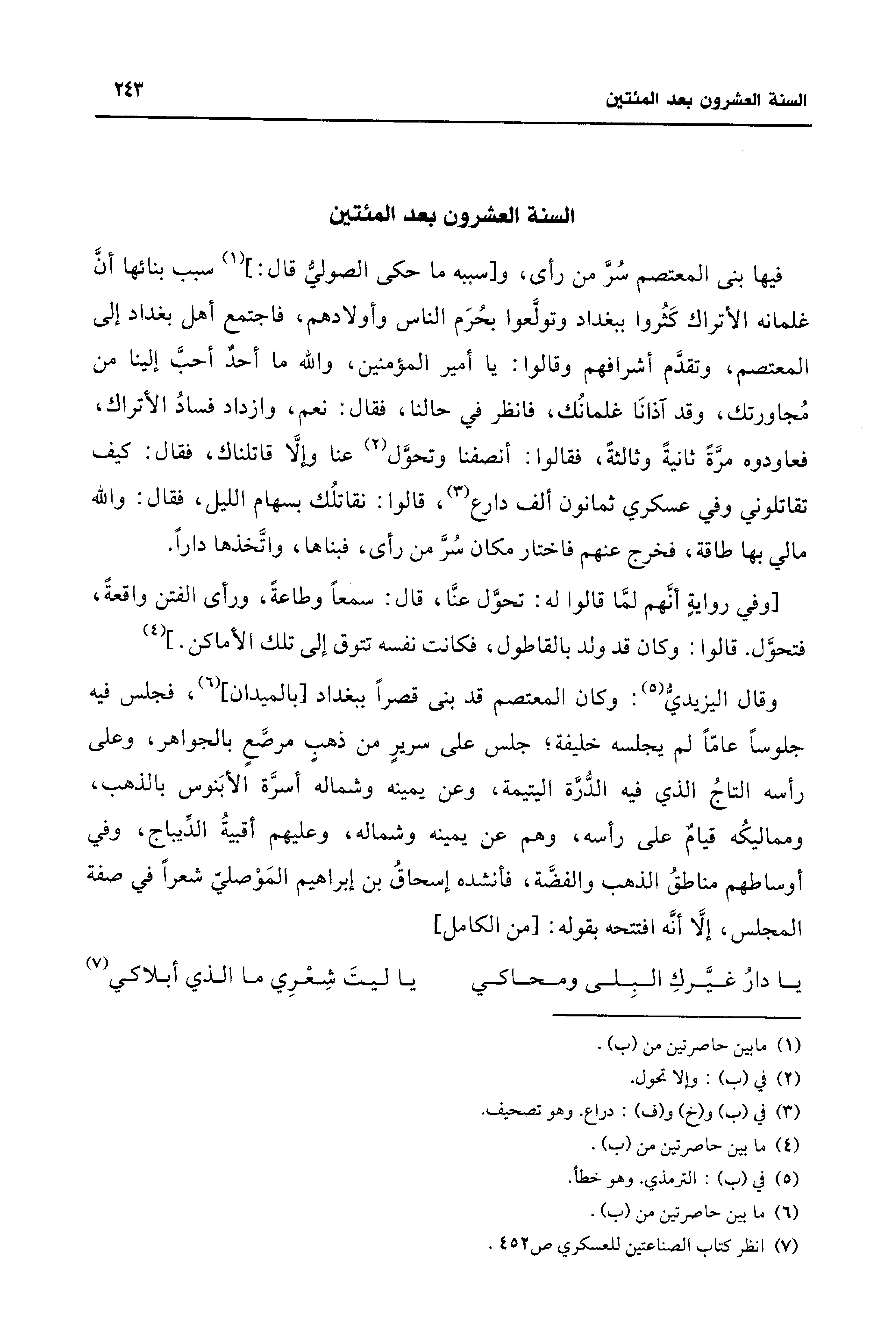 فيها بنى المعتصم سُرَّ من رأى، و [سببه ما حكى الصوليُّ قال: ] (¬1) سبب بنائها أنَّ غلمانه الأتراك كَثُروا ببغداد وتولَّعوا بحُرَم الناس وأولادهم، فاجتمع أهل بغداد إلى المعتصم، وتقدَّم أشرافهم وقالوا: يا أمير المؤمنين، والله ما أحدٌ أحبَّ إلينا من مُجاورتك، وقد آذانَا غلمانُك، فانظر في حالنا، فقال: نعم، وازداد فسادُ الأتراك، فعاودوه مرَّةً ثانية وثالثةً، فقالوا: أنصفنا وتحوَّل (¬2) عنا وإلَّا قاتلناك، فقال: كيف تقاتلوني وفي عسكري ثمانون ألف دارع (¬3)، قالوا: نقاتلُك بسهام الليل، فقال: والله ما لي بها طاقة، فخرج عنهم فاختار مكان سُرَّ من رأى، فبناها، واتَّخذها دارًا.