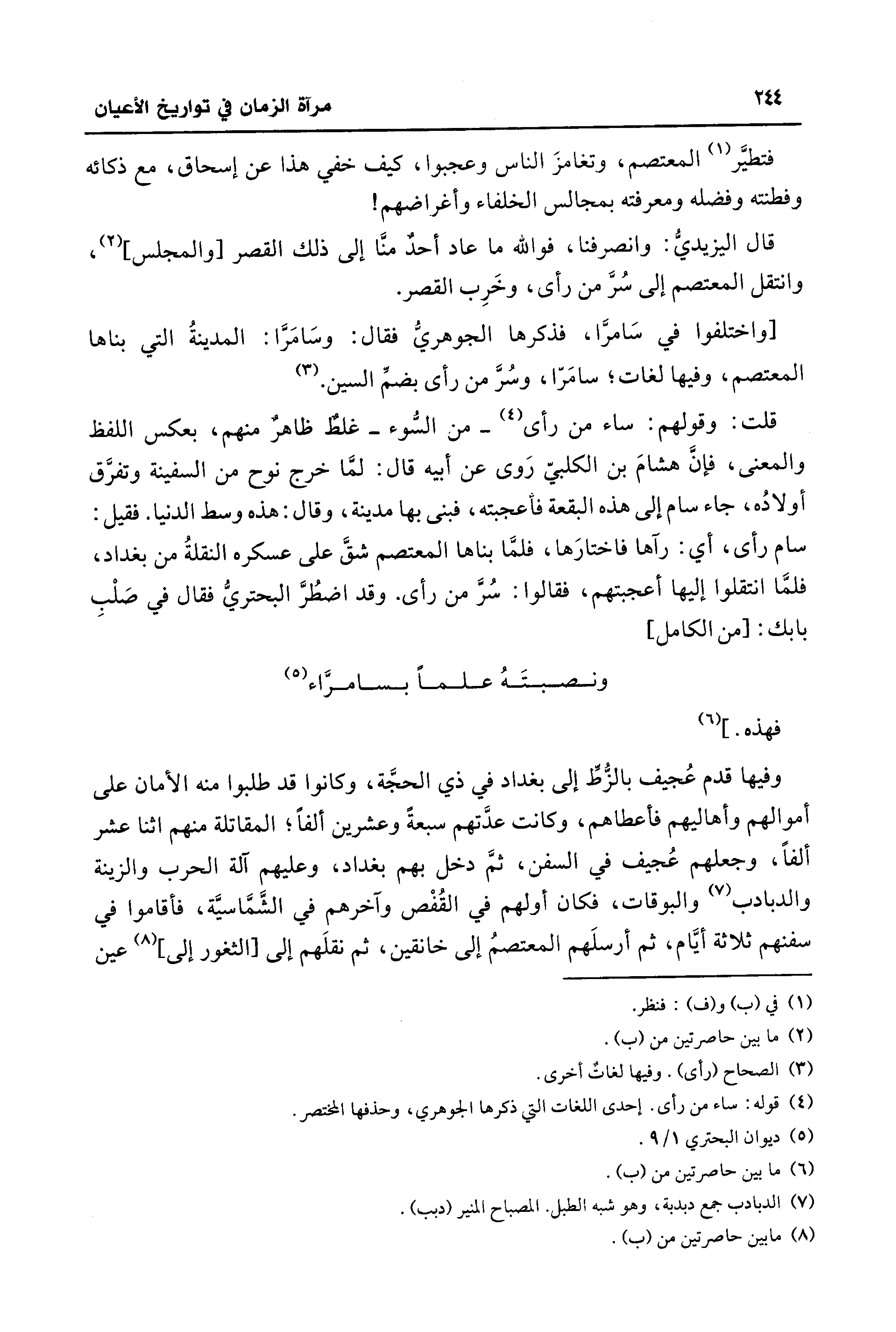 قلت: وقولهم: ساء من رأى (¬4) -من السُّوء- غلظٌ ظاهرٌ منهم، بعكس اللفظ والمعنى، فإنَّ هشامَ بن الكلبيّ رَوى عن أبيه قال: لمَّا خرج نوح من السفينة وتفرَّق أولادُه، جاء سام إلى هذه البقعة فأعجبته، فبنى بها مدينة، وقال: هذه وسط الدنيا. فقيل: سام رأى، أي: رآها فاختارَها، فلمَّا بناها المعتصم شقَّ على عسكره النقلةُ من بغداد، فلمَّا انتقلوا إليها أعجبتهم، فقالوا: سُرَّ من رأى. وقد اضطُرَّ البحتريُّ فقال في صَلْب بابك: [من الكامل]