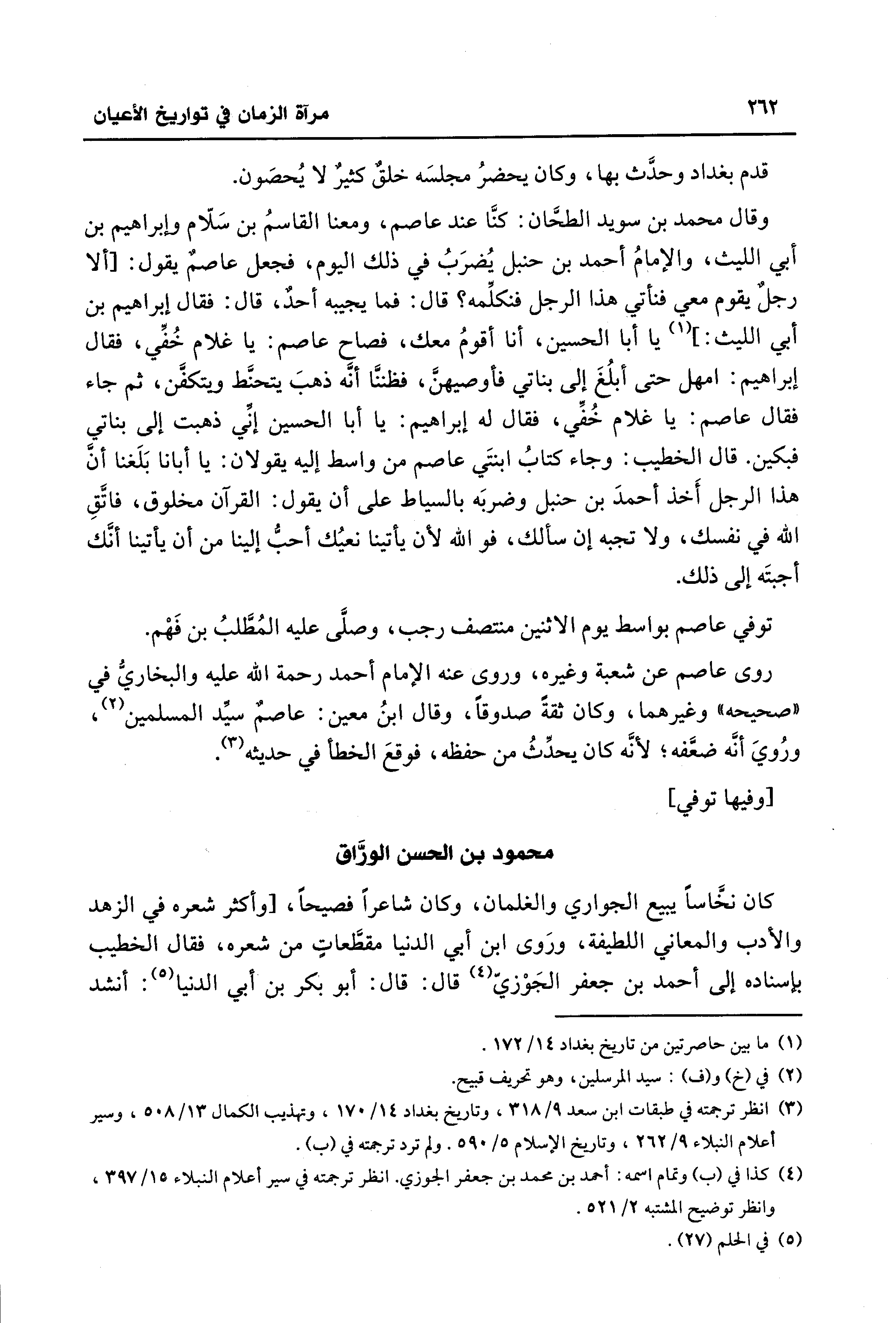 وقال محمد بن سويد الطحَّان: كنَّا عند عاصم، ومعنا القاسمُ بن سَلّام وإبراهيم بن أبي الليث، والإمامُ أحمد بن حنبل يُضرَبُ في ذلك اليوم، فجعل عاصمٌ يقول: [ألا رجلٌ يقوم معي فنأتي هذا الرجل فنكلِّمه؟ قال: فما يجيبه أحدٌ، قال: فقال إبراهيم بن أبي الليث: ] (¬1) يا أبا الحسين، أنا أقومُ معك، فصاح عاصم: يا غلام خُفِّي، فقال إبراهيم: امهل حتى أبلُغَ إلى بناتي فأوصيهنَّ، فظننَّا أنَّه ذهبَ يتحنَّط ويتكفَّن، ثم جاء فقال عاصم: يا غلام خُفِّي، فقال له إبراهيم: يا أبا الحسين إني ذهبت إلى بناتي فبكين. قال الخطيب: وجاء كتابُ ابنتَي عاصم من واسط إليه يقولان: يا أبانا بَلَغنا أنَّ هذا الرجل أَخذ أحمدَ بن حنبل وضربَه بالسياط على أن يقول: القرآن مخلوق، فاتَّقِ الله في نفسك، ولا تجبه إن سألك، فوالله لأن يأتينا نعيُك أحبُّ إلينا من أن يأتينا أنَّك أجبتَه إلى ذلك.