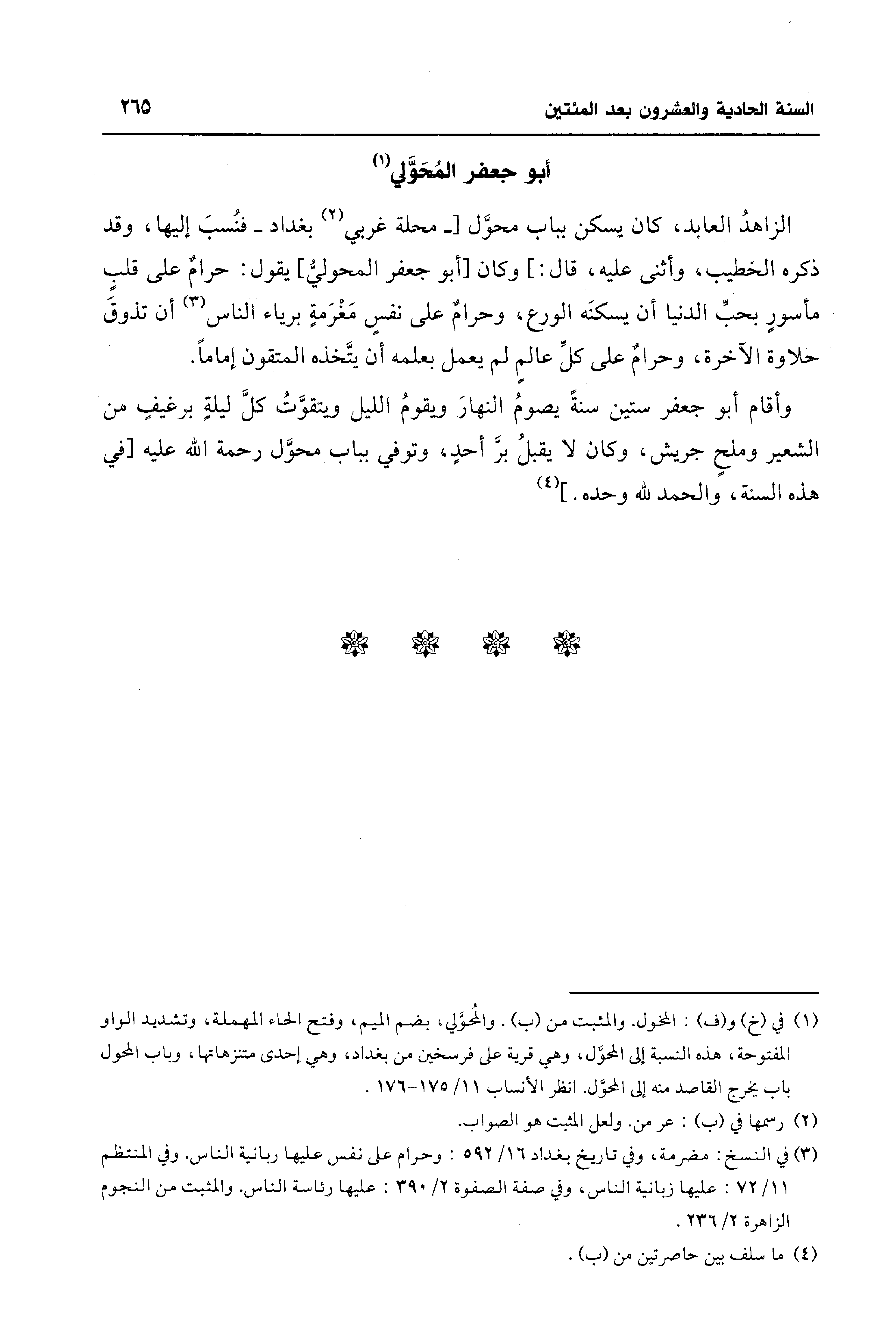 (¬3) في النسخ: مضرمة، وفي تاريخ بغداد 16/ 592: وحرام على نفس عليها ربانية الناس. وفي المنتظم 11/ 72: عليها زبانية الناس، وفي صفة الصفوة 2/ 390: عليها رئاسة الناس. والمثبت من النجوم الزاهرة 2/ 236.