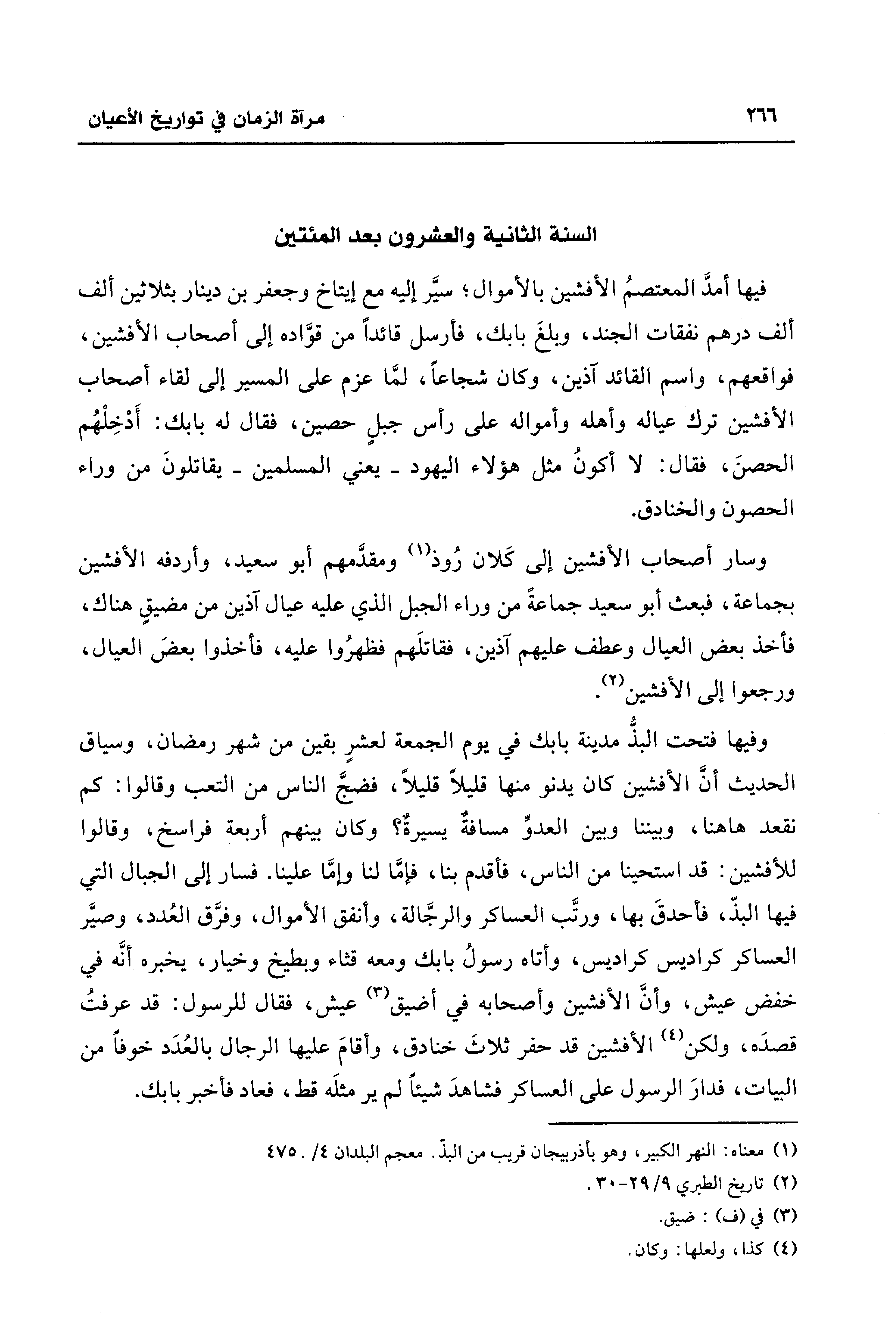 وفيها فتحت البذُّ مدينة بابك في يوم الجمعة لعشرٍ بقين من شهر رمضان، وسياق الحديث أنَّ الأفشين كان يدنو منها قليلًا قليلًا، فضجَّ الناس من التعب وقالوا: كم نقعد هاهنا، وبيننا وبين العدوِّ مسافةٌ يسيرةٌ؟ وكان بينهم أربعة فراسخ، وقالوا للأفشين: قد استحينا من الناس، فأقدم بنا، فإمَّا لنا وإمَّا علينا. فسار إلى الجبال التي فيها البذّ، فأحدقَ بها، ورتَّب العساكر والرجَّالة، وأنفق الأموال، وفرَّق العُدد، وصيَّر العساكر كراديس كراديس، وأتاه رسولُ بابك ومعه قثاء وبطيخ وخيار، يخبره أنَّه في خفض عيش، وأنَّ الأفشين وأصحابه في أضيق (¬3) عيش، فقال للرسول: قد عرفتُ قصدَه، ولكن (¬4) الأفشين قد حفر ثلاثَ خنادق، وأقامَ عليها الرجال بالعُدَد خوفًا من البيات، فدارَ الرسول على العساكر فشاهدَ شيئًا لم ير مثلَه قط، فعاد فأخبر بابك.