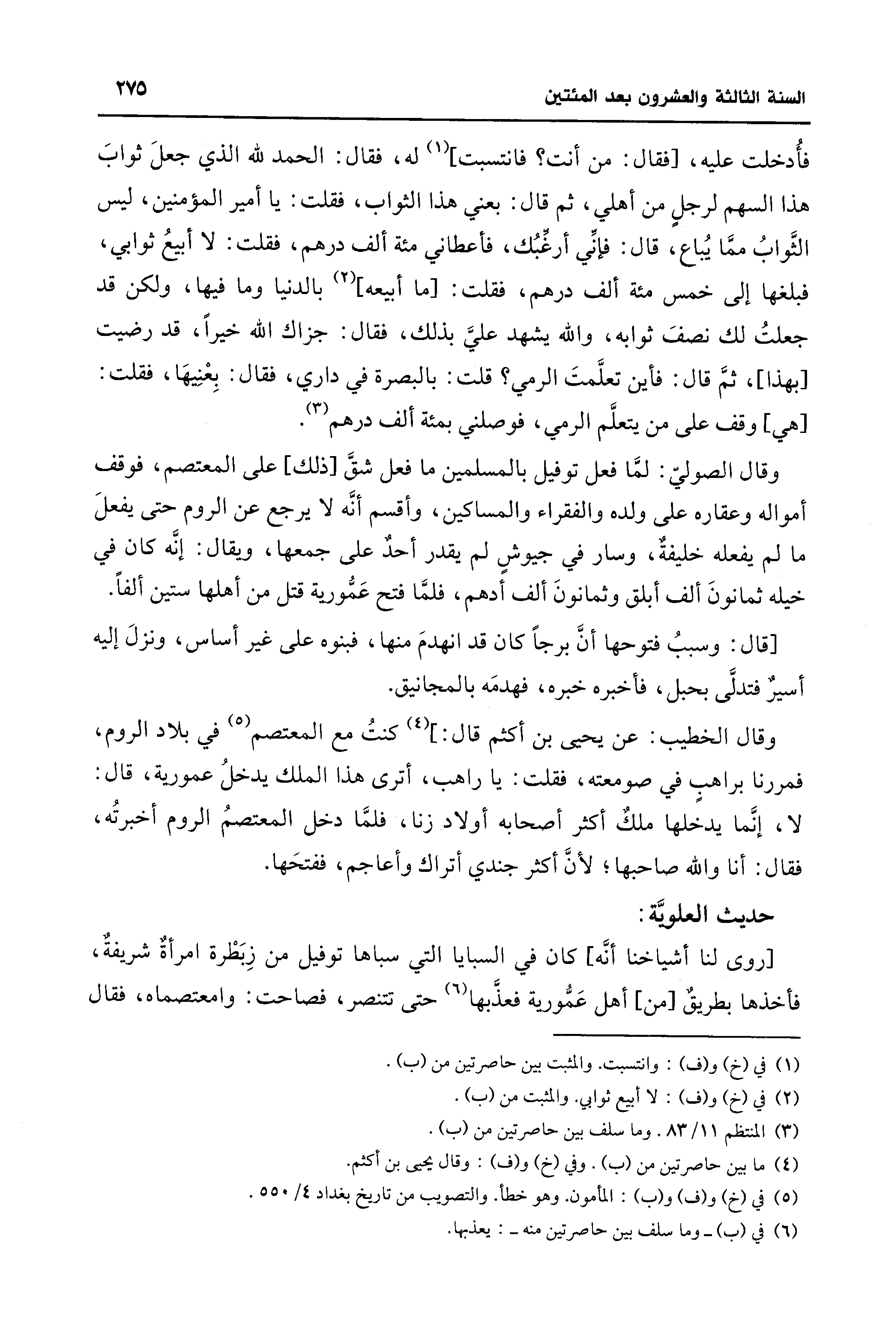 فأُدخلت عليه، [فقال: من أنت؟ فانتسبت] (¬1) له، فقال: الحمد لله الذي جعلَ ثوابَ هذا السهم لرجلٍ من أهلي، ثم قال: بعني هذا الثواب، فقلت: يا أمير المؤمنين، ليس الثَّوابُ ممَّا يُباع، قال: فإنِّي أرغبُك، فأعطاني مئة ألف درهم، فقلت: لا أبيعُ ثوابي، فبلغها إلى خمس مئة ألف درهم، فقلت: [ما أبيعه] (¬2) بالدنيا وما فيها، ولكن قد جعلتُ لك نصفَ ثوابه، والله يشهد عليَّ بذلك، فقال: جزاك الله خيرًا، قد رضيت [بهذا]، ثمَّ قال: فأين تعلَّمتَ الرمي؟ قلت: بالبصرة في داري، فقال: بِعْنِيهَا، فقلت: [هي] وقف على من يتعلَّم الرمي، فوصلني بمئة ألف درهم (¬3).