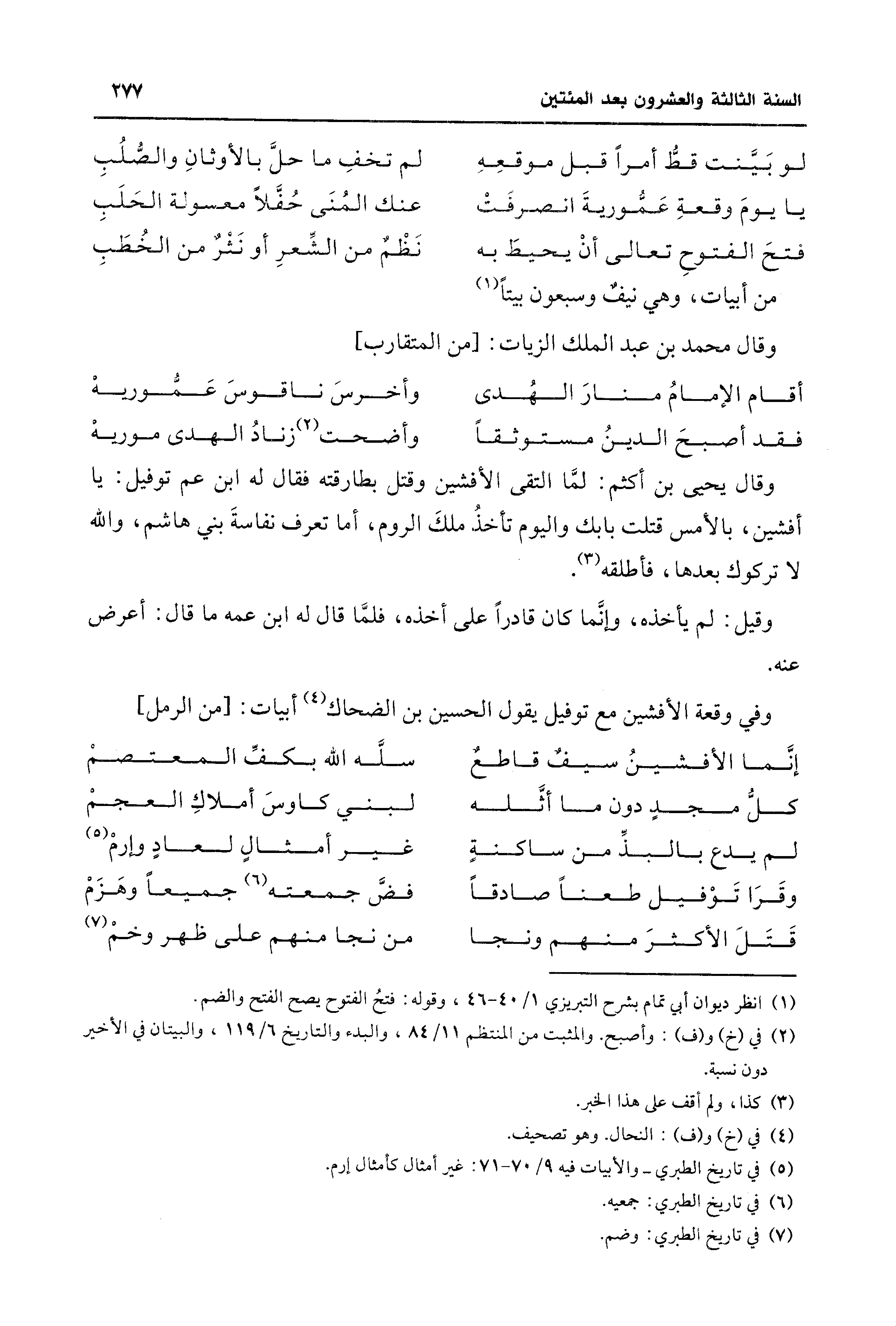 وقال يحيى بن أكثم: لمَّا التقى الأفشين وقتل بطارقته فقال له ابن عم توفيل: يا أفشين، بالأمس قتلت بابك واليوم تأخذُ ملكَ الروم، أما تعرف نفاسةَ بني هاشم، والله لا تركوك بعدها، فأطلقه (¬3).