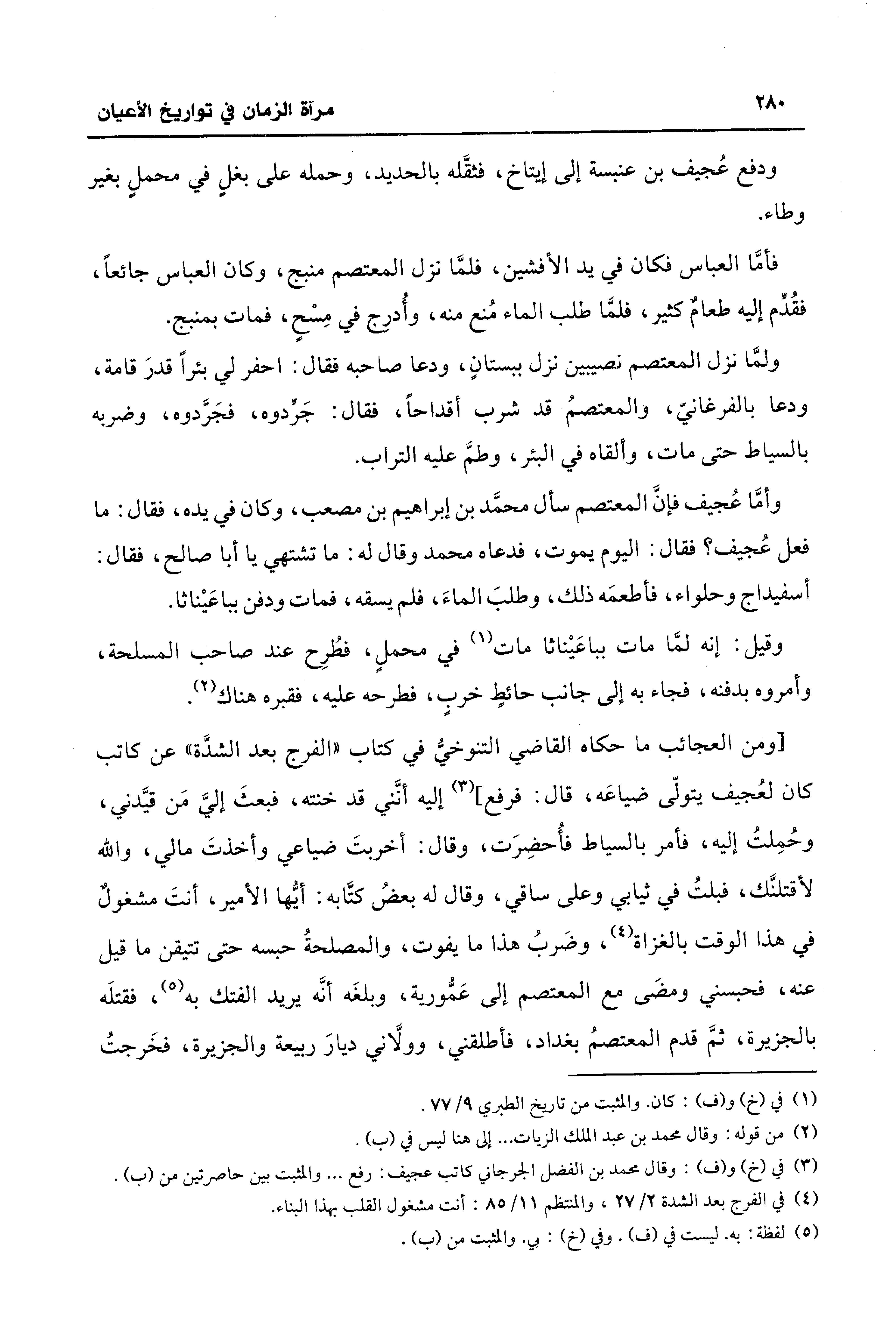 [ومن العجائب ما حكاه القاضي التنوخيُّ في كتاب "الفرج بعد الشدَّة" عن كاتب كان لعُجيف يتولّى ضياعَه، قال: فرفع] (¬3) إليه أنَّني قد خنته، فبعثَ إليَّ مَن قيَّدني، وحُمِلتُ إليه، فأمر بالسياط فأُحضِرَت، وقال: أخربتَ ضياعي وأخذتَ مالي، والله لأقتلنَّك، فبلتُ في ثيابي وعلى ساقي، وقال له بعضُ كتَّابه: أيُّها الأمير، أنتَ مشغولٌ في هذا الوقت بالغزاة (¬4)، وضَربُ هذا ما يفوت، والمصلحةُ حبسه حتى تتيقن ما قيل عنه، فحبسني ومضَى مع المعتصم إلى عَمُّورية، وبلغَه أنَّه يريد الفتك به (¬5)، فقتلَه بالجزيرة، ثمَّ قدم المعتصمُ بغداد، فأطلقني، وولَّاني ديارَ ربيعة والجزيرة، فخَرجتُ