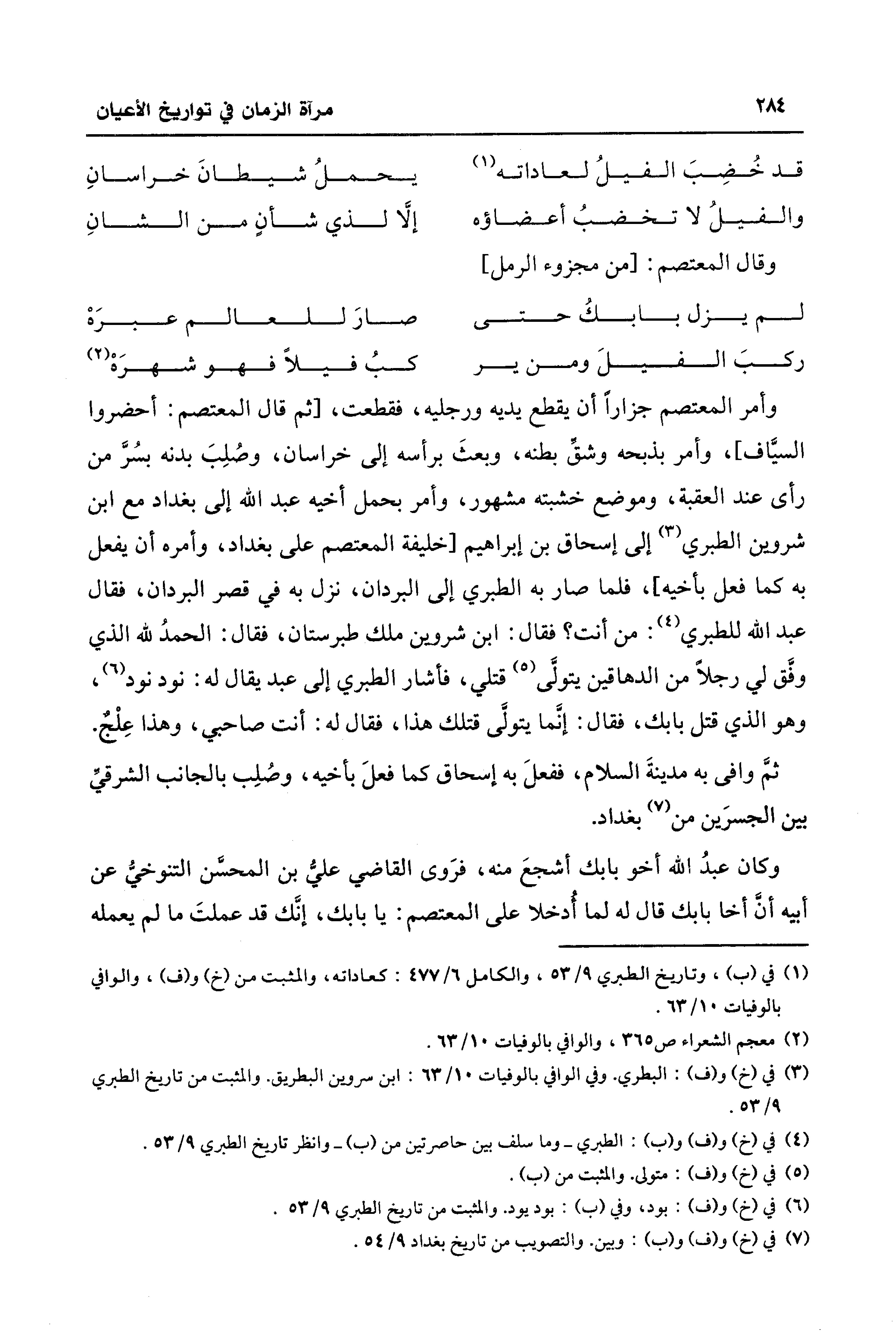 وأمر المعتصم جزارًا أن يقطع يديه ورجليه، فقطعت، [ثم قال المعتصم: أحضروا السيَّاف]، وأمر بذبحه وشقِّ بطنه، وبعثَ برأسه إلى خراسان، وصُلِبَ بدنه بسُرَّ من رأى عند العقبة، وموضع خشبته مشهور، وأمر بحمل أخيه عبد الله إلى بغداد مع ابن شروين الطبري (¬3) إلى إسحاق بن إبراهيم [خليفة المعتصم على بغداد، وأمره أن يفعل به كما فعل بأخيه]، فلما صار به الطبري إلى البردان، نزل به في قصر البردان، فقال عبد الله للطبري (¬4): من أنت؟ فقال: ابن شروين ملك طبرستان، فقال: الحمدُ لله الذي وفَّق لي رجلًا من الدهاقين يتولَّى (¬5) قتلي، فأشار الطبري إلى عبد يقال له: نود نود (¬6)، وهو الذي قتل بابك، فقال: إنَّما يتولَّى قتلك هذا، فقال له: أنت صاحبي، وهذا عِلْجٌ.