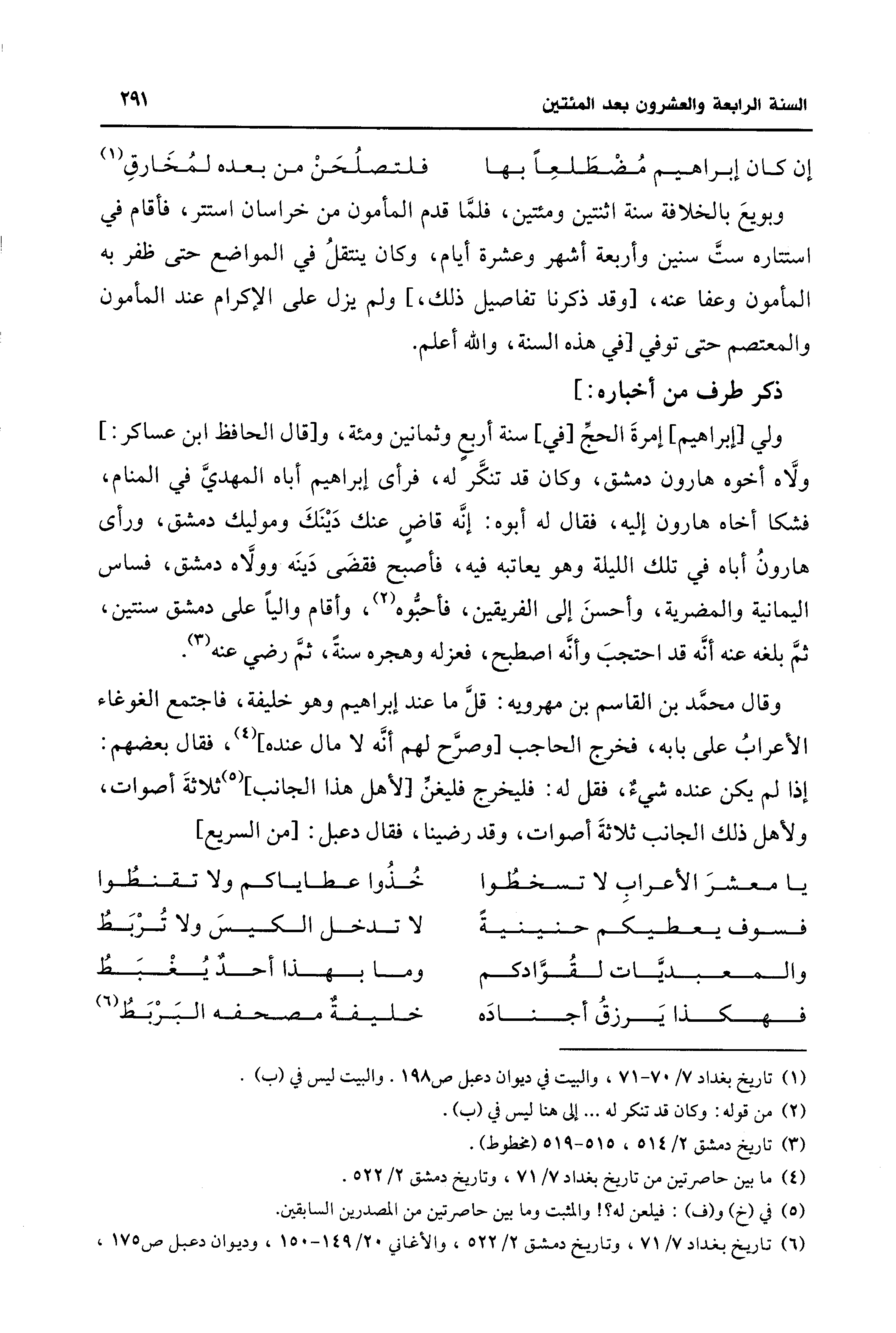 (¬6) تاريخ بغداد 7/ 71، وتاريخ دمشق 2/ 522، والأغاني 20/ 149 - 150، وديوان دعبل ص 175.