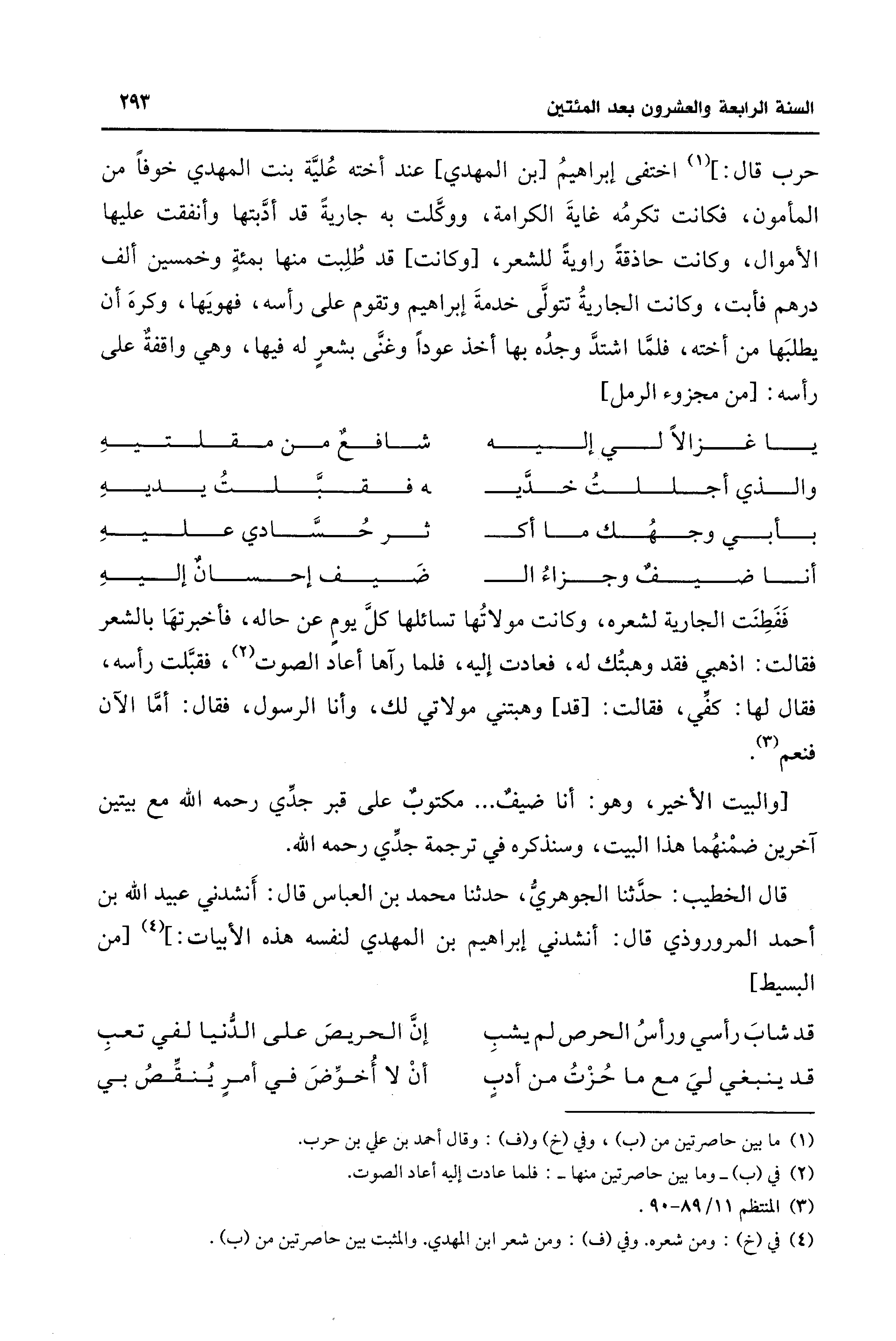 قال الخَطيب: حدَّثنا الجوهريُّ، حَدَّثَنَا محمَّد بن العباس قال: أَنشدني عبيد الله بن أَحْمد المروروذي قال: أنشدني إبراهيم بن المهدي لنفسه هذه الأبيات: ] (¬4) [من البسيط]