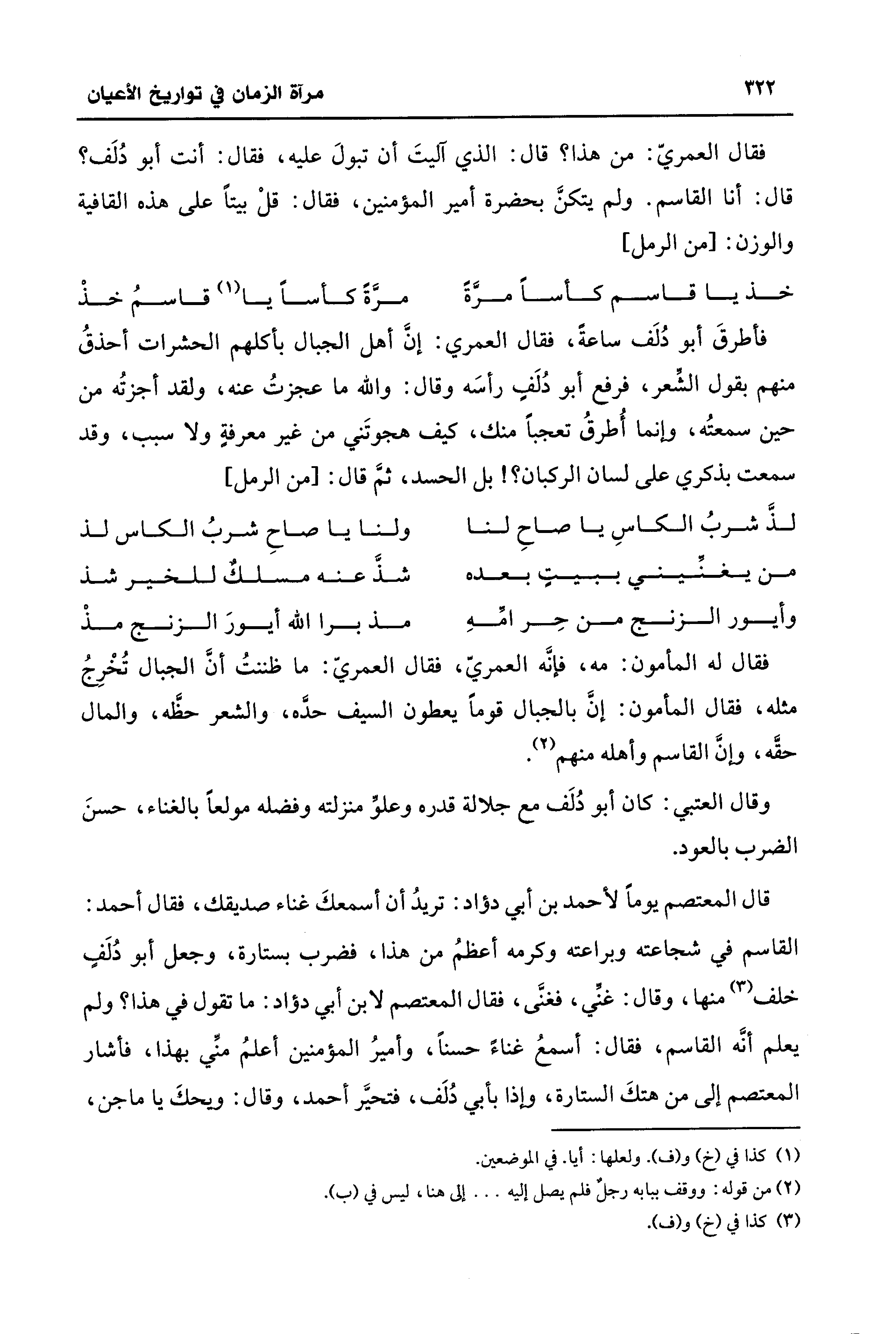 قال المعتصم يومًا لأحمد بن أبي دؤاد: تريدُ أن أسمعكَ غناء صديقك، فقال أَحْمد: القاسم في شجاعته وبراعته وكرمه أعظمُ من هذا، فضرب بستارة، وجعل أبو دُلَفٍ خلف (¬3) منها، وقال: غنِّي، فغنَّى، فقال المعتصم لابن أبي دؤاد: ما تقول في هذا؟ ولم يعلم أنَّه القاسم، فقال: أسمعُ غناءً حسنًا، وأميرُ المُؤْمنين أعلمُ منِّي بهذا، فأشار المعتصم إلى من هتكَ الستارة، وإذا بأبي دُلَف، فتحيَّر أَحْمد، وقال: ويحكَ يَا ماجن،