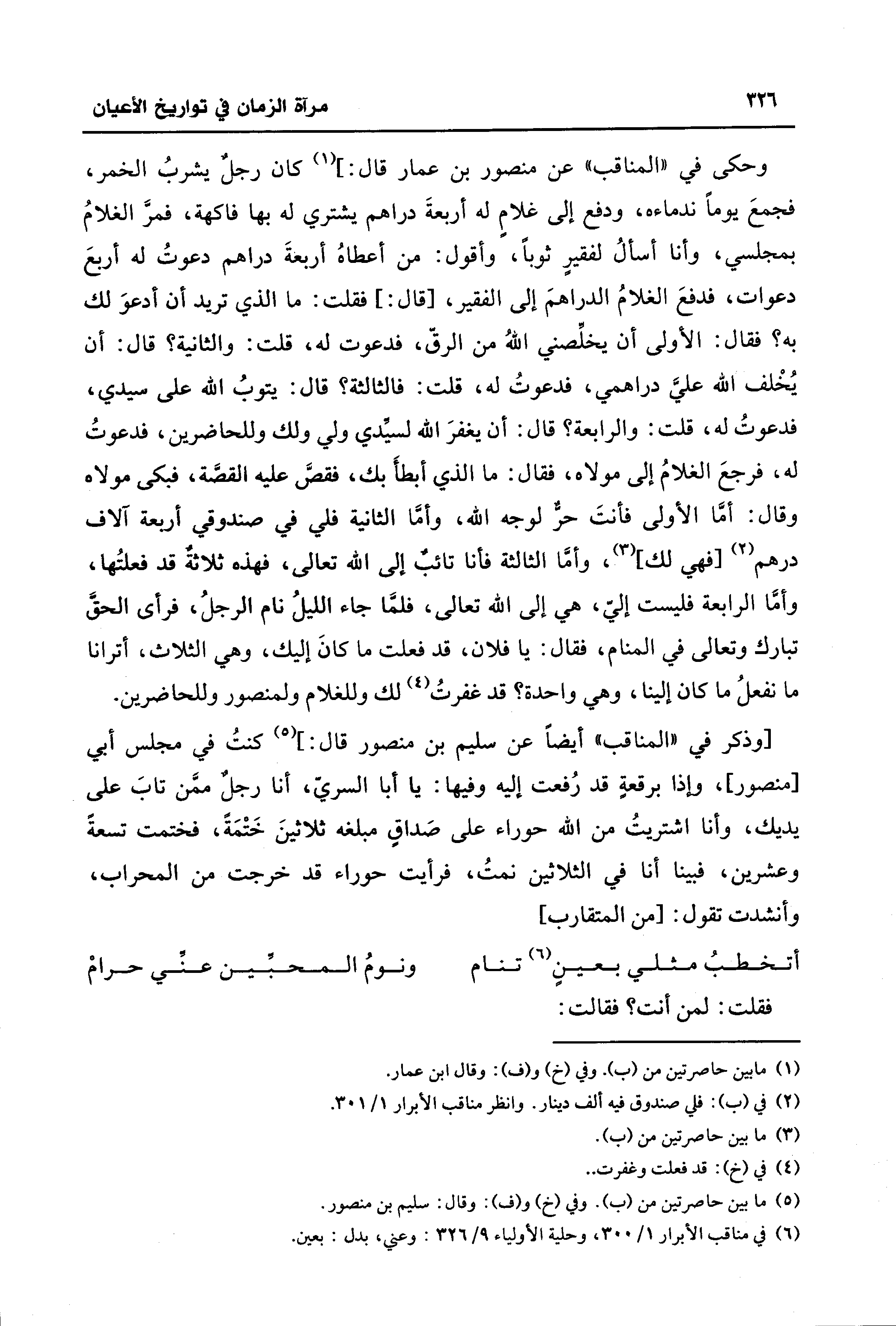 وحكى في "المناقب" عن منصور بن عمار قال: ، (¬1) كان رجلٌ يشربُ الخمر، فجمعَ يومًا ندماءه، ودفع إلى غلامٍ له أربعةَ دراهم يشتري له بها فاكهة، فمر الغلامُ بمجلسي، وأنا أسألُ لفقيرٍ ثوبًا، وأقول: من أعطاهُ أربعةَ دراهم دعوتُ له أربعَ دعوات، فدفعَ الغلامُ الدراهمَ إلى الفقير، [قال: ] فقلت: ما الذي تريد أن أدعوَ لك به؟ فقال: الأولى أن يخلِّصني اللهُ من الرق، فدعوت له، قلت: والثانية؟ قال: أن يُخْلف الله عليَّ دراهمي، فدعوتُ له، قلت: فالثالثة؟ قال: يتوبُ الله على سيدي، فدعوتُ له، قلت: والرابعة؟ قال: أن يغفرَ الله لسيِّدي ولي ولك وللحاضرين، فدعوتُ له، فرجعَ الغلامُ إلى مولاه، فقال: ما الذي أبطأَ بك، فقصَّ عليه القصَّة، فبكى مولاه وقال: أمَّا الأولى فأنتَ حرٌّ لوجه الله، وأمَّا الثَّانية فلي في صندوقي أربعة آلاف درهم (¬2) [فهي لك] (¬3)، وأمَّا الثالثة فأنا تائبٌ إلى الله تعالى، فهذه ثلاثة قد فعلتُها، وأمَّا الرابعة فليست إليّ، هي إلى الله تعالى، فلمَّا جاء الليلُ نام الرجلُ، فرأى الحق تبارك وتعالى في المنام، فقال: يَا فلان، قد فعلت ما كانَ إليك، وهي الثلاث، أترانا ما نفعلُ ما كان إلينا، وهي واحدة؟ قد غفرتُ (¬4) لك وللغلام ولمنصور وللحاضرين.