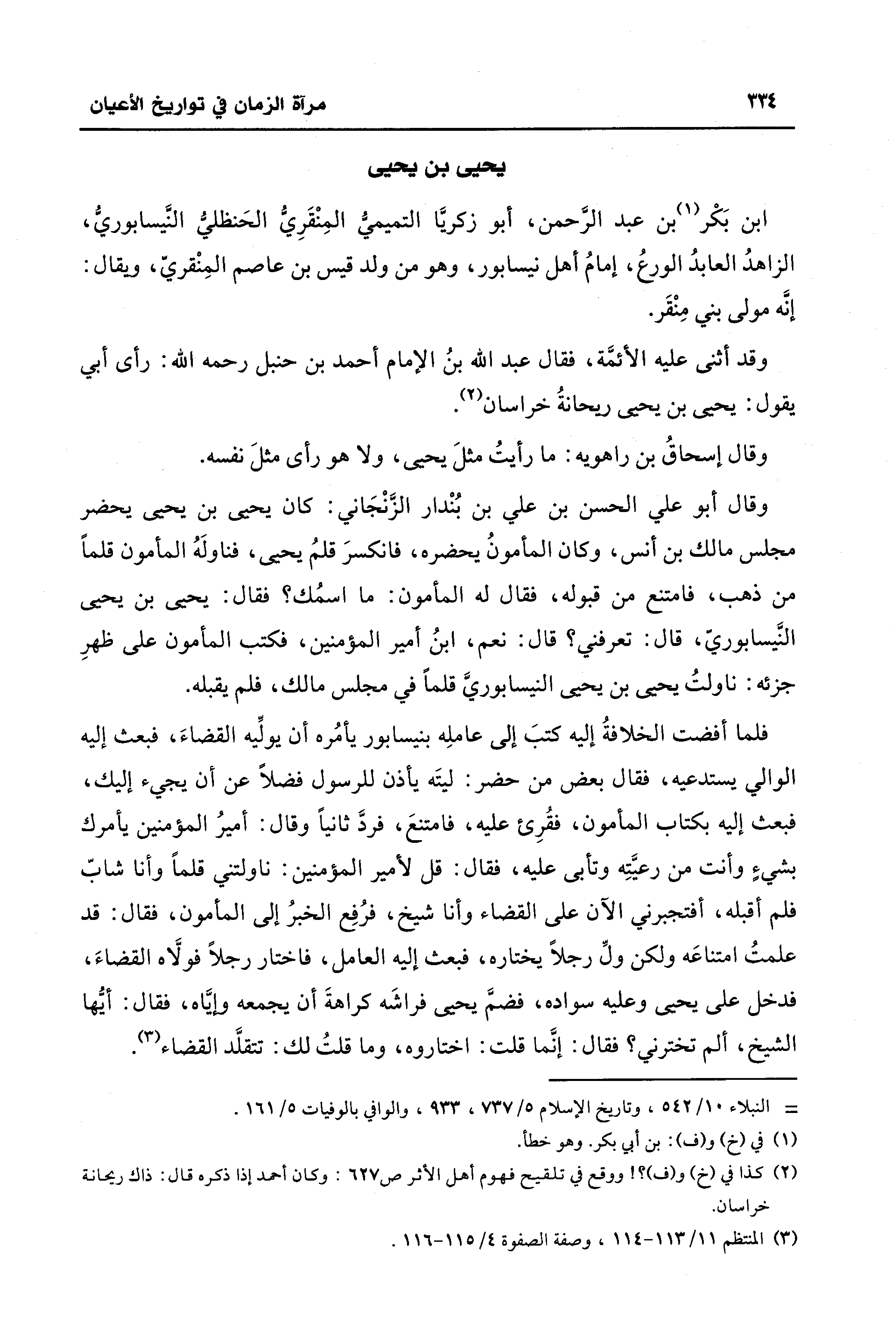فلما أفضت الخلافةُ إليه كتبَ إلى عاملِه بنيسابور يأمُره أن يولِّيه القضاءَ، فبعث إليه الوالي يستدعيه، فقال بعض من حضر: ليتَه يأذن للرسول فضلًا عن أن يجيء إليك، فبعث إليه بكتاب المأمون، فقُرِيء عليه، فامتنعَ، فردَّ ثانيًا وقال: أميرُ المُؤْمنين يأمرك بشيءٍ وأنت من رعيَّتِه وتأبى عليه، فقال: قل لأمير المُؤْمنين: ناولتني قلمًا وأنا شابّ فلم أقبله، أفتجبرني الآن على القضاء وأنا شيخ، فرُفِع الخبرُ إلى المأمون، فقال: قد علمتُ امتناعَه ولكن ولِّ رجلًا يختاره، فبعث إليه العامل، فاختار رجلًا فولَّاه القضاءَ، فدخل على يحيى وعليه سواده، فضمَّ يحيى فراشَه كراهةَ أن يجمعه وإيَّاه، فقال: أيُّها الشيخ، ألم تخترني؟ فقال: إنَّما قلت: اختاروه، وما قلتُ لك: تتقلَّد القضاء (¬3).