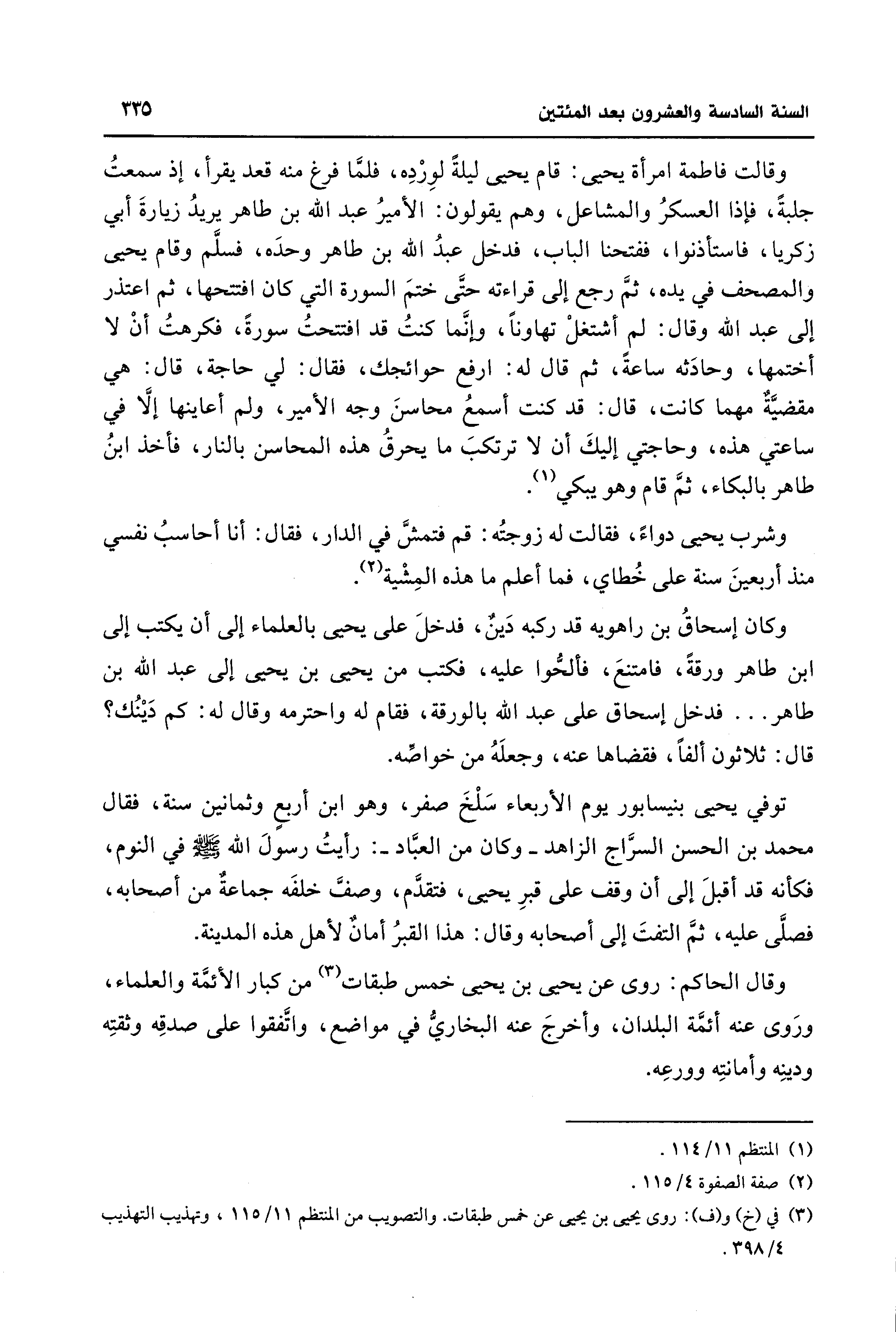 وقالت فاطمة امرأة يحيى: قام يحيى ليلةً لورْدِه، فلمَّا فرغ منه قعد يقرأ، إذ سمعتُ جلبةً، فإذا العسكرُ والمشاعل، وهم يقولون: الأميرُ عبد الله بن طاهر يريدُ زيارةَ أبي زكريا، فاستأذنوا، ففتحنا الباب، فدخل عبد الله بن طاهر وحدَه، فسلَّم وقام يحيى والمصحف في يده، ثمَّ رجع إلى قراءته حتَّى ختمَ السورة التي كان افتتحها، ثم اعتذر إلى عبد الله وقال: لم أشتغلْ تهاونًا، وإنَّما كنتُ قد افتتحتُ سورةً، فكرهتُ أنْ لا أختمها، وحادَثه ساعةً، ثم قال له: ارفع حوائجك، فقال: لي حاجة، قال: هي مقضيَّةٌ مهما كانت، قال: قد كنت أسمعُ محاسنَ وجه الأمير، ولم أعاينها إلَّا في ساعتي هذه، وحاجتي إليكَ أن لا ترتكبَ ما يحرقُ هذه المحاسن بالنار، فأخذ ابنُ طاهر بالبكاء، ثمَّ قام وهو يبكي (¬1).