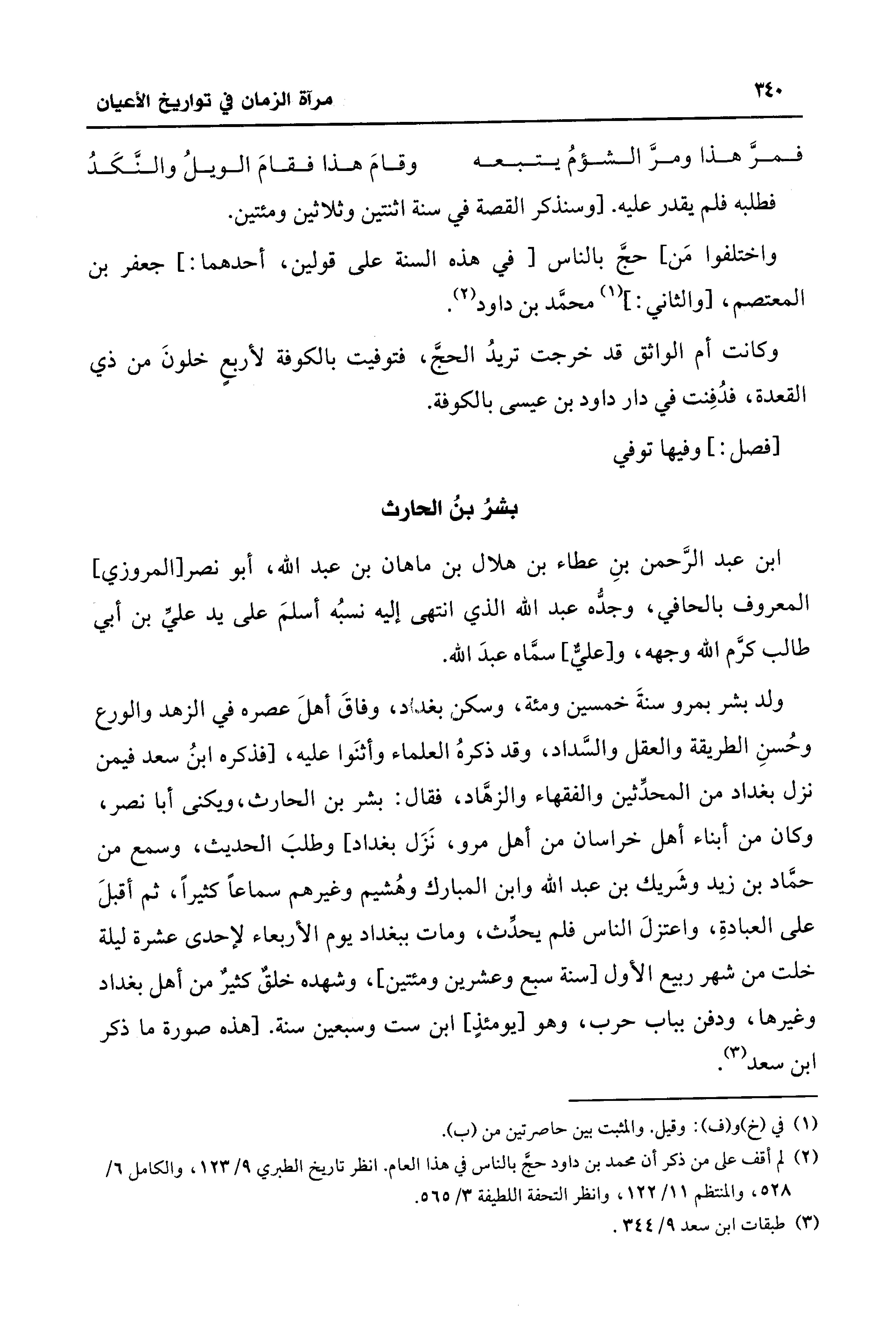 ولد بشر بمرو سنةَ خمسين ومئة، وسكن بغداد، وفاقَ أهلَ عصره في الزهد والورع وحُسنِ الطريقة والعقل والسَّداد، وقد ذكرهُ العلماء وأثنَوا عليه، [فذكره ابنُ سعد فيمن نزل بغداد من المحدِّثين والفقهاء والزهَّاد، فقال: بشر بن الحارث، ويكنى أبا نصر، وكان من أبناء أهل خراسان من أهل مرو، نَزَل بغداد] وطلبَ الحديث، وسمع من حمَّاد بن زيد وشَريك بن عبد الله وابن المبارك وهُشيم وغيرهم سماعًا كثيرًا، ثم أقبلَ على العبادةِ، واعتزلَ الناس فلم يحدِّث، ومات ببغداد يوم الأربعاء لإحدى عشرة ليلة خلت من شهر ربيع الأول [سنة سبع وعشرين ومئتين]، وشهده خلق كثيرٌ من أهل بغداد وغيرها، ودفن بباب حرب، وهو [يومئذٍ] ابن ست وسبعين سنة. [هذه صورة ما ذكر ابن سعد (¬3).