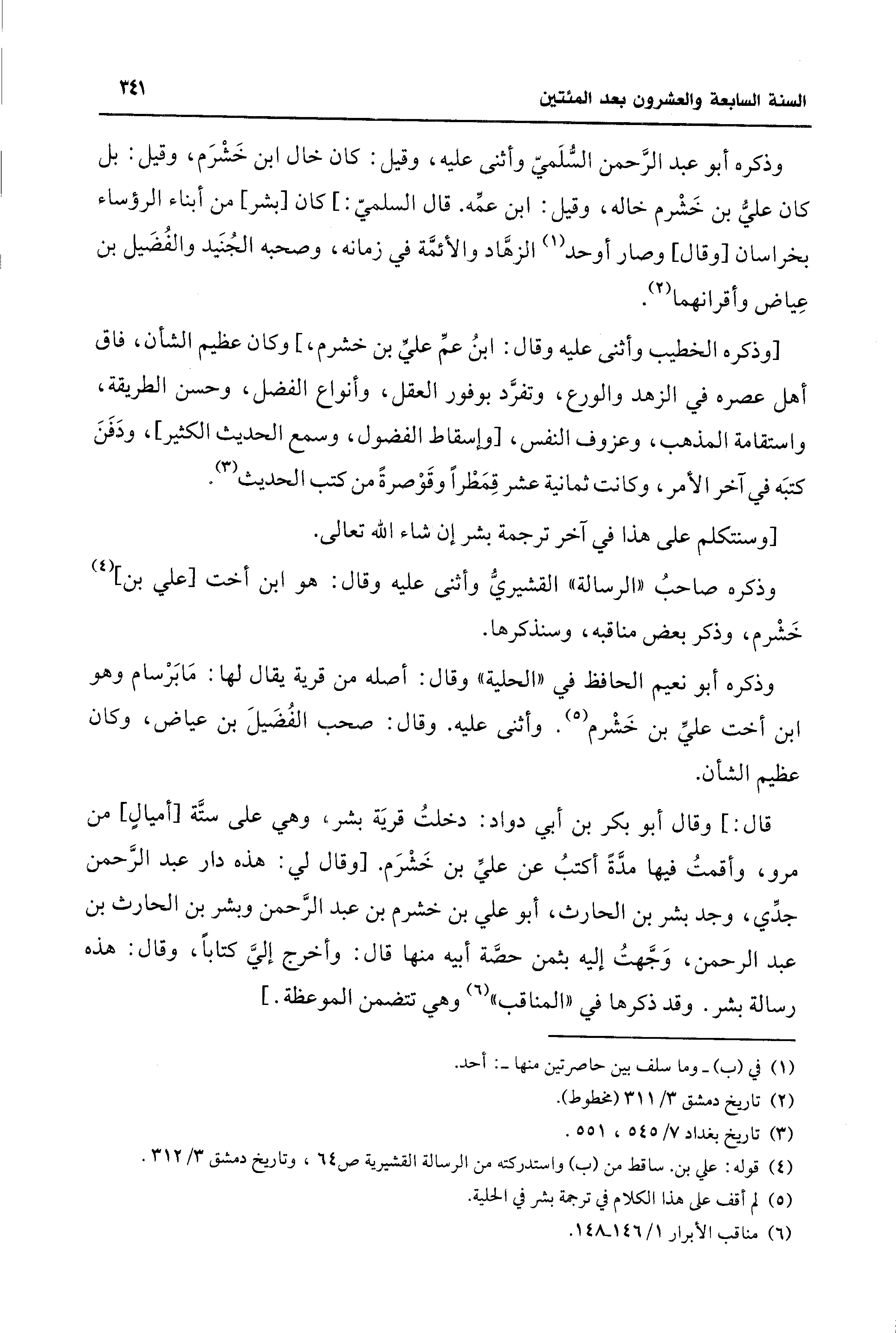 وذكره أبو عبد الرَّحمن السُّلميّ وأثنى عليه، وقيل: كان خال ابن خَشْرَم، وقيل: بل كان عليُّ بن خَشْرم خاله، وقيل: ابن عمِّه. قال السلميّ: ] كان [بشر] من أبناء الرؤساء بخراسان [وقال] وصار أوحد (¬1) الزهَّاد والأئمَّة في زمانه، وصحبه الجُنَيد والفُضَيل بن عِياض وأقرانهما (¬2).