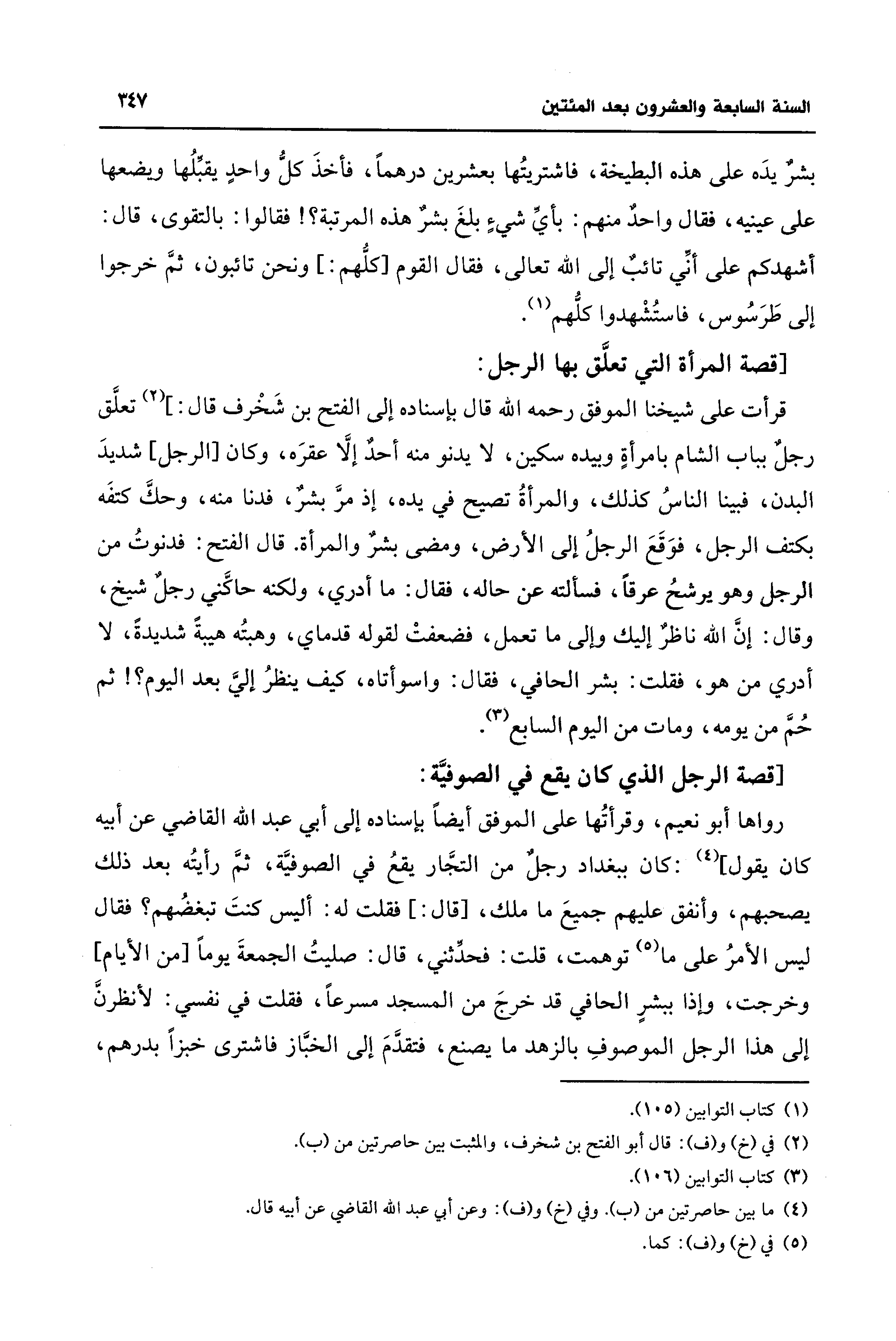 رواها أبو نعيم، وقرأتُها على الموفق أيضًا بإسناده إلى أبي عبد الله القاضي عن أبيه كان يقول] (¬4): كان ببغداد رجل من التجَّار يقعُ في الصوفيَّة، ثمَّ رأيتُه بعد ذلك يصحبهم، وأنفق عليهم جميعَ ما ملك، [قال: ] فقلت له: أليس كنتَ تبغصهم؟ فقال ليس الأمرُ على ما (¬5) توهمت، قلت: فحدِّثني، قال: صليتُ الجمعةَ يومًا [من الأيام] وخرجت، وإذا ببشرٍ الحافي قد خرجَ من المسجد مسرعًا، فقلت في نفسي: لأنظرنَّ إلى هذا الرجل الموصوفِ بالزهد ما يصنع، فتقدَّمَ إلى الخبَّاز فاشترى خبزًا بدرهم،