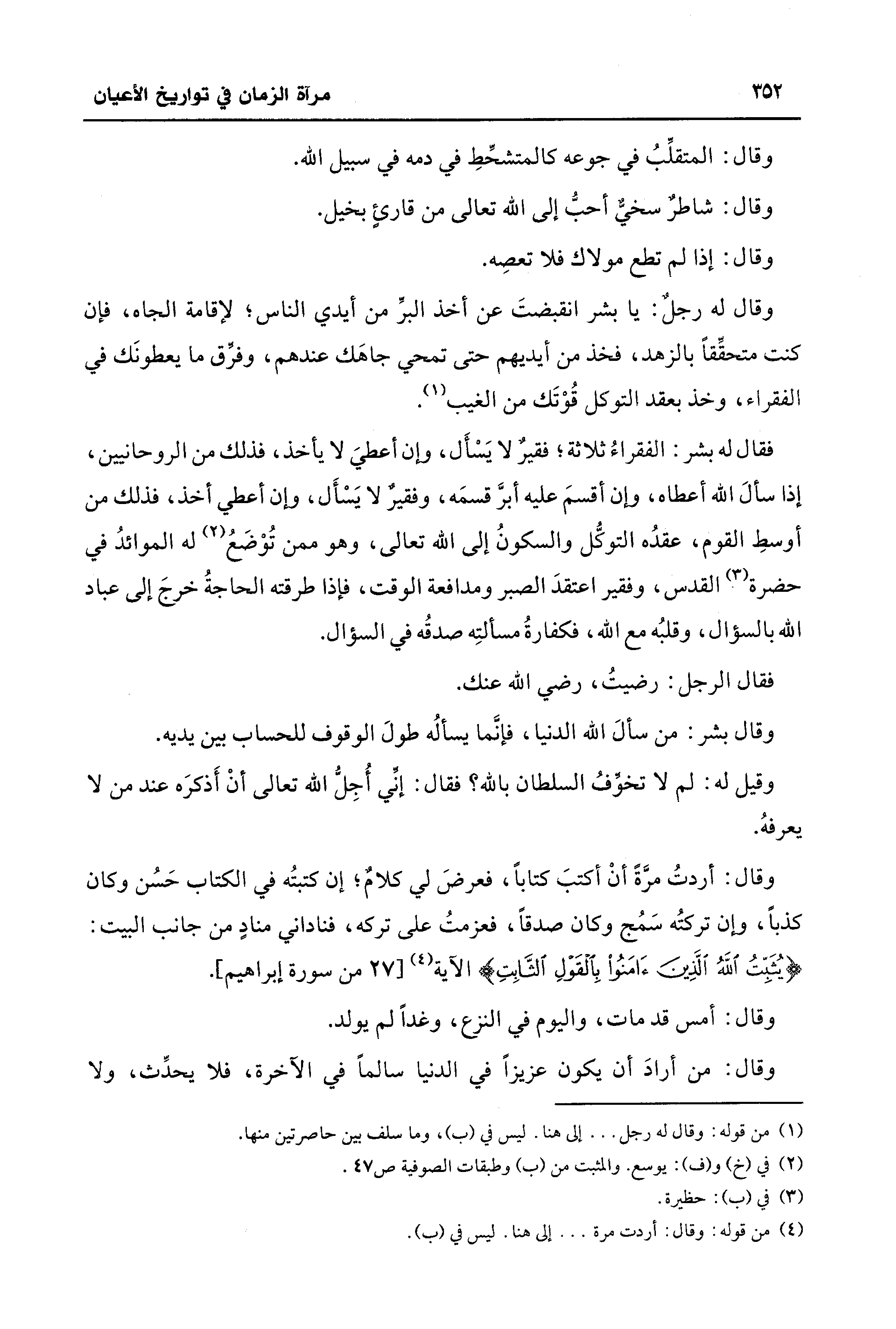 وقال له رجل: يا بشر انقبضتَ عن أخذ البرِّ من أيدي الناس؛ لإقامة الجاه، فإن كنت متحقِّقًا بالزهد، فخذ من أيديهم حتى تمحي جاهَك عندهم، وفرّق ما يعطونَك في الفقراء، وخذ بعقد التوكل قُوْتَك من الغيب (¬1).