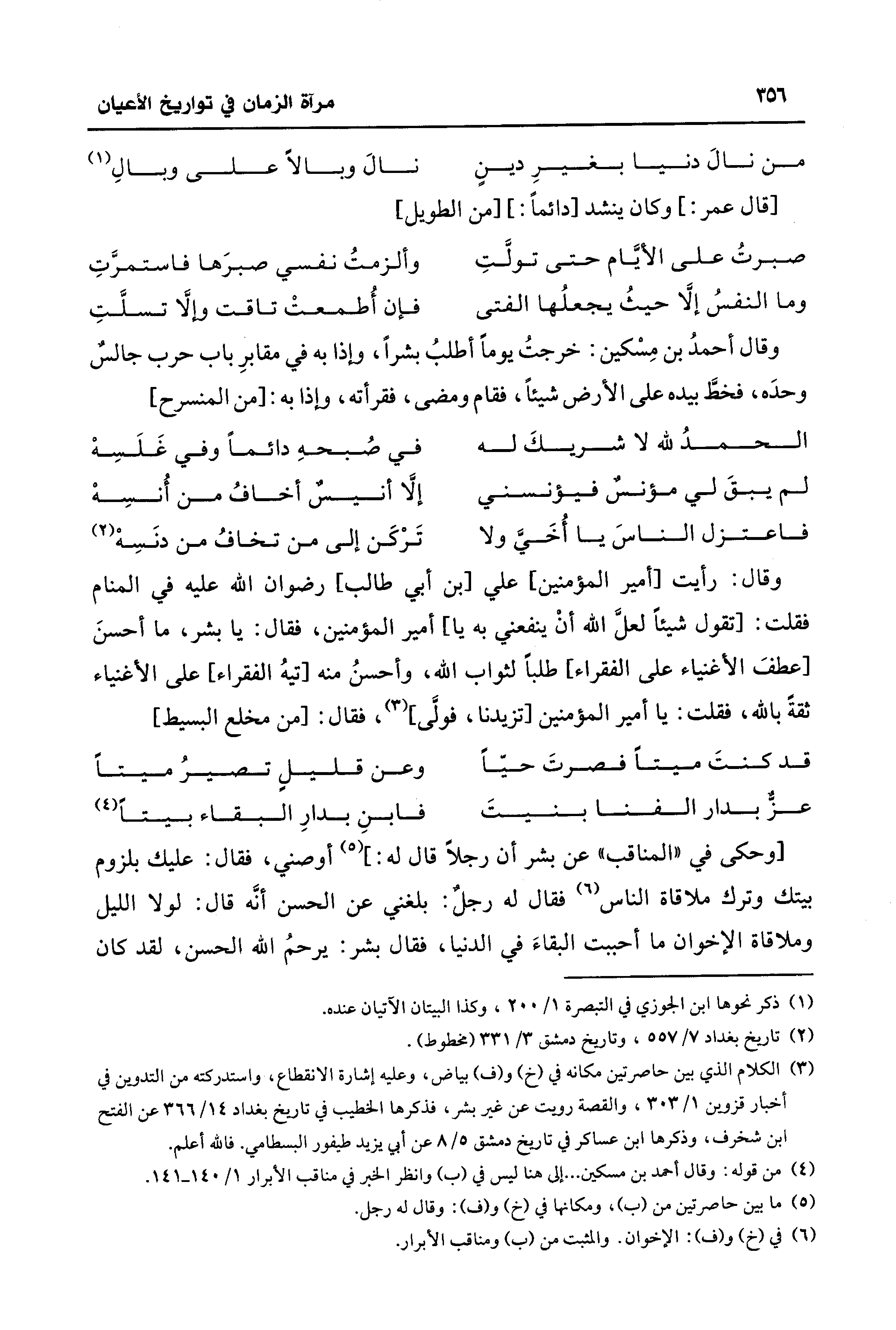وقال: رأيت [أمير المؤمنين] علي [بن أبي طالب] رضوان الله عليه في المنام فقلت: [تقول شيئًا لعل الله أنْ ينفعني به يا] أمير المؤمنين، فقال: يا بشر، ما أحسنَ [عطفَ الأغنياء على الفقراء] طلبًا لثواب الله، وأحسنُ منه [تيهُ الفقراء] على الأغنياء ثقةً بالله، فقلت: يا أمير المؤمنين [تزيدنا، فولى] (¬3)، فقال: [من مخلع البسيط]