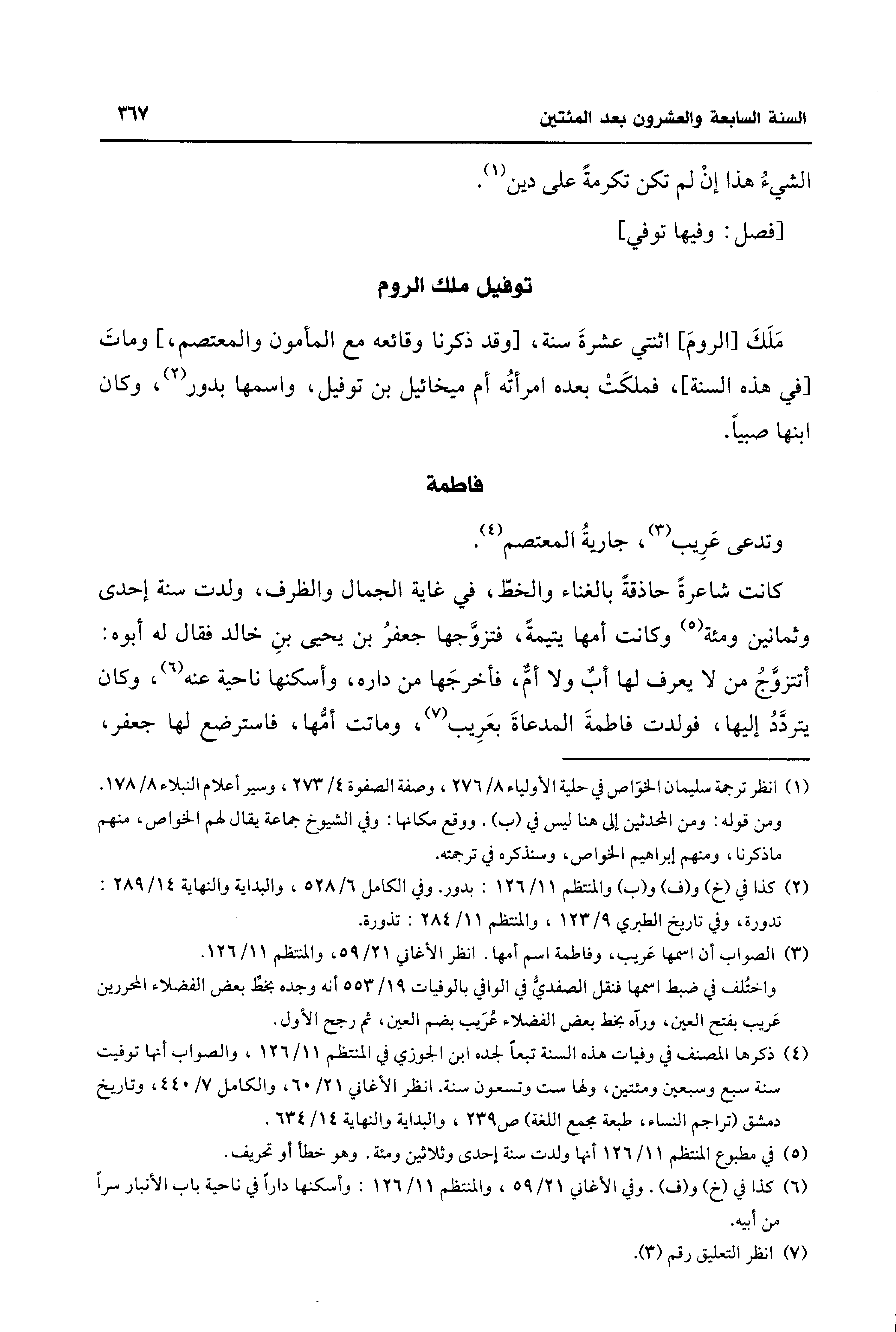 (¬4) ذكرها المصنف في وفيات هذه السنة تبعًا لجده ابن الجوزي في المنتظم 11/ 126، والصواب أنها توفيت سنة سبع وسبعين ومئتين، ولها ست وتسعون سنة. انظر الأغاني 21/ 60، والكامل 7/ 440، وتاريخ دمشق (تراجم النساء، طبعة مجمع اللغة) ص 239، والبداية والنهاية 14/ 634.
