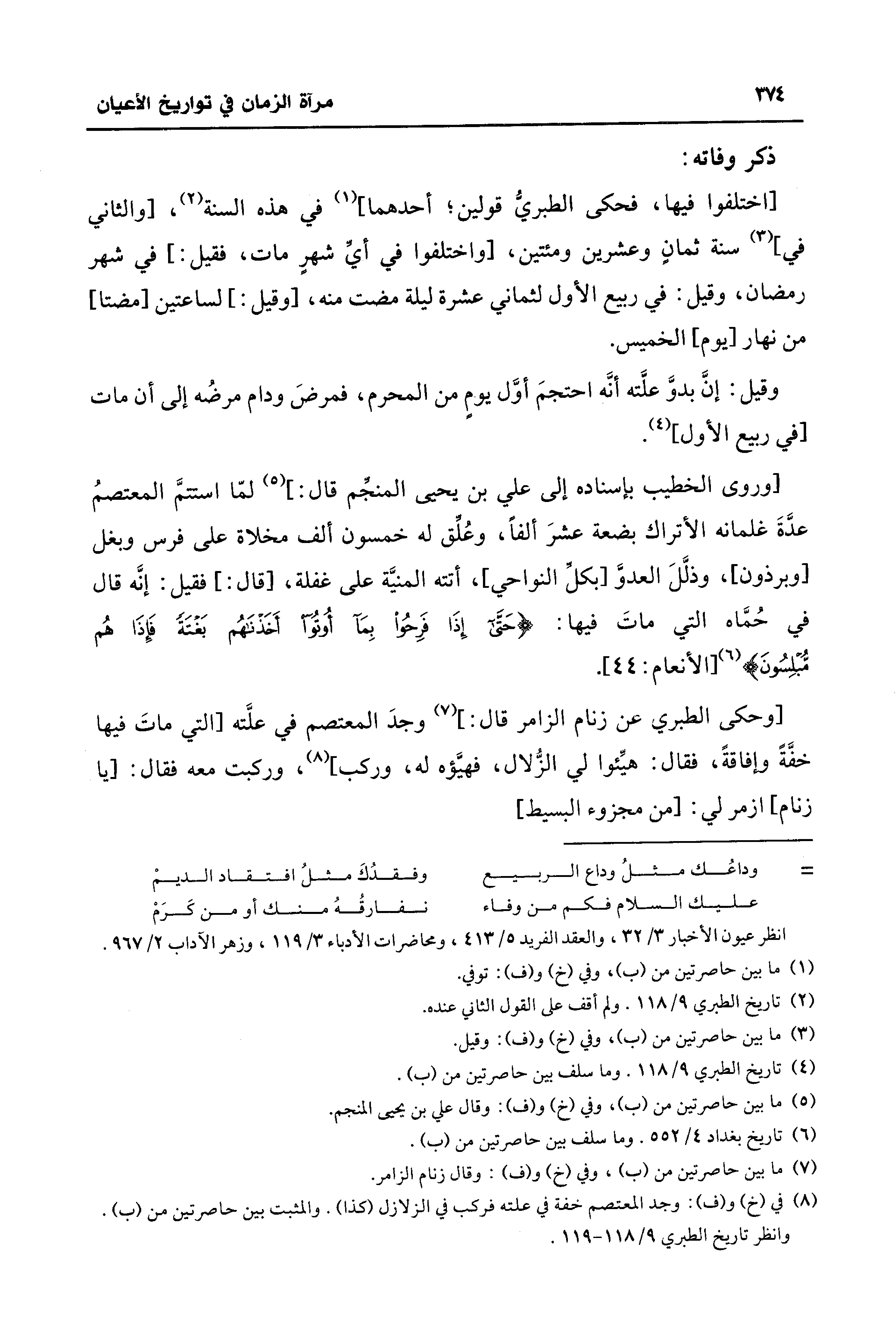 [وحكى الطبريّ عن زنام الزامر قال: ] (¬7) وجدَ المعتصم في علَّته [التي ماتَ فيها خفَّةً وإفاقةً، فقال: هيِّئوا لي الزُّلال، فهيَّؤه له، وركب] (¬8)، وركبت معه فقال: [يا زنام] ازمر لي: [من مجزوء البسيط]