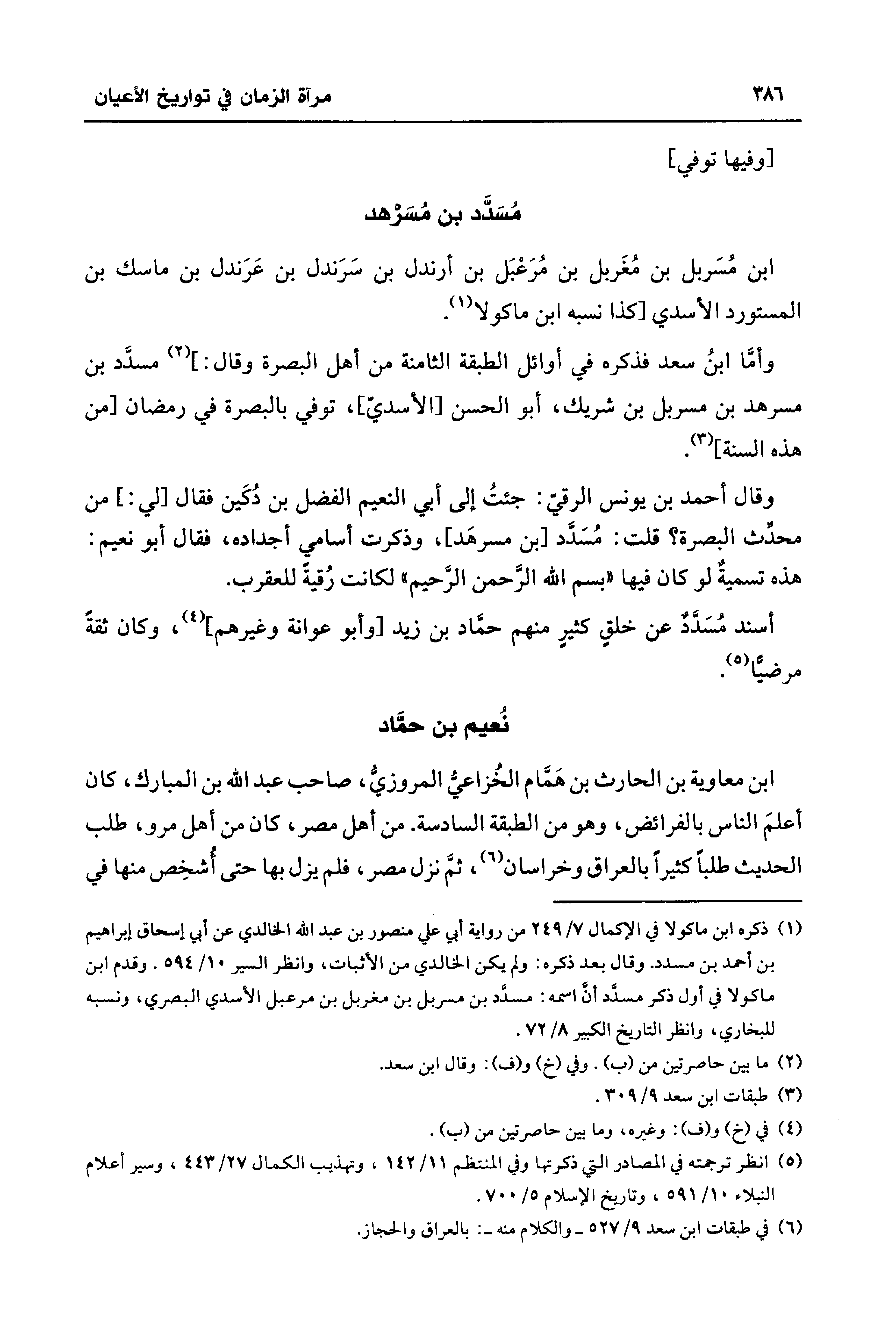 وأمَّا ابنُ سعد فذكره في أوائل الطبقة الثامنة من أهل البصرة وقال: ] (¬2) مسدَّد بن مسرهد بن مسربل بن شريك، أبو الحسن [الأسديّ]، توفي بالبصرة في رمضان [من هذه السنة] (¬3).