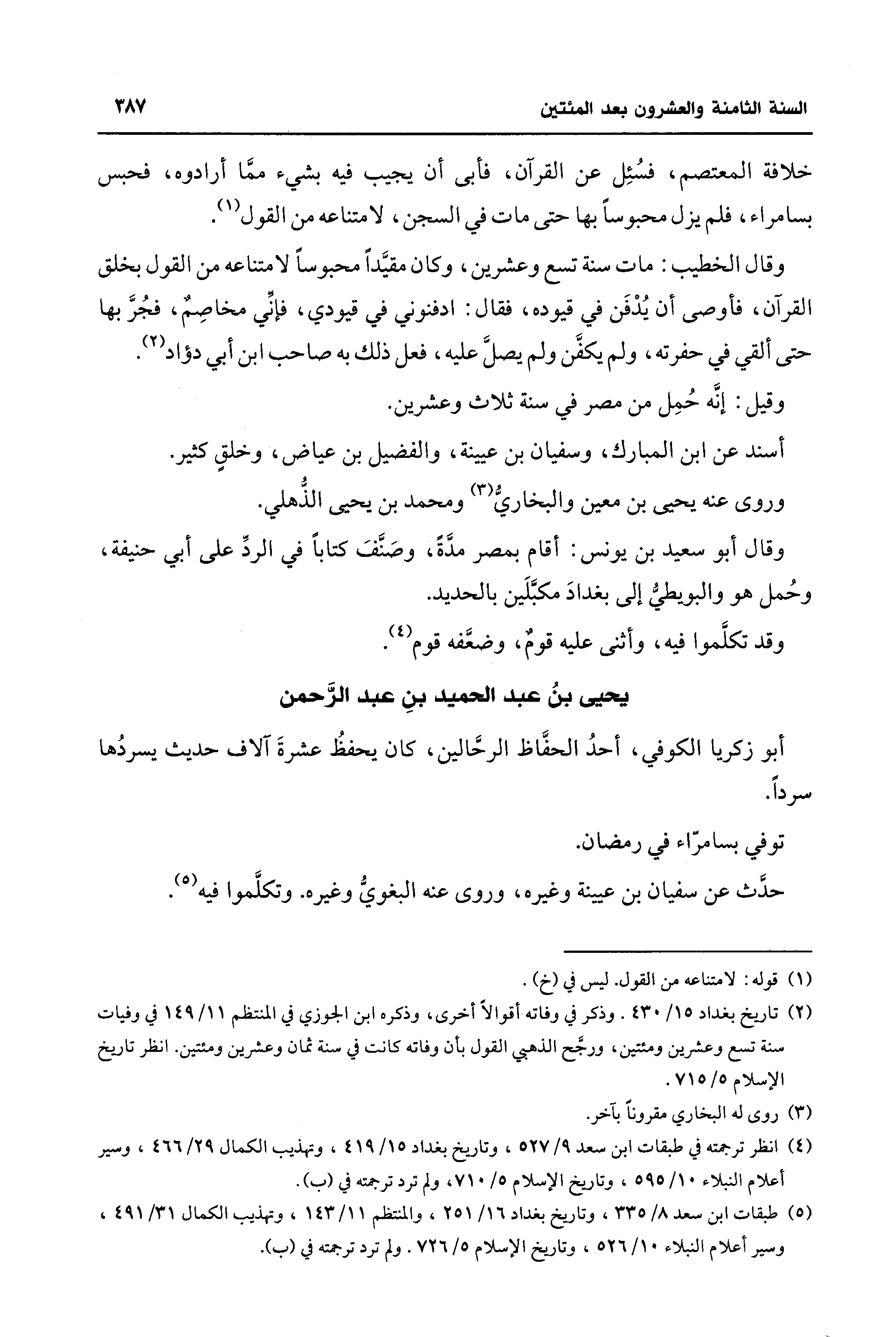 (¬2) تاريخ بغداد 15/ 430. وذكر في وفاته أقوالًا أخرى، وذكره ابن الجوزي في المنتظم 11/ 149 في وفيات سنة تسع وعشرين ومئتين، ورجَّح الذهبي القول بأن وفاته كانت في سنة ثمان وعشرين ومئتين. انظر تاريخ الإسلام 5/ 715.