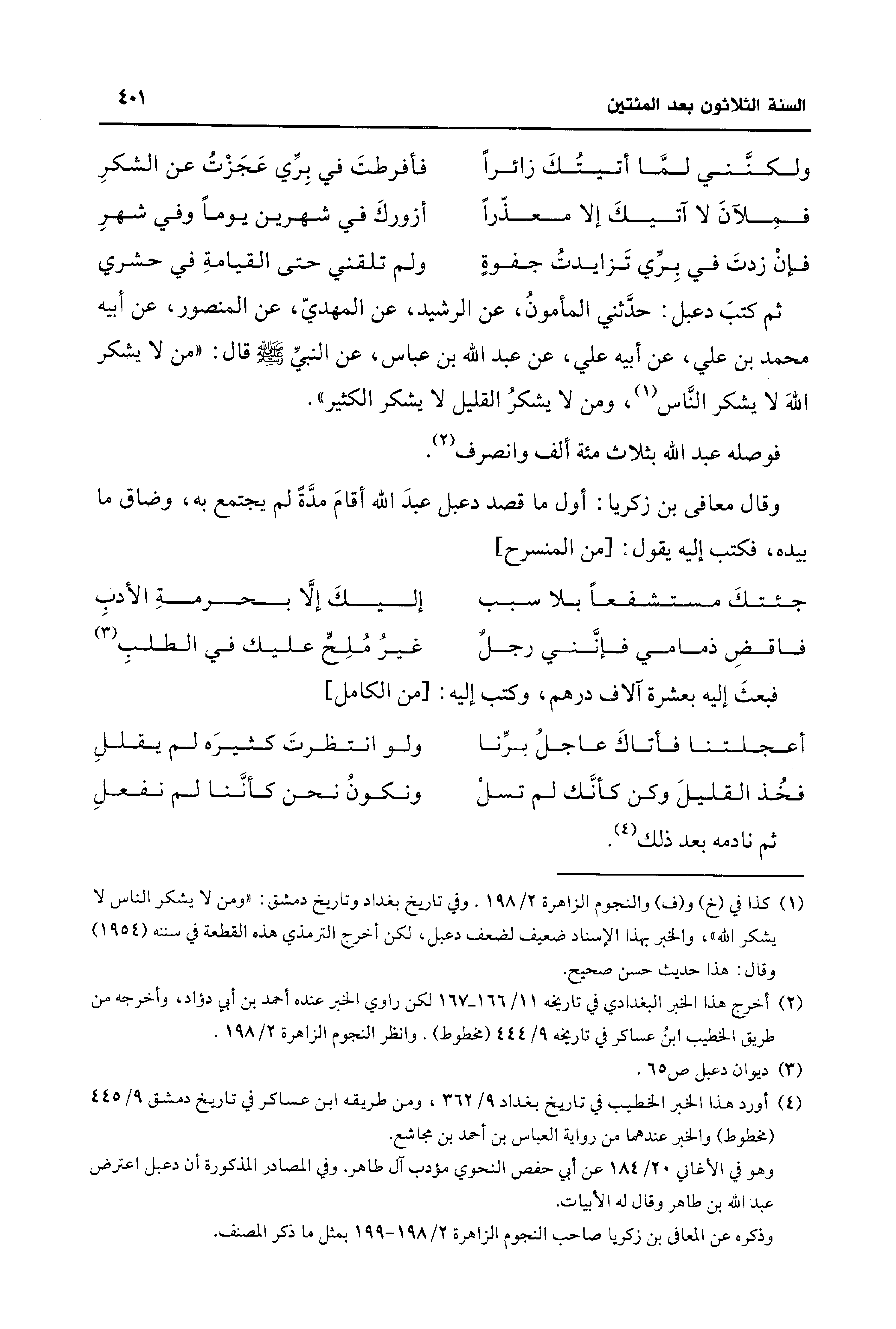 ثم كتبَ دعبل: حدَّثني المأمونُ، عن الرشيد، عن المهديّ، عن المنصور، عن أبيه محمد بن علي، عن أبيه علي، عن عبد الله بن عباس، عن النبيِّ - صلى الله عليه وسلم - قال: "من لا يشكر اللهَ لا يشكر النَّاس (¬1)، ومن لا يشكرُ القليل لا يشكر الكثير".