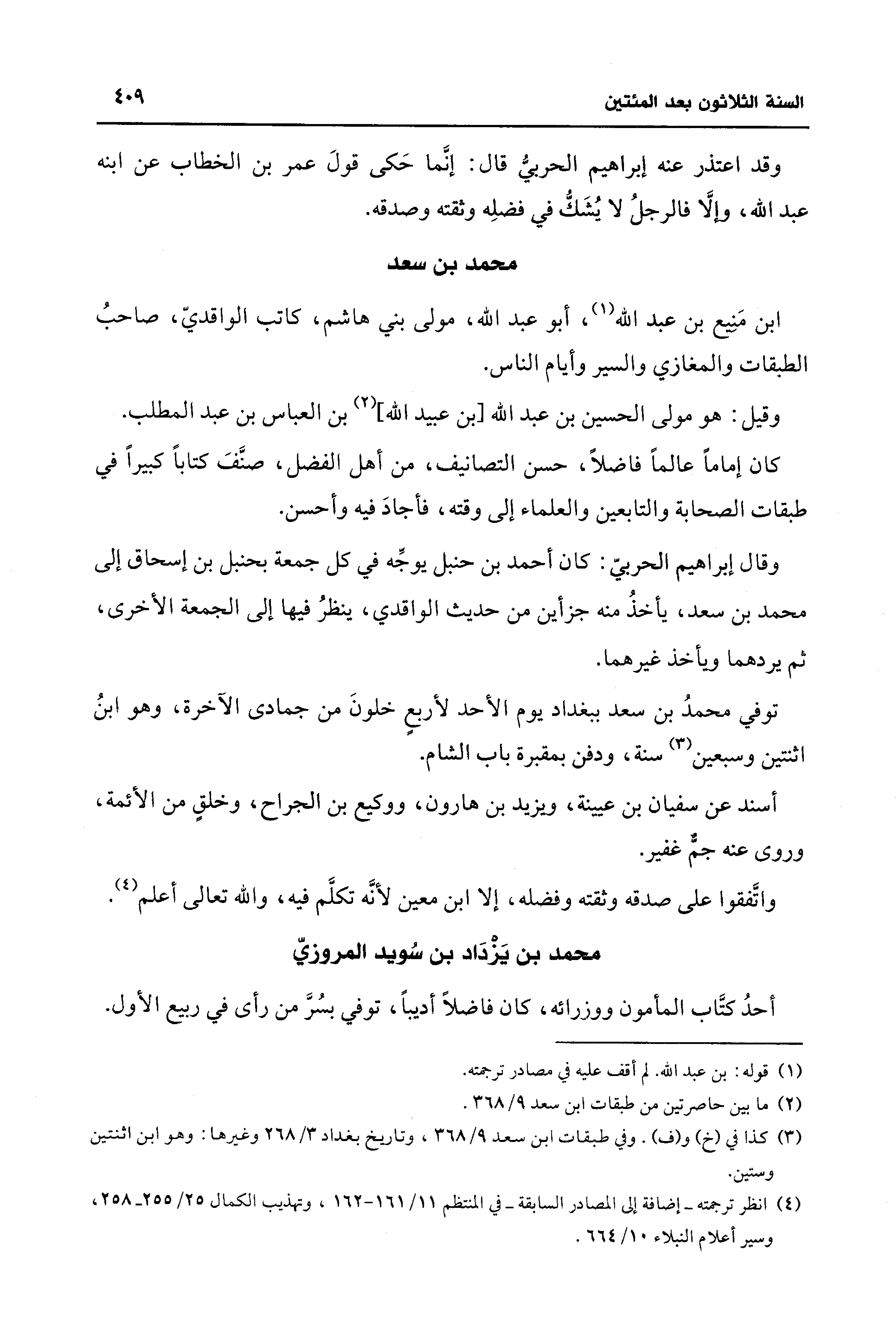 وقال إبراهيم الحربيّ: كان أحمد بن حنبل يوجِّه في كل جمعة بحنبل بن إسحاق إلى محمد بن سعد، يأخذُ منه جزأين من حديث الواقدي، ينظرُ فيها إلى الجمعة الأخرى، ثم يردهما ويأخذ غيرهما.