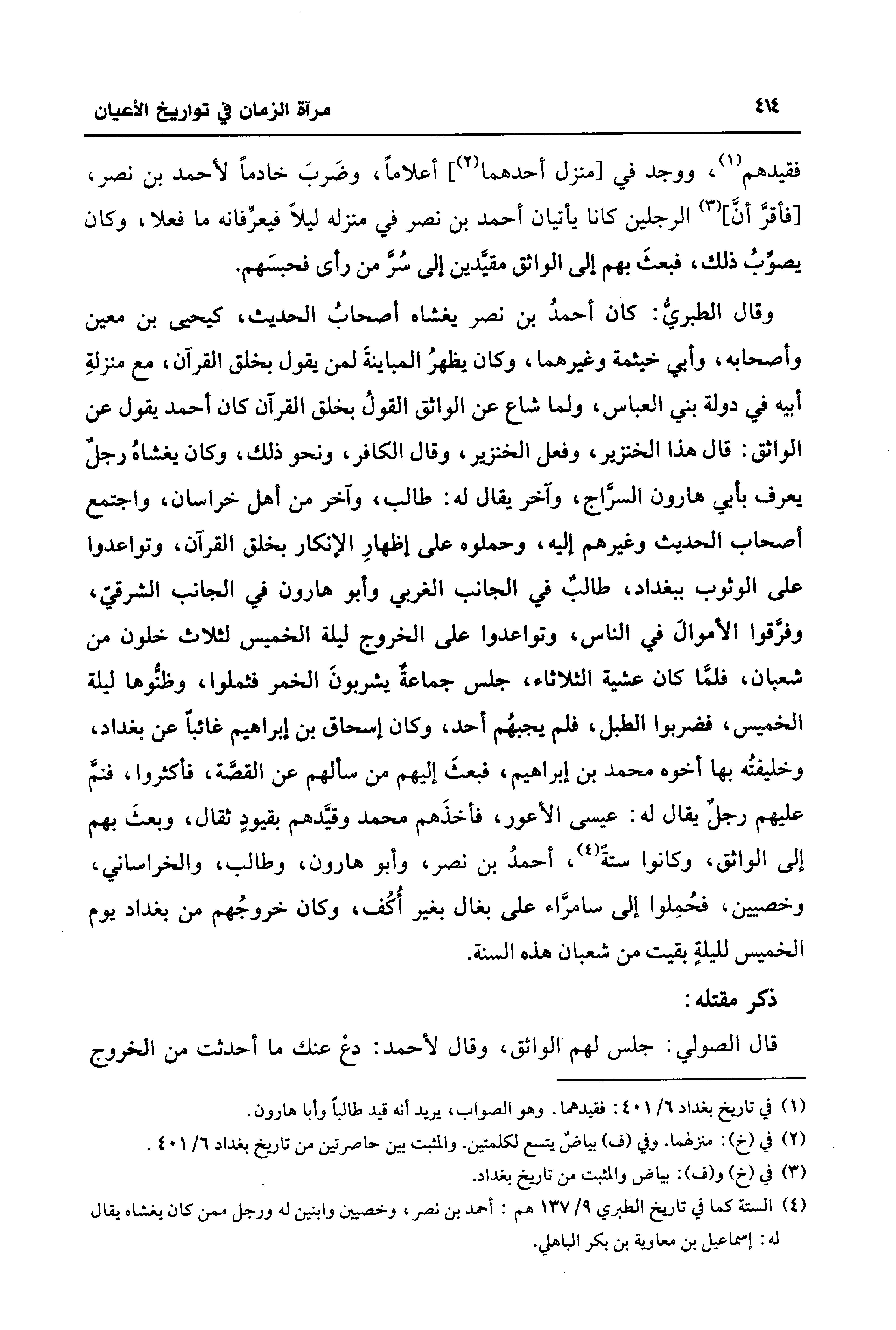 (¬4) الستة كما في تاريخ الطبري 9/ 137 هم: أحمد بن نصر، وخصيين وابنين له ورجل ممن كان يغشاه يقال له: إسماعيل بن معاوية بن بكر الباهلي.