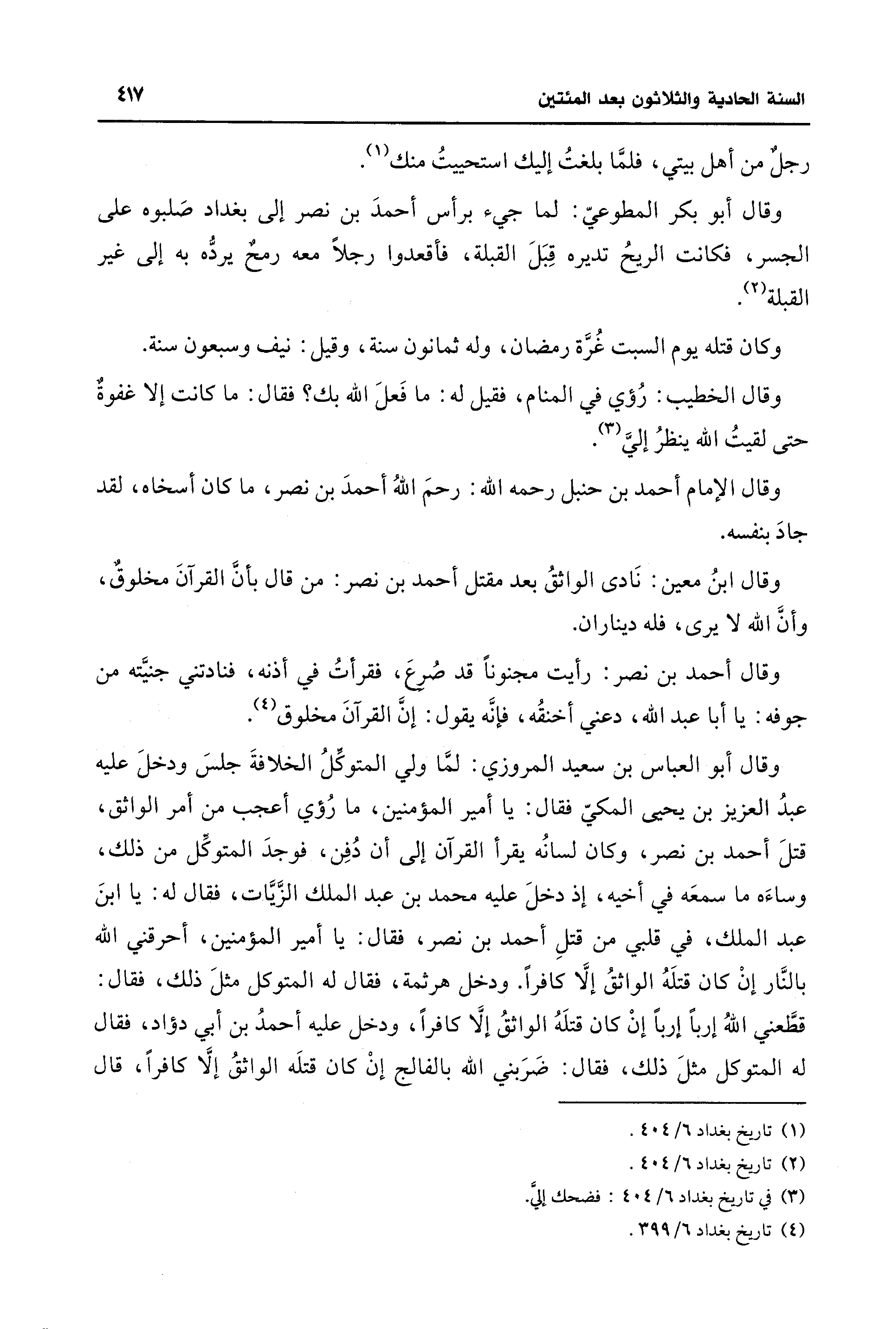 وقال ابنُ معين: نَادى الواثقُ بعد مقتل أحمد بن نصر: من قال بأنَّ القرآنَ مخلوقٌ، وأنَّ الله لا يرى، فله ديناران.