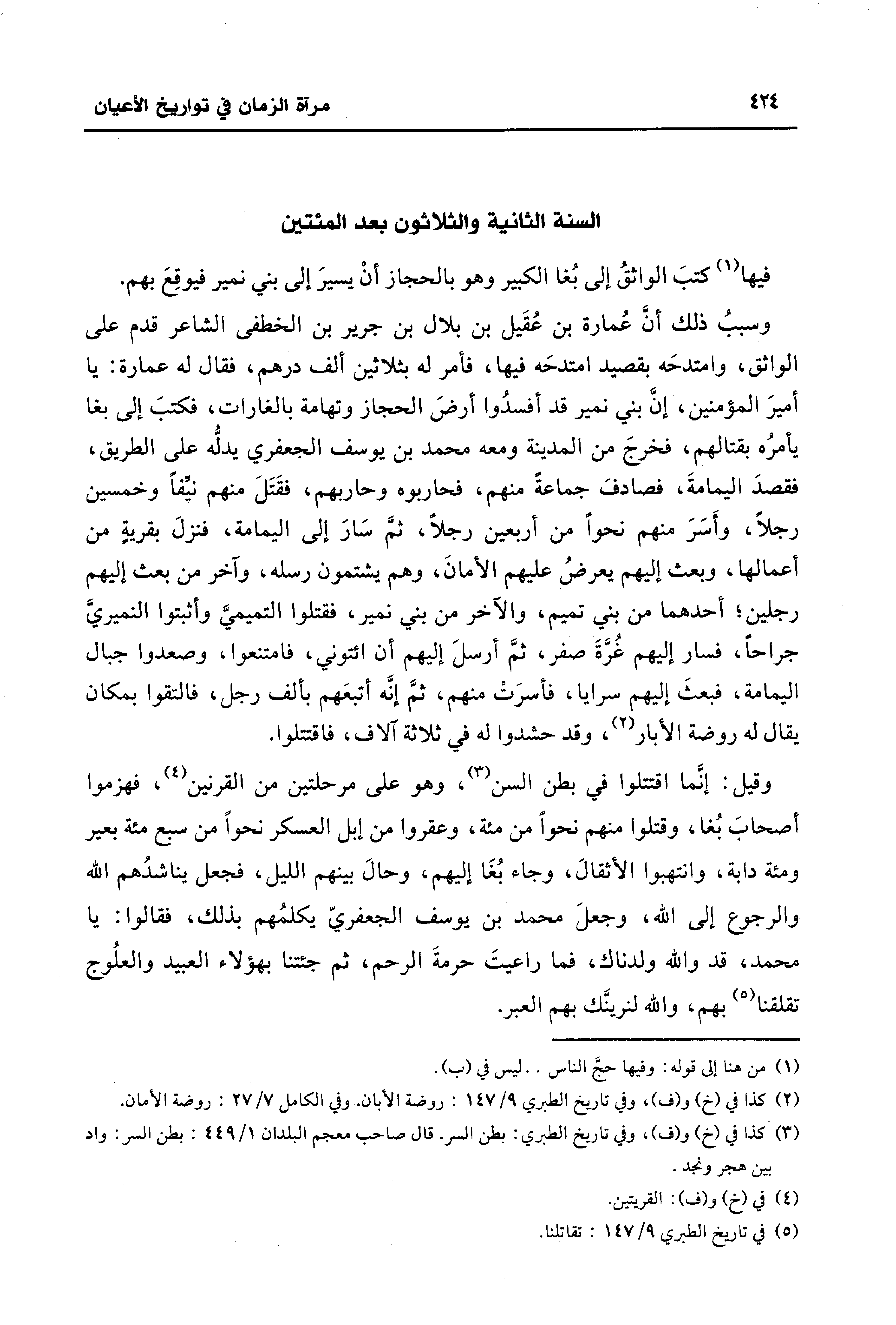 وسببُ ذلك أنَّ عُمارة بن عُقَيل بن بلال بن جرير بن الخطفى الشاعر قدم على الواثق، وامتدحَه بقصيد امتدحَه فيها، فأمر له بثلاثين ألف درهم، فقال له عمارة: يا أميرَ المؤمنين، إنَّ بني نمير قد أفسدُوا أرضَ الحجاز وتهامة بالغارات، فكتبَ إلى بغا يأمرُه بقتالهم، فخرجَ من المدينة ومعه محمد بن يوسف الجعفري يدلُّه على الطريق، فقصدَ اليمامةَ، فصادفَ جماعةً منهم، فحاربوه وحاربهم، فقَتَلَ منهم نيِّفًا وخمسين رجلًا، وأَسَرَ منهم نحوًا من أربعين رجلًا، ثمَّ سَارَ إلى اليمامة، فنزلَ بقريةٍ من أعمالها، وبعث إليهم يعرضُ عليهم الأمانَ، وهم يشتمون رسله، وآخر من بعث إليهم رجلين؛ أحدهما من بني تميم، والآخر من بني نمير، فقتلوا التميميَّ وأثبتوا النميريَّ جراحًا، فسار إليهم غُرَّةَ صفر، ثمَّ أرسلَ إليهم أن ائتوني، فامتنعوا، وصعدوا جبال اليمامة، فبعثَ إليهم سرايا، فأسرَتْ منهم، ثمَّ إنَّه أتبعَهم بألف رجل، فالتقوا بمكان يقال له روضة الأبار (¬2)، وقد حشدوا له في ثلاثة آلاف، فاقتتلوا.
